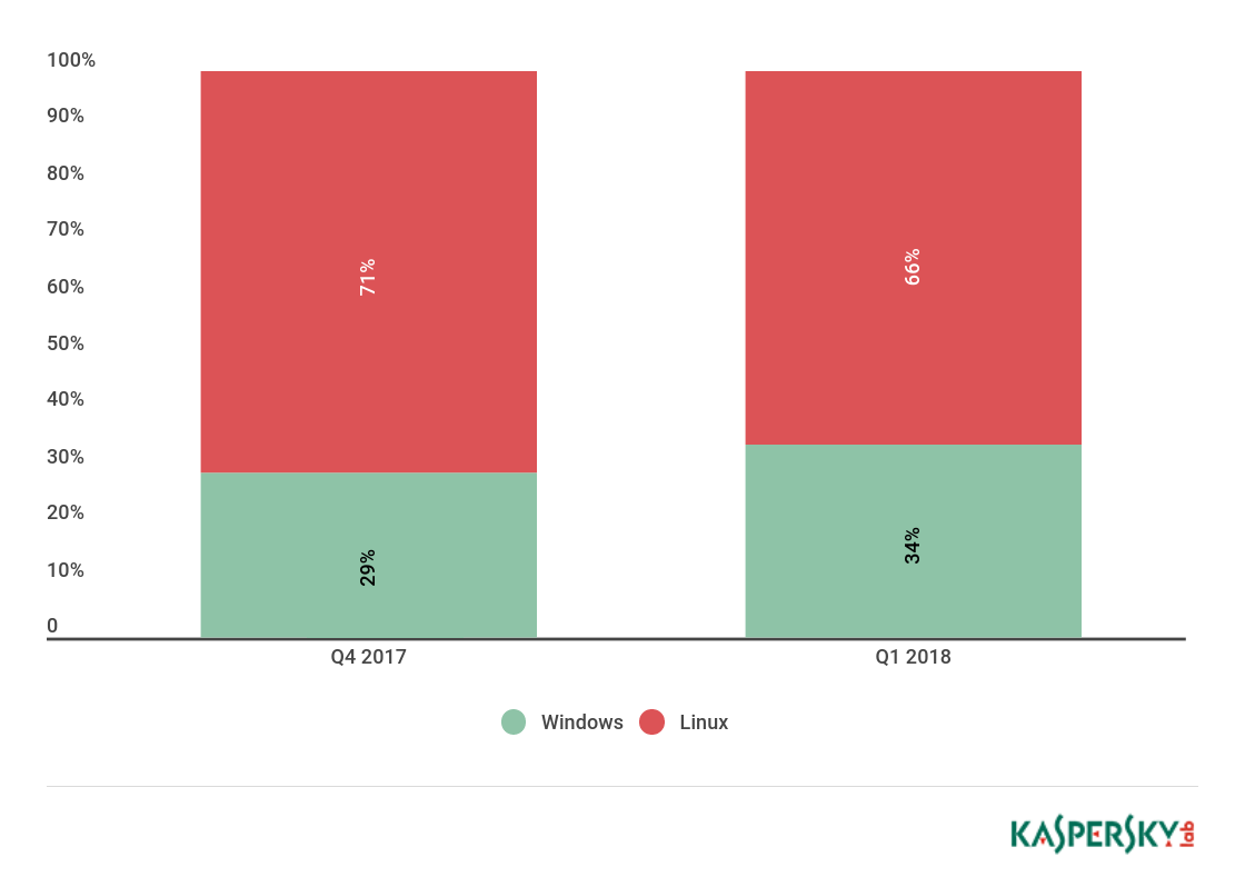 Linux僵尸网络的份额稍有下降,达到66%,而上一季度是71%。