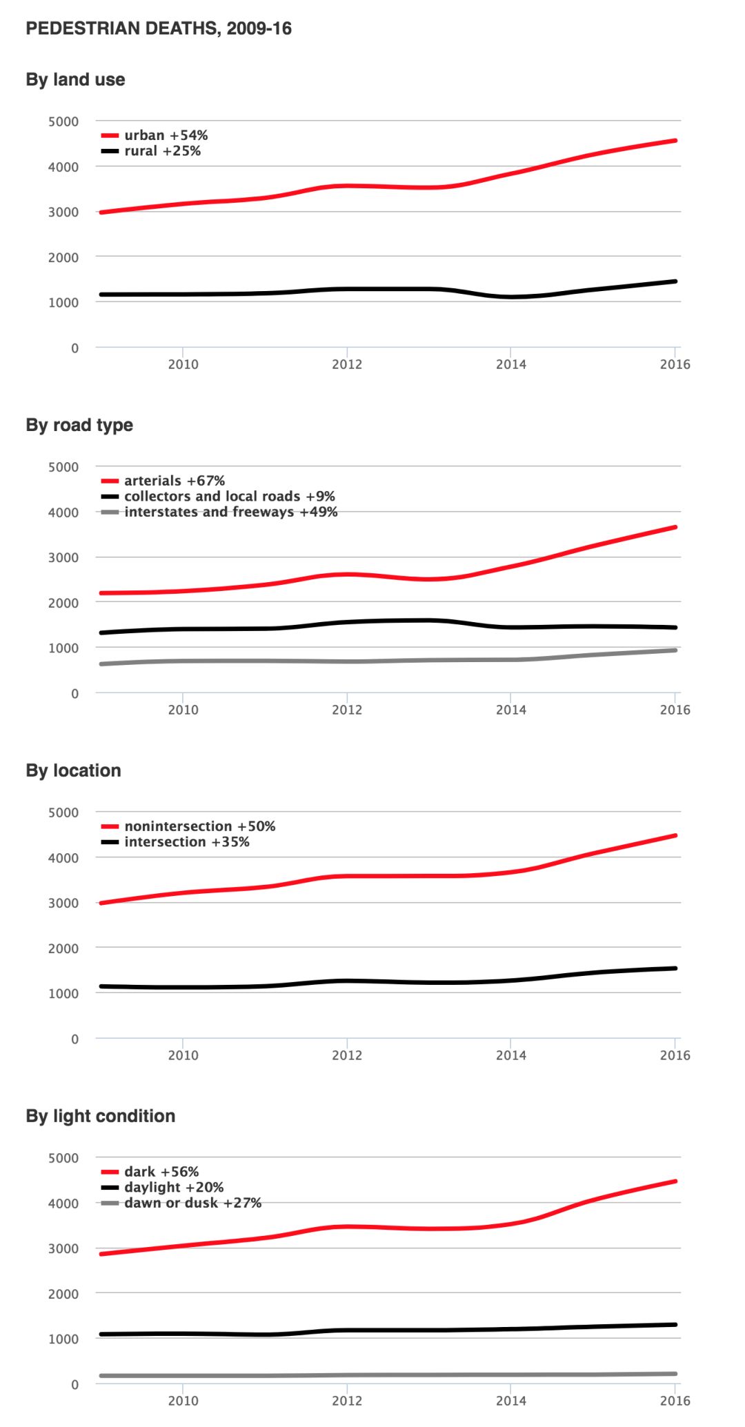 调查显示,城市地区行人死亡人数增加了54%,死因包括:在主干道上被撞67%,在非交叉路口被撞50%,在黑暗中被撞56%。而导致这些悲剧的原因可能是没有足够的人行道、能见度差或对行人权利的无知。人们为了避免行走更长距离,通常选择不走人行横道,而非正常运作的交通灯和超速驾驶的司机人数也在增加。