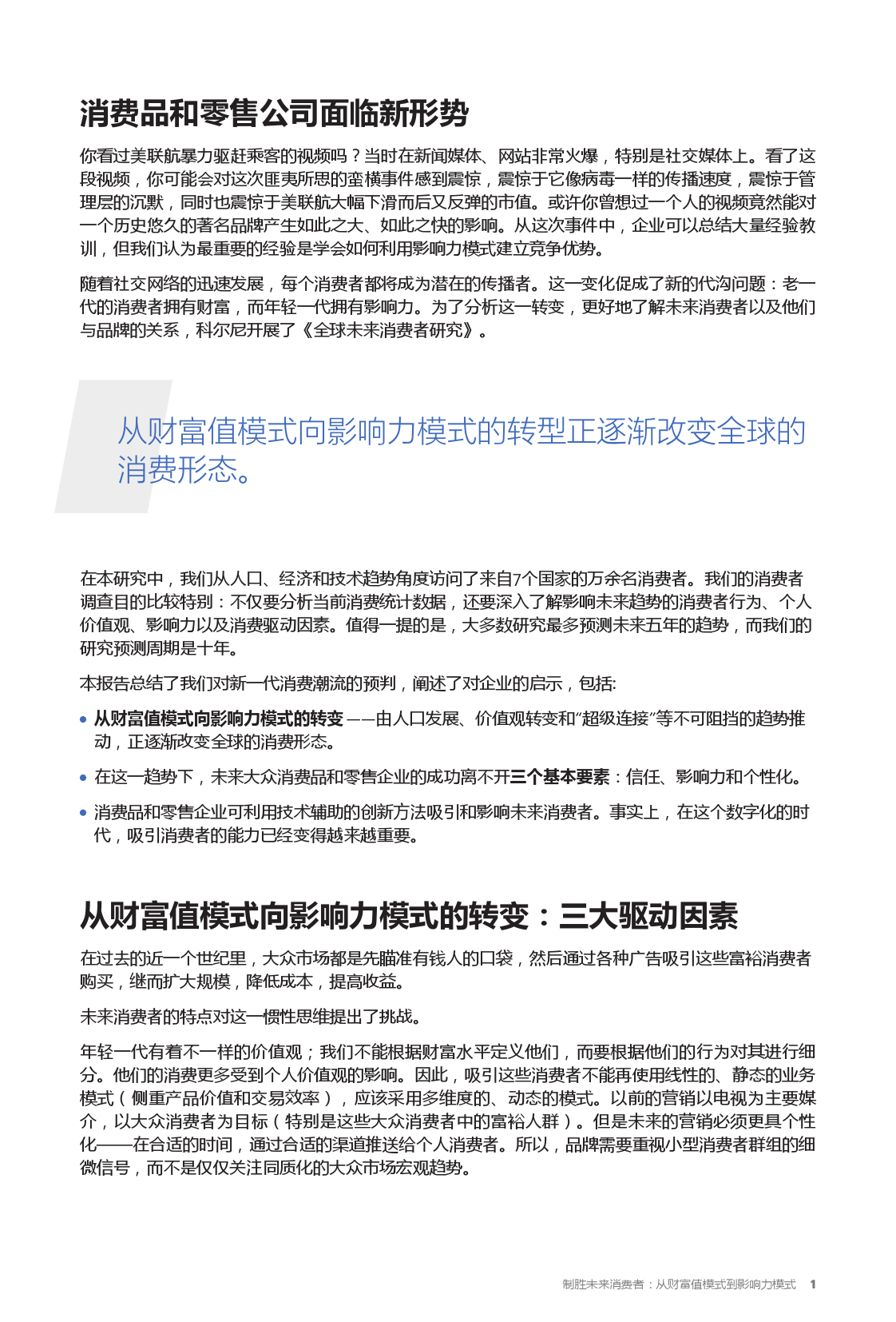 随着社交网络的迅速发展,每个消费者都将成为潜在的传播者。这一变化促成了新的代沟问题:老一代的消费者拥有财富,而年轻一代拥有影响力。为了分析这一转变,更好地了解未来消费者以及他们与品牌的关系,科尔尼开展了《全球未来消费者研究》。