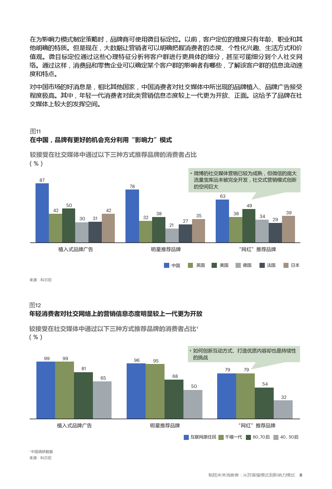 对中国市场的好消息是,相比其他国家,中国消费者对社交媒体中所出现的品牌植入、品牌广告接受程度极高。其中,年轻一代消费者对此类营销信息态度较上一代更为开放、正面。这给予了品牌在社交媒体上较大的发挥空间。