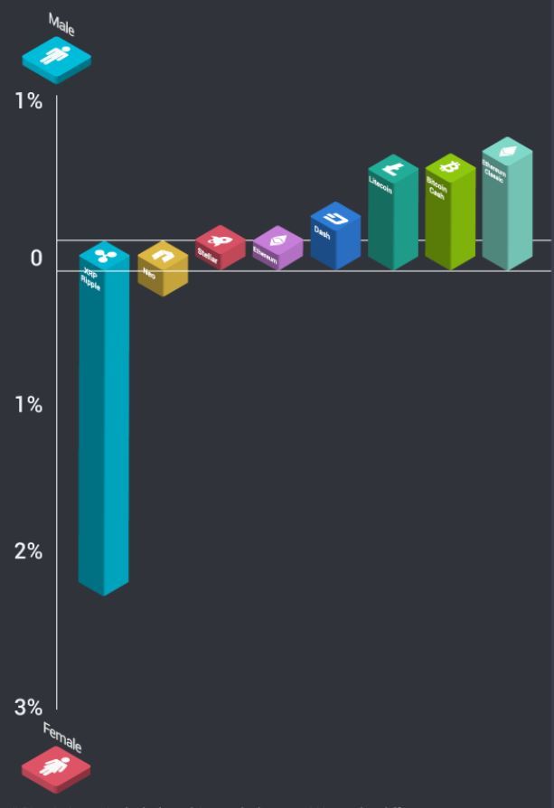 研究还表明,在加密货币币种投资选择上,也存在一些性别差异。除BTC之间的性别差异为0%外,XRP、ETC、ETC,BCH和LTC等数字货币均受到性别影响。Ripple的XRP交易者中,女性占比明显高于男性;ETC,BCH和LTC的交易者一直是男性群体占主导。对此, Etoro Mati Greenspan 的高级市场分析师在给投资者的一份报告中,用清晰的“女性青睐Ripple”的图表来总结这一发现。