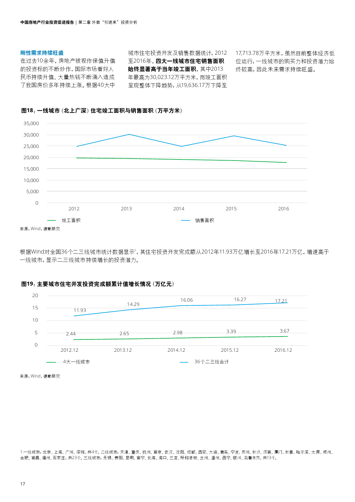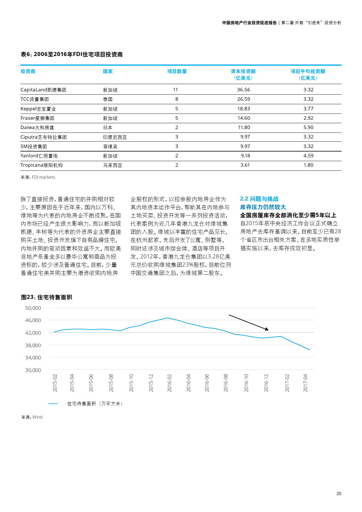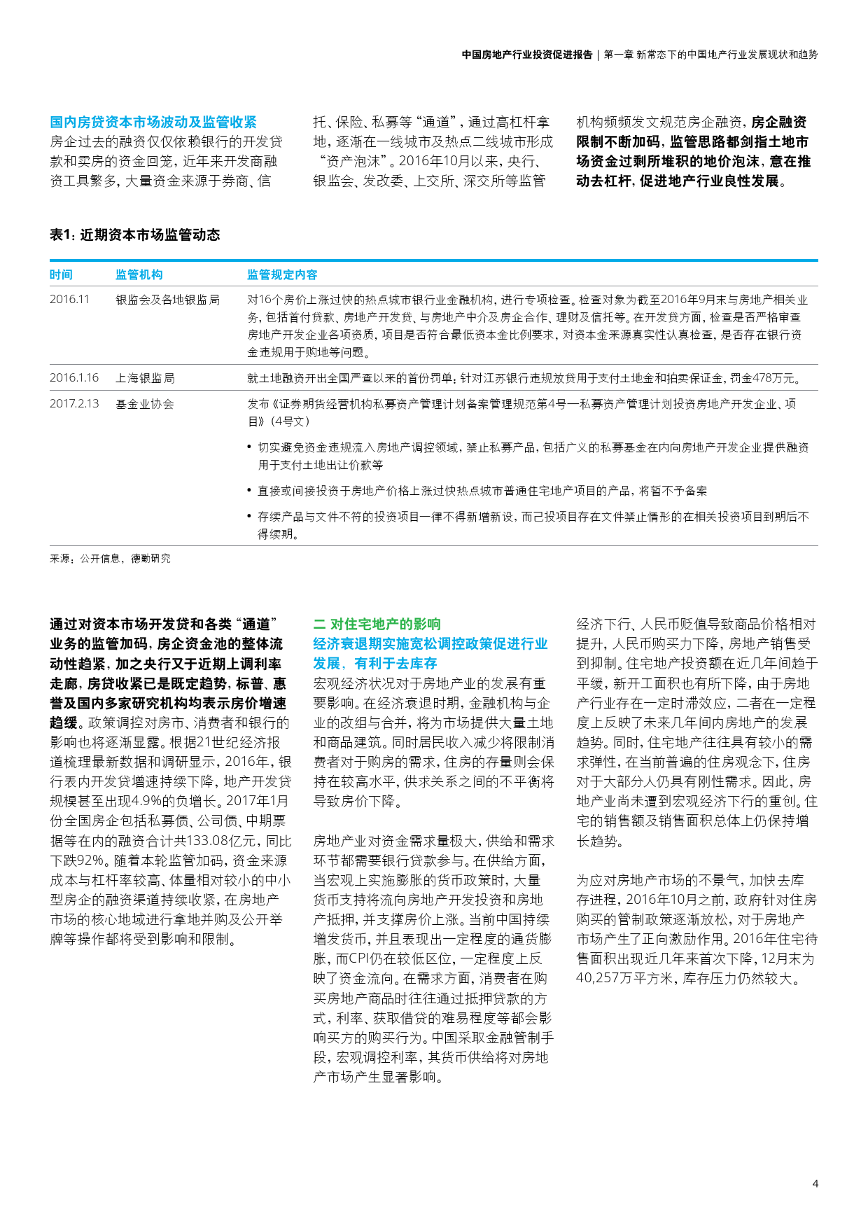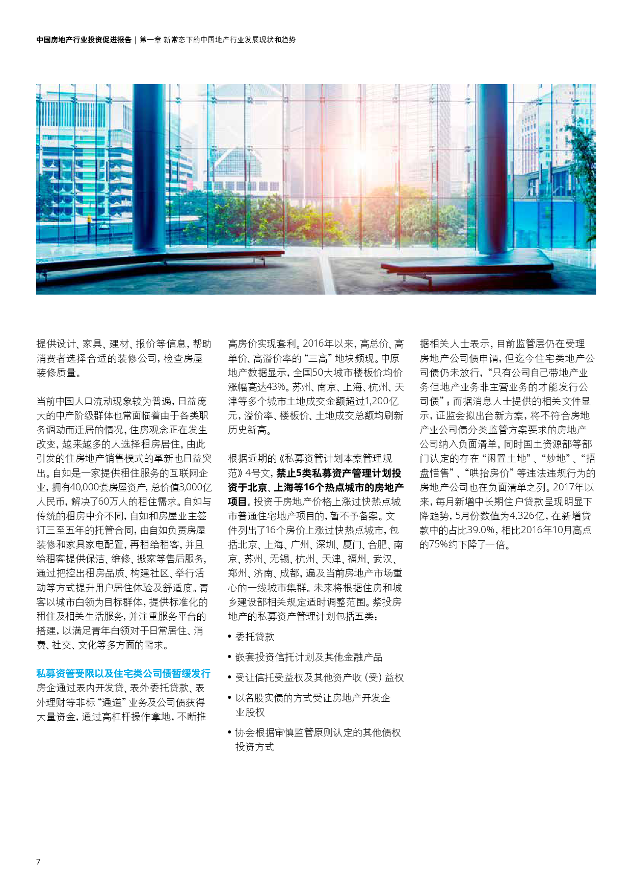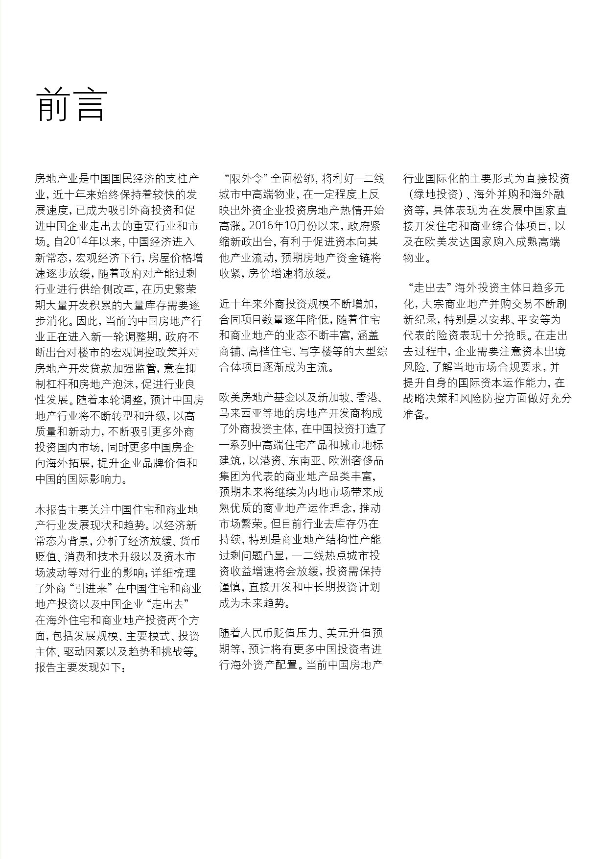 房地产业是中国国民经济的支柱产业,近十年来始终保持着较快的发展速度,已成为吸引外商投资和促进中国企业走出去的重要行业和市场。自2014年以来,中国经济进入新常态,宏观经济下行,房屋价格增速逐步放缓,随着政府对产能过剩行业进行供给侧改革,在历史繁荣期大量开发积累的库存需要逐步消化。因此,当前的中国房地产行业正在进入新一轮调整期,政府不断出台对楼市的宏观调控政策并对房地产开发贷款加强监管,意在抑制杠杆和房地产泡沫,促进行业良性发展。报告主要发现如下: