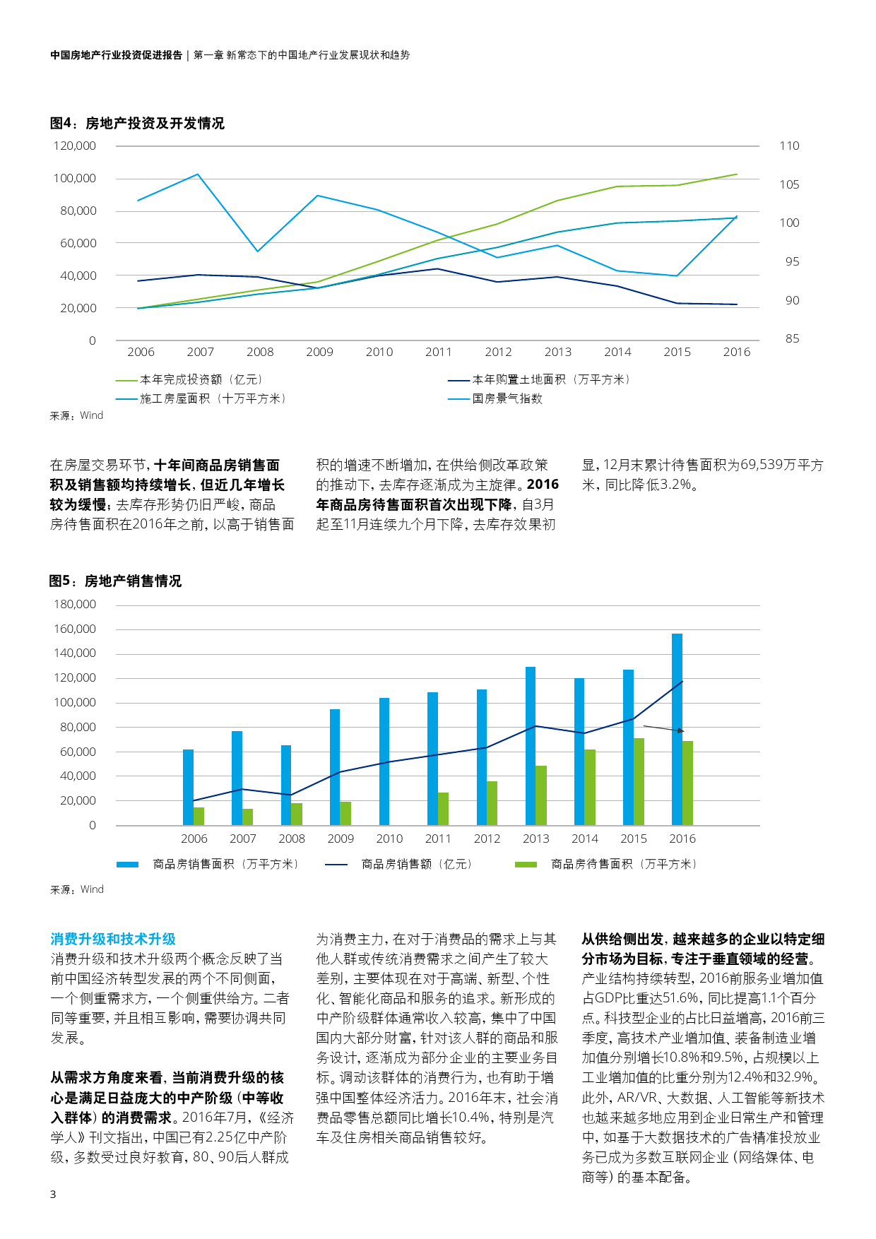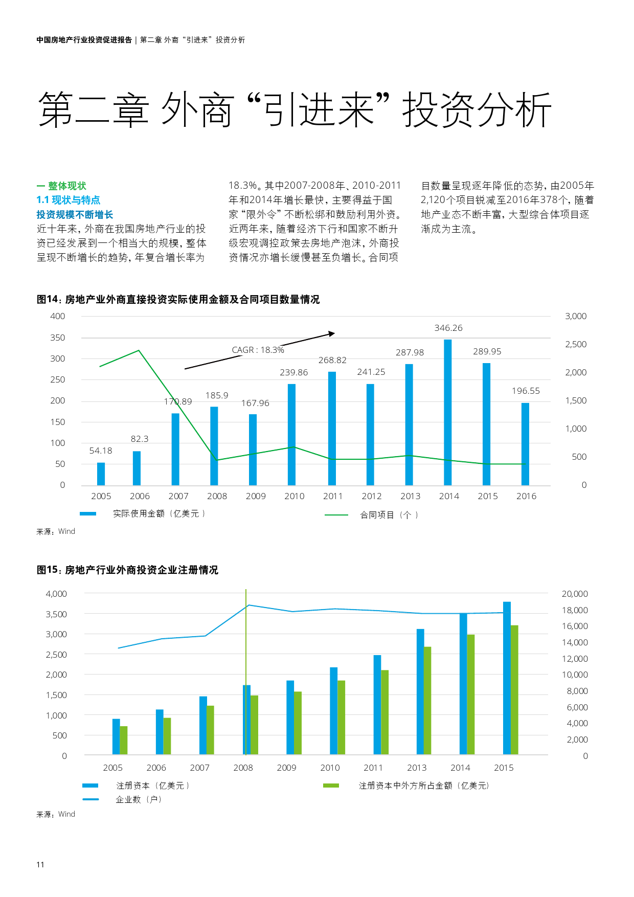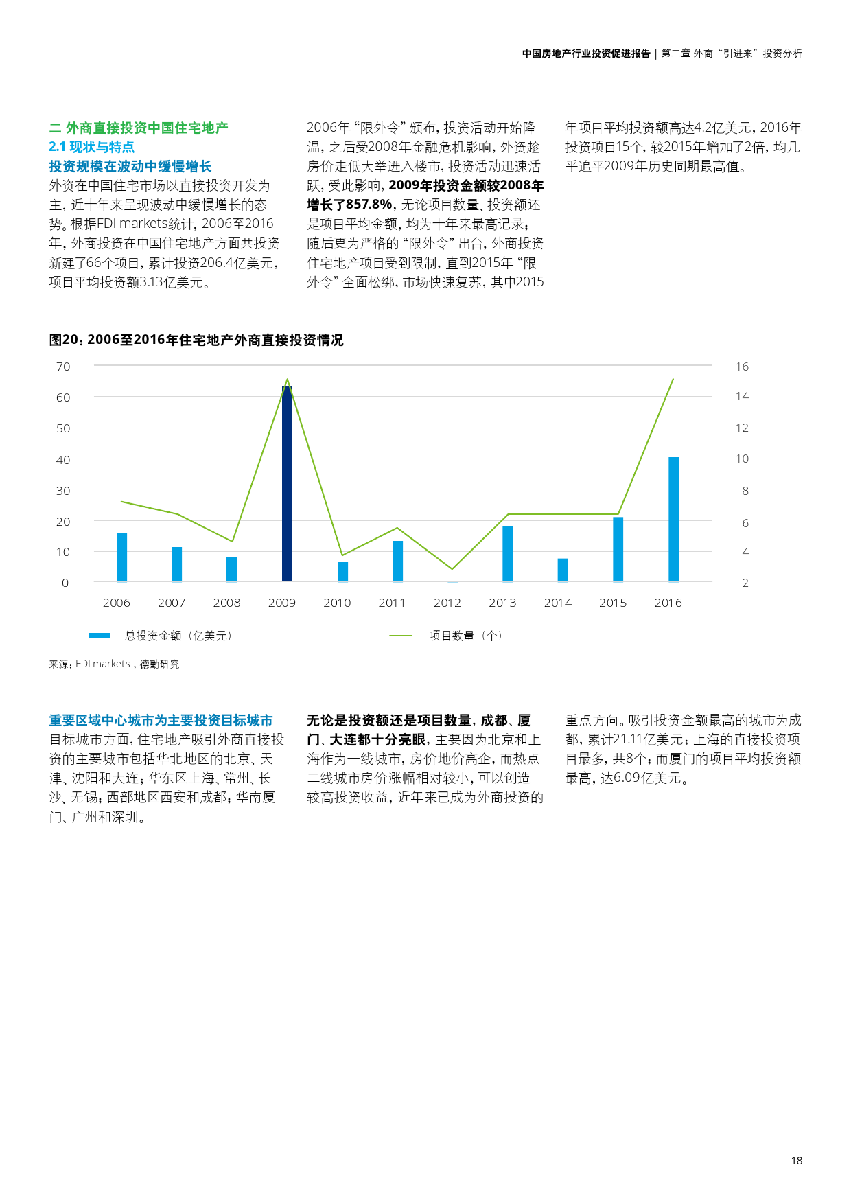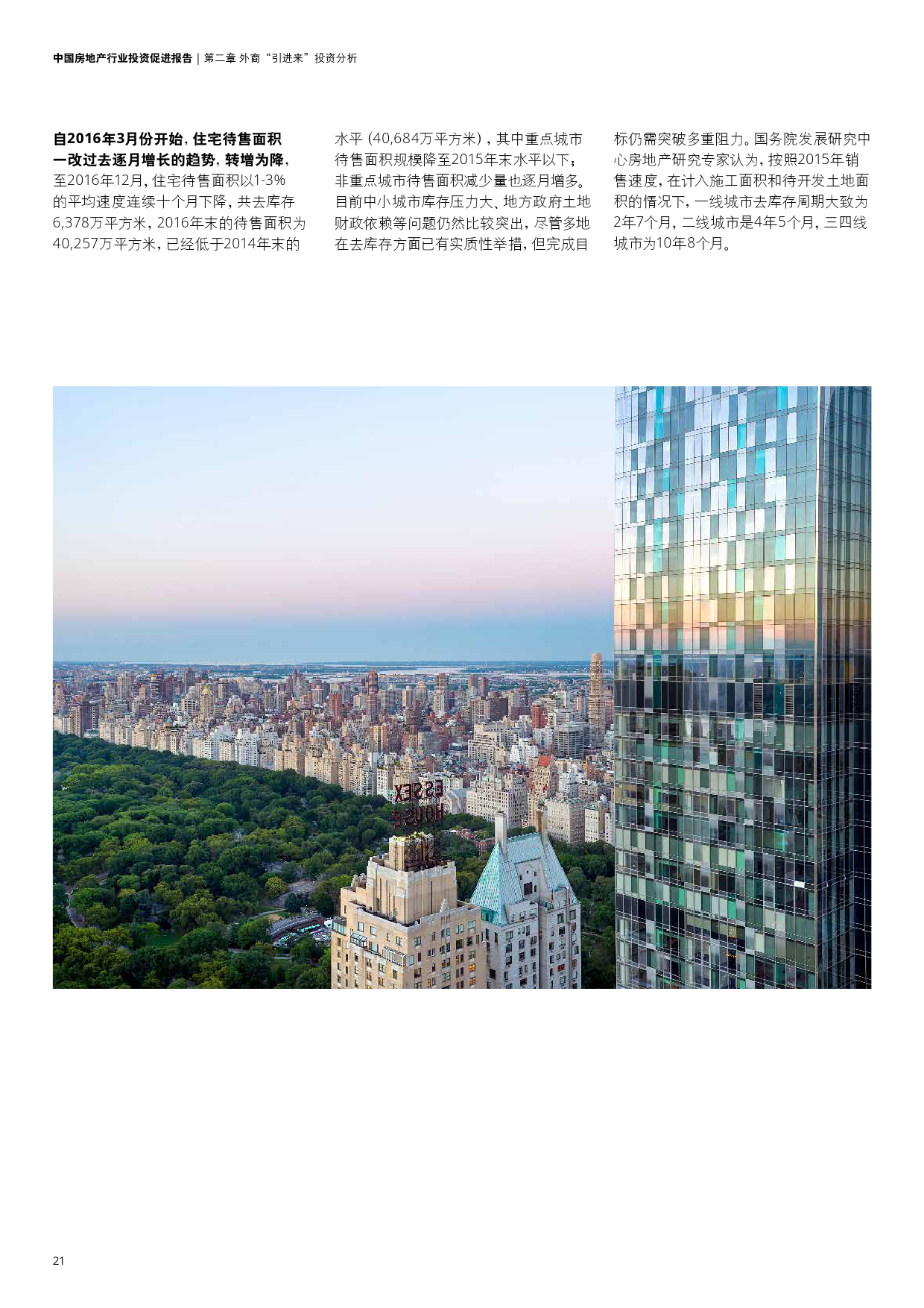 房地产业是中国国民经济的支柱产业,近十年来始终保持着较快的发展速度,已成为吸引外商投资和促进中国企业走出去的重要行业和市场。自2014年以来,中国经济进入新常态,宏观经济下行,房屋价格增速逐步放缓,随着政府对产能过剩行业进行供给侧改革,在历史繁荣期大量开发积累的库存需要逐步消化。因此,当前的中国房地产行业正在进入新一轮调整期,政府不断出台对楼市的宏观调控政策并对房地产开发贷款加强监管,意在抑制杠杆和房地产泡沫,促进行业良性发展。报告主要发现如下: