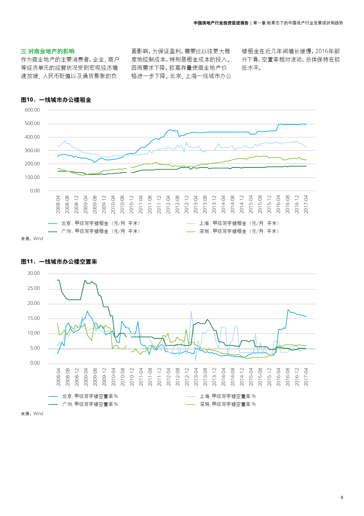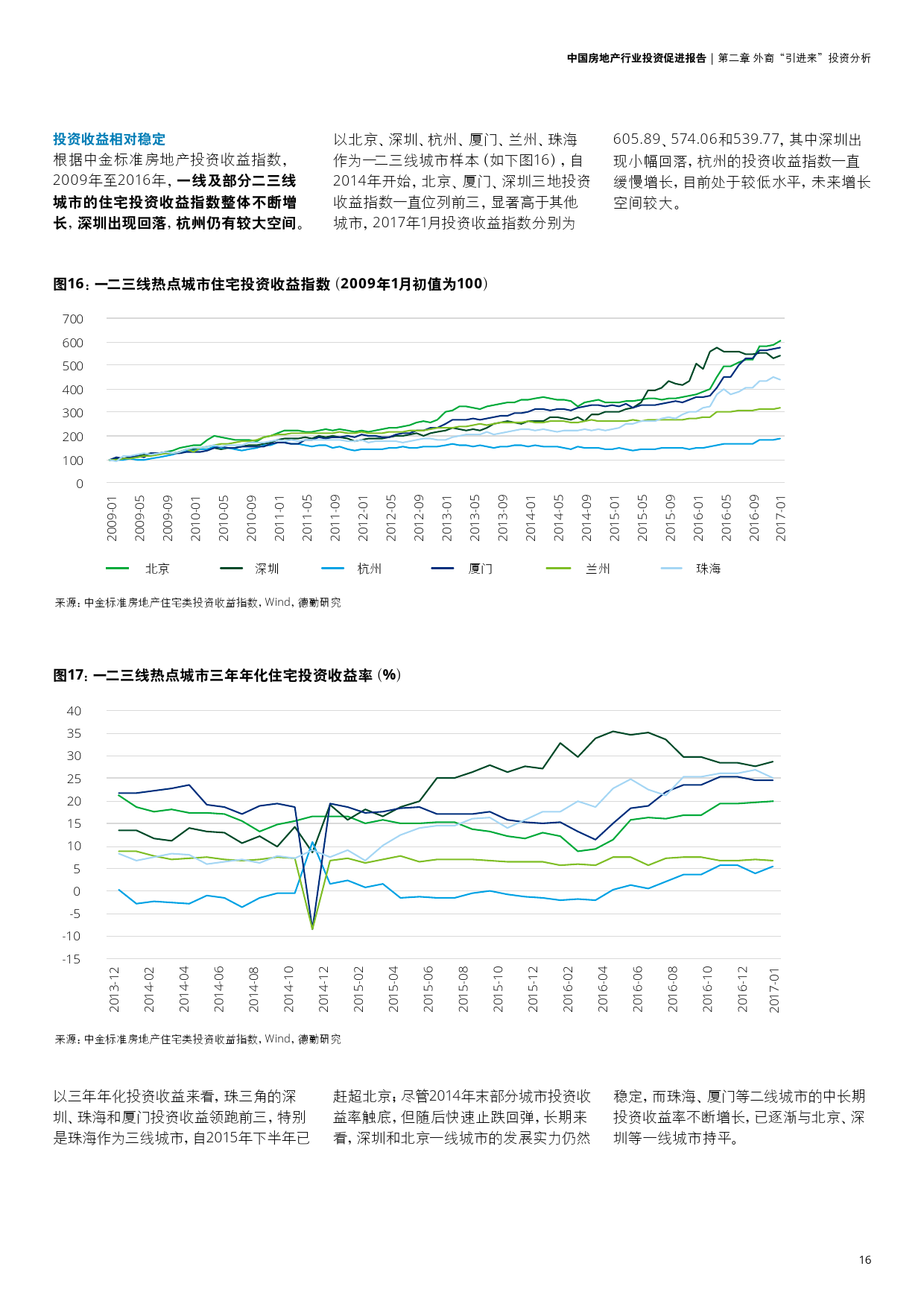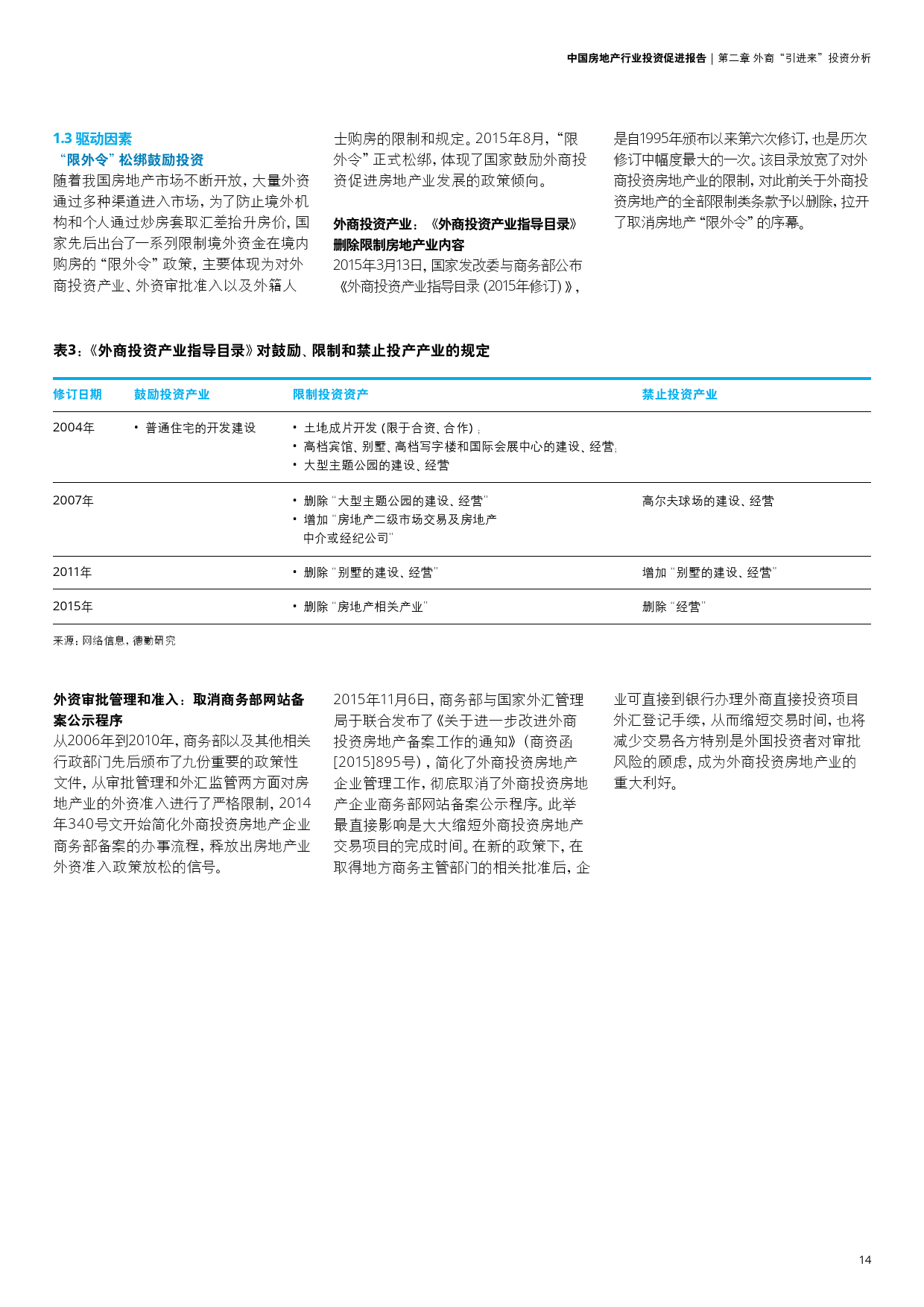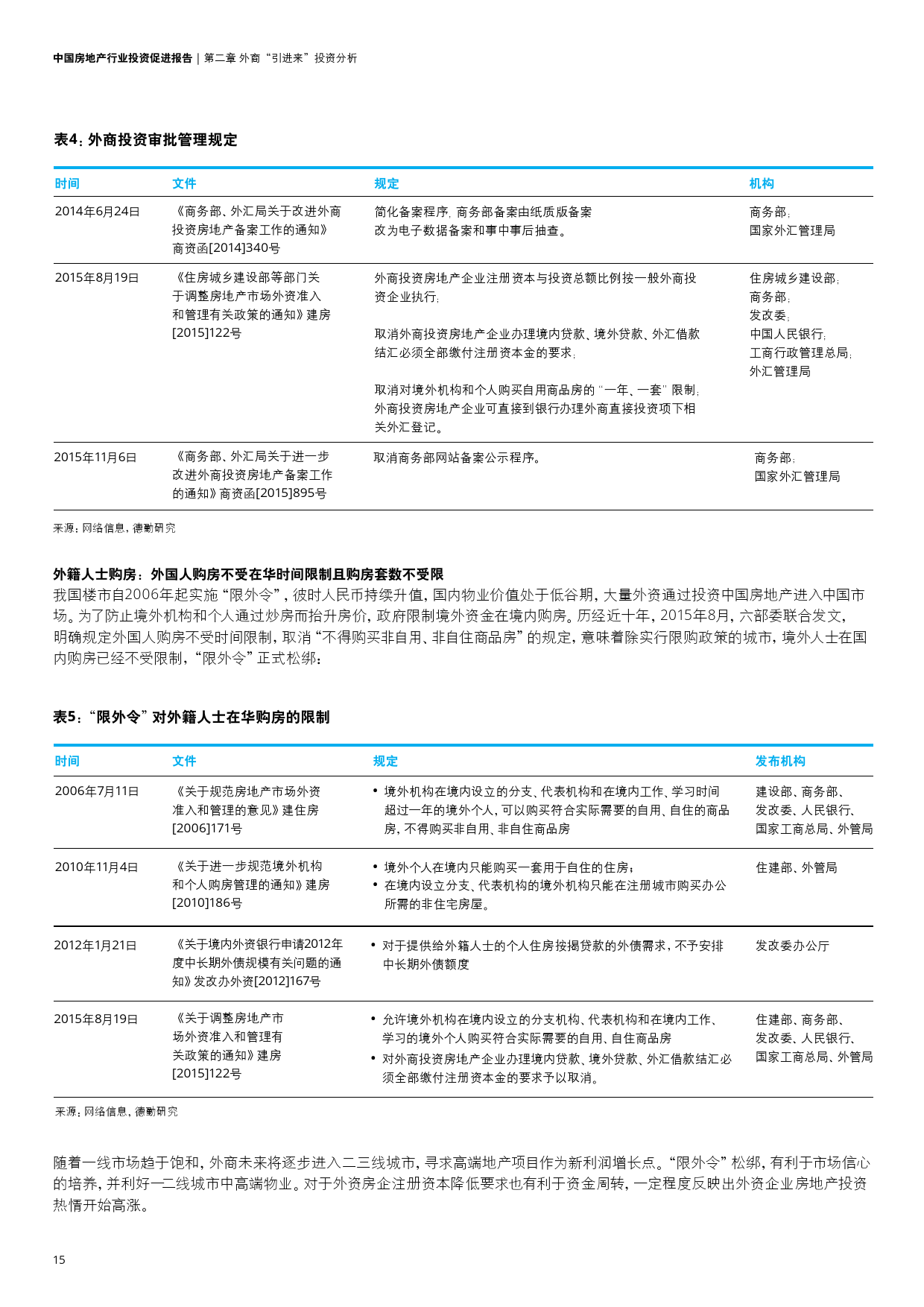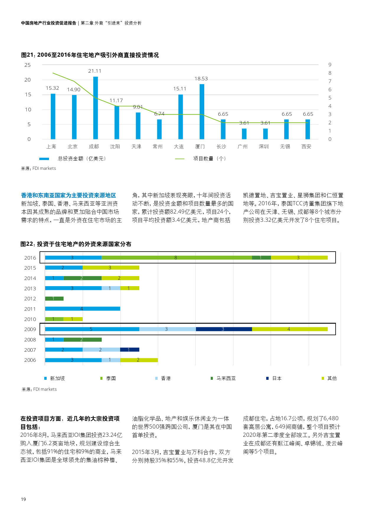 房地产业是中国国民经济的支柱产业,近十年来始终保持着较快的发展速度,已成为吸引外商投资和促进中国企业走出去的重要行业和市场。自2014年以来,中国经济进入新常态,宏观经济下行,房屋价格增速逐步放缓,随着政府对产能过剩行业进行供给侧改革,在历史繁荣期大量开发积累的库存需要逐步消化。因此,当前的中国房地产行业正在进入新一轮调整期,政府不断出台对楼市的宏观调控政策并对房地产开发贷款加强监管,意在抑制杠杆和房地产泡沫,促进行业良性发展。报告主要发现如下: