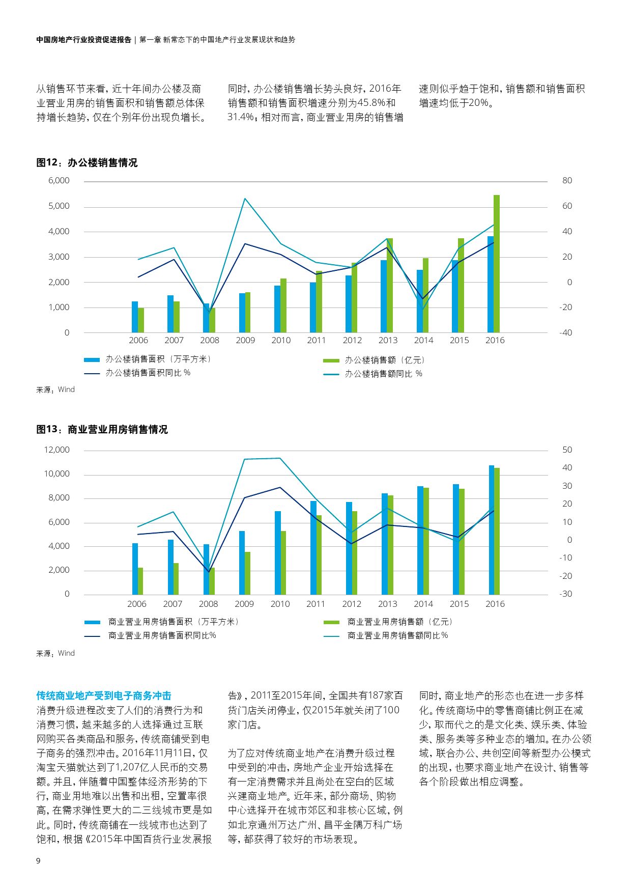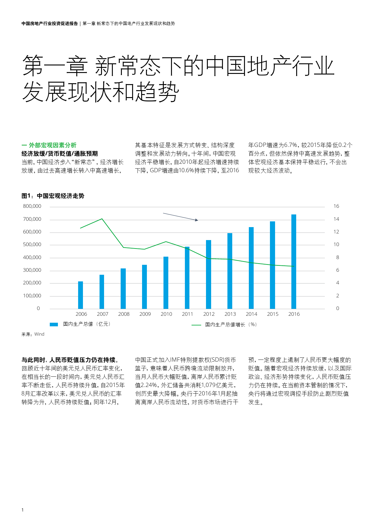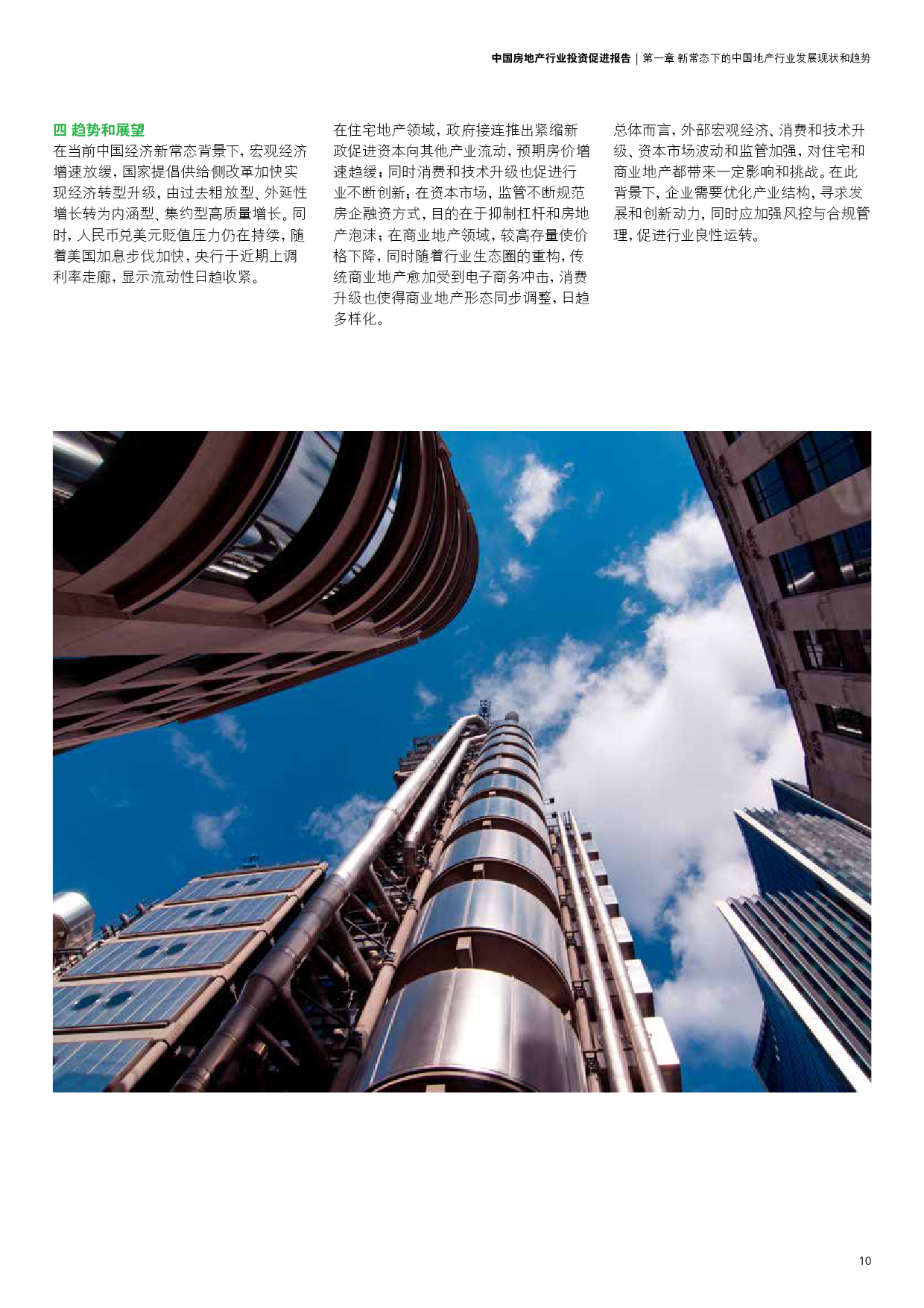 《中国房地产行业投资促进报告》由德勤研究团队携手中国商务部投资促进事务局及德勤中国房地产行业团队联合编撰。本报告主要关注中国住宅和商业地产行业发展现状和趋势。以经济新常态为背景,分析了经济放缓、货币贬值、消费和技术升级以及资本市场波动等对行业的影响;详细梳理了外商“引进来”和中国企业“走出去”在发展规模、主要模式、投资主体、驱动因素以及趋势和挑战等作分析。