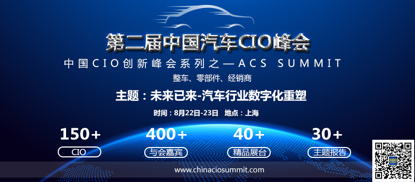 ACS2018第二届中国汽车CIO峰会致力于推动汽车产业更好地实现转型升级,深入汽车行业信息化发展方向,描绘汽车行业信息化发展趋势,展现云计算、大数据、智能制造、移动应用、物联网、人工智能、区块链等在汽车行业应用的全景。将于2018年8月22-23日在上海举办,本次论坛主题为“未来已来—汽车行业数字化重塑”,届时将包括汽车整车、零部件、互联网汽车、汽车经销商等知名企业CEO、CIO、CTO、IT总监、信息化负责人现场交流信息化建设经验与体验。汇聚行业最强大脑,大会也将邀请世界百强企业信息化解决方案专家共同解读最新技术应用方案,结合实际案例,看行业大咖如何为未来赋能!