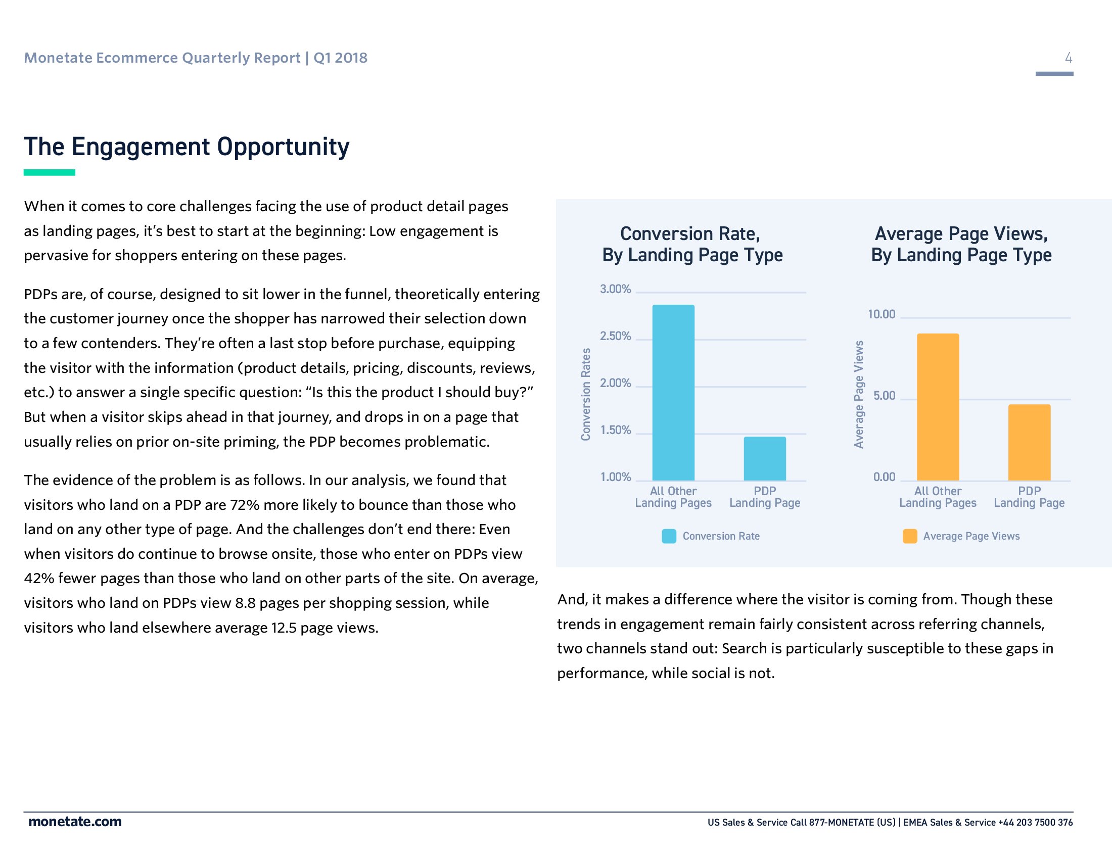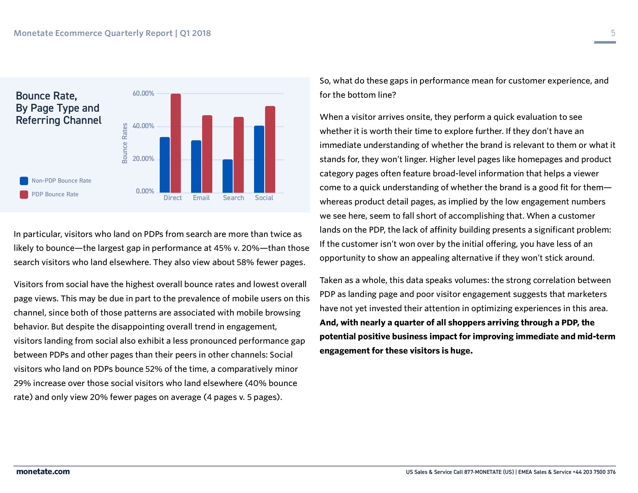 无论引荐渠道如何,PDP的跳出率均高于其他电子商务页面。但是,搜索引荐访问者的差距尤其严重,与其他页面(20%)相比,PDP访问者退出的可能性要高出两倍(45%)。