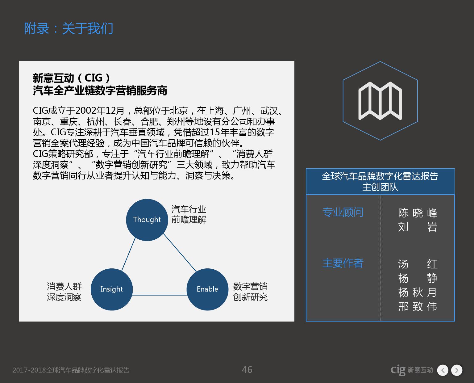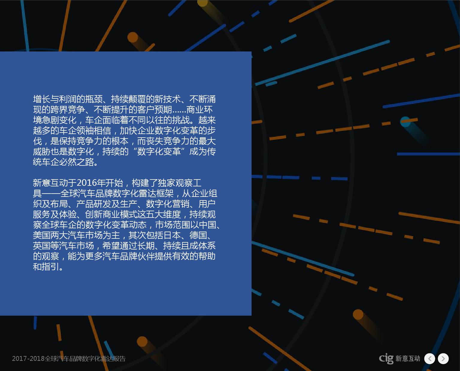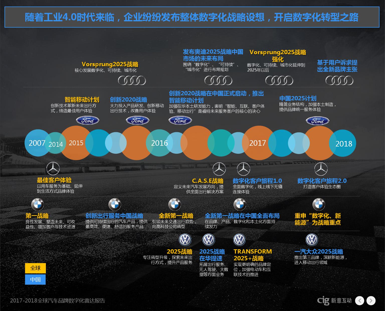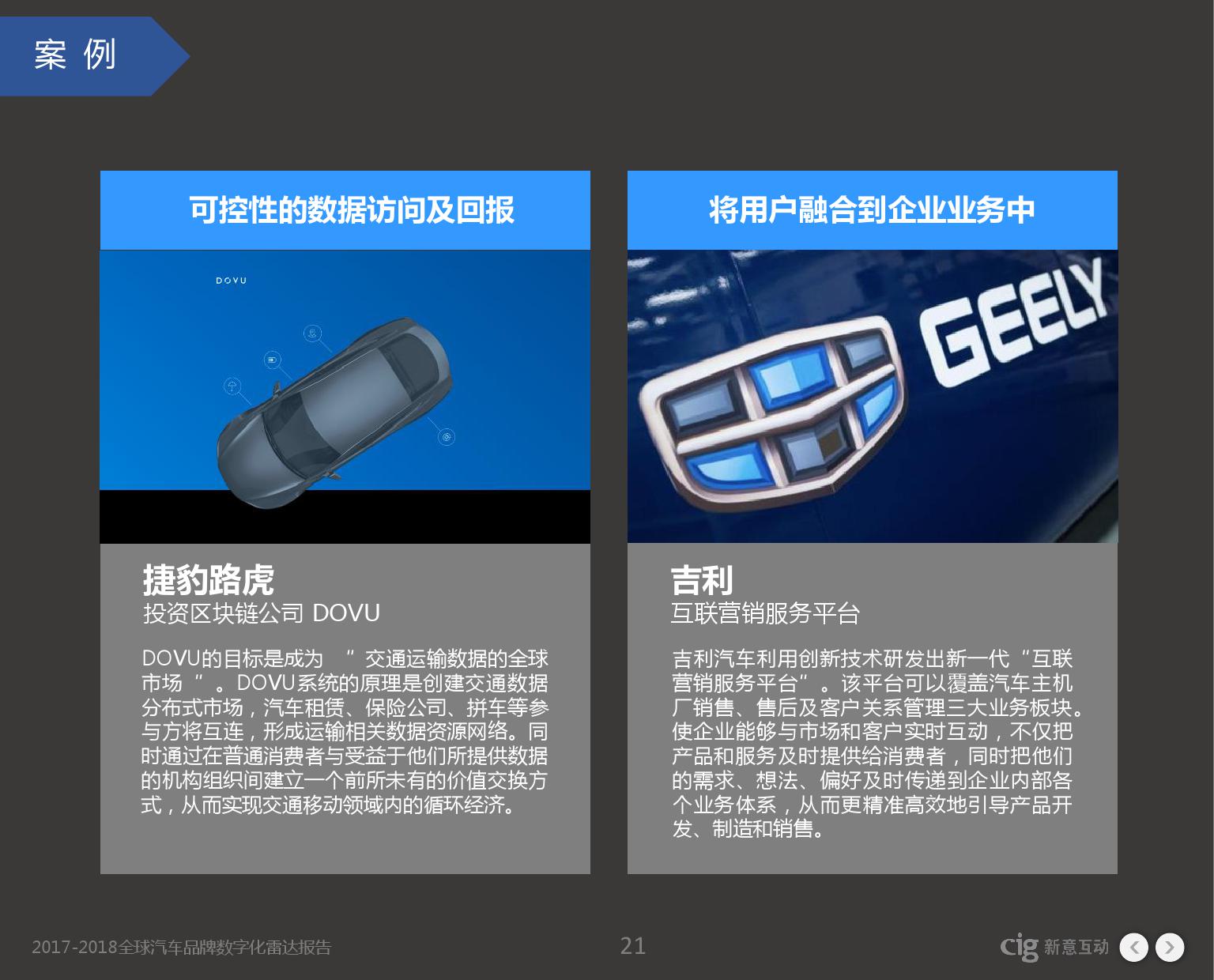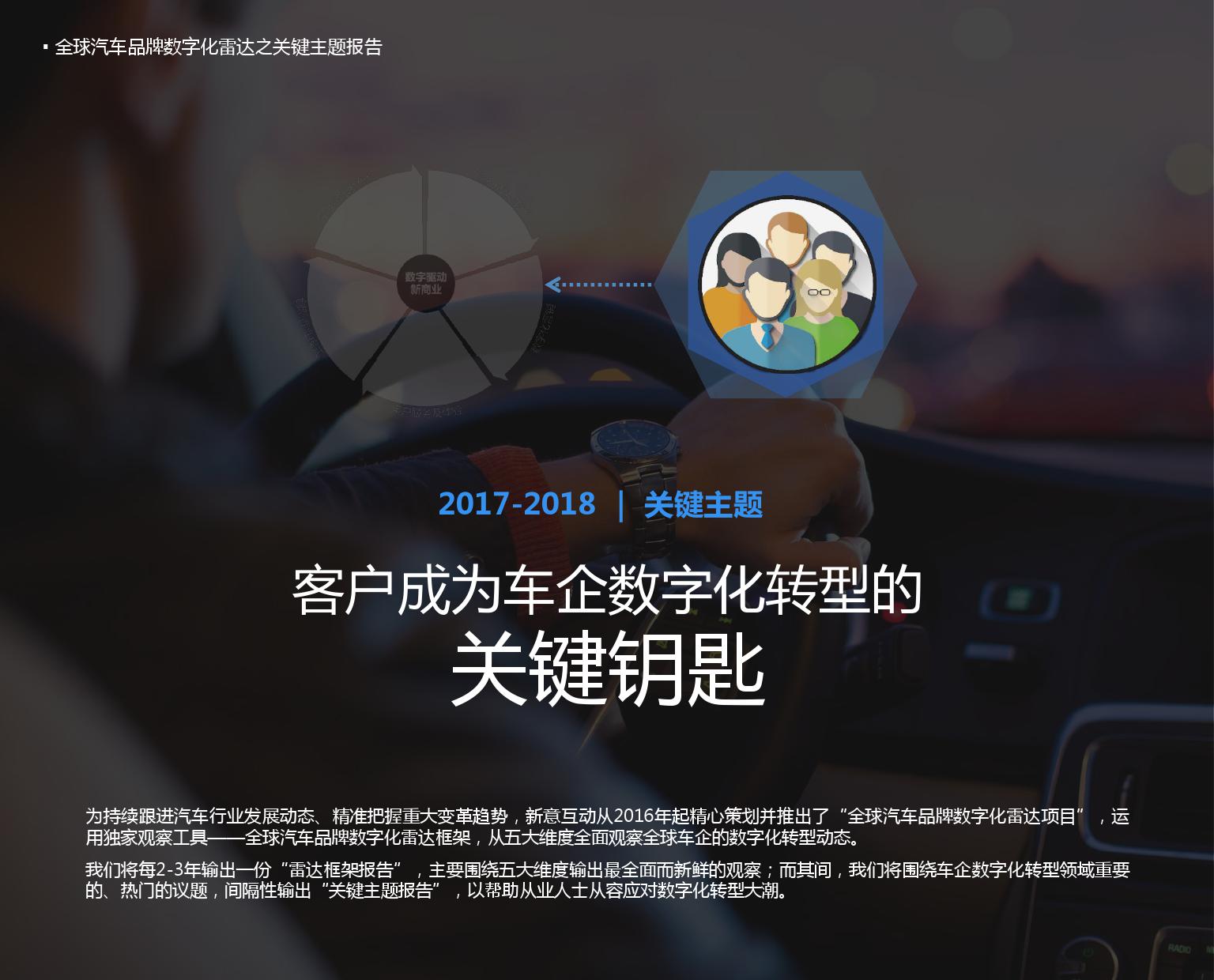 新意互动:2017-2018全球汽车品牌数字化雷达报告 PDF版本将分享到199IT交流群,支持我们发展可加入! 更多阅读:新意互动:2017全球汽车品牌数字化雷达报告GSMA:2018全球移动雷达报告K-12报告:2017-2018全球数字学习现状新意互动&京东:2019中国汽车高价值用户报告新意互动:汽车与超级现实营销专题报告国际能源机构:2018年全球电动汽车展望报告TrendForce:2020年全球新能源车销售量为240万辆 逆势成长19.8%2010-2019年全球新能源汽车销量(附原数据表) BNEF:预计2030年全球锂离子电池需求将超过2000GWh2018年全球汽车销量排行榜波士顿咨询:2024年全球财富报告世界经济论坛:2020年全球竞争力报告–特别版IMD:2020年全球人才报告(113页)德勤咨询:2020中国与全球企业人工智能应用现状调研德勤咨询:2020全球消费者状态跟踪——中国