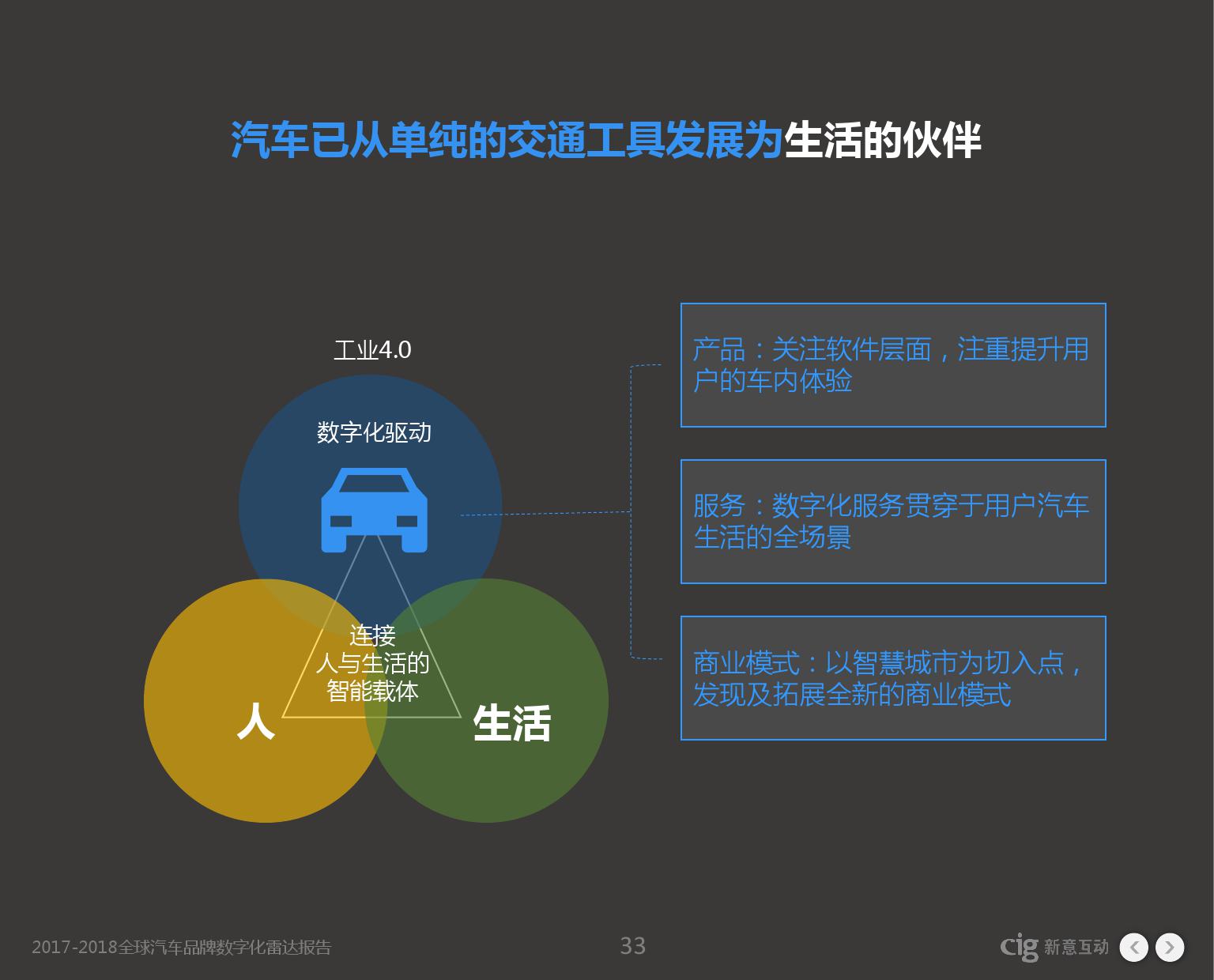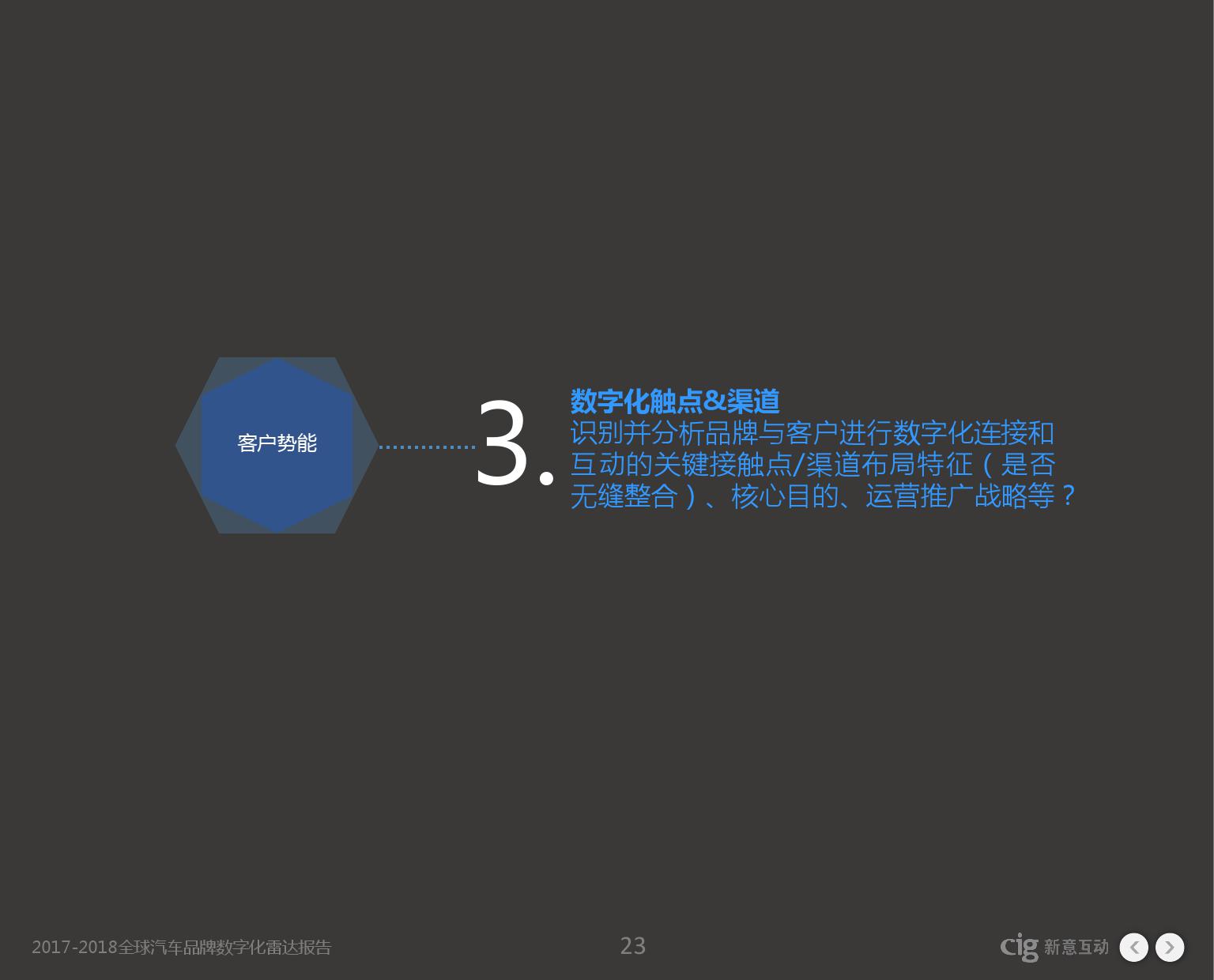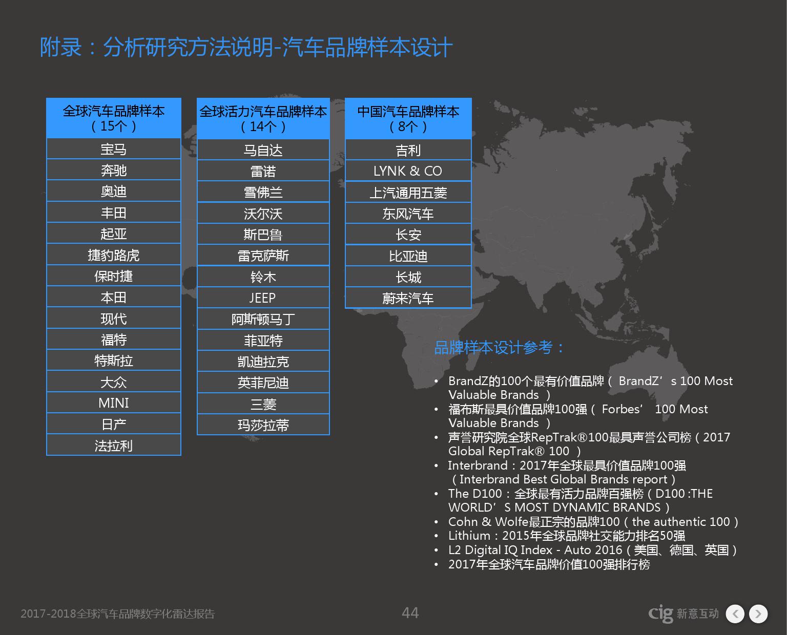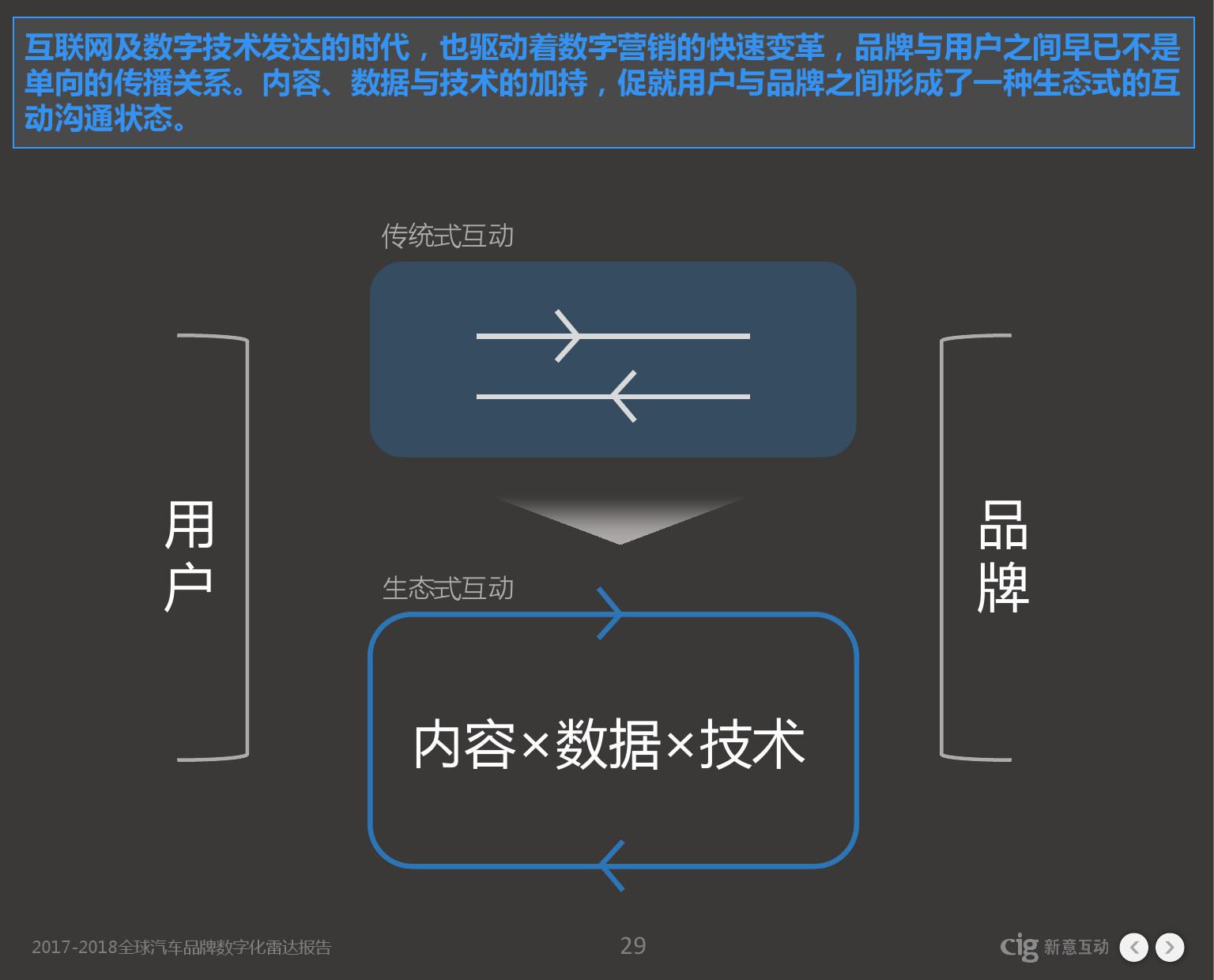 新意互动:2017-2018全球汽车品牌数字化雷达报告 PDF版本将分享到199IT交流群,支持我们发展可加入! 更多阅读:新意互动:2017全球汽车品牌数字化雷达报告GSMA:2018全球移动雷达报告K-12报告:2017-2018全球数字学习现状新意互动&京东:2019中国汽车高价值用户报告新意互动:汽车与超级现实营销专题报告国际能源机构:2018年全球电动汽车展望报告TrendForce:2020年全球新能源车销售量为240万辆 逆势成长19.8%2010-2019年全球新能源汽车销量(附原数据表) BNEF:预计2030年全球锂离子电池需求将超过2000GWh2018年全球汽车销量排行榜波士顿咨询:2024年全球财富报告世界经济论坛:2020年全球竞争力报告–特别版IMD:2020年全球人才报告(113页)德勤咨询:2020中国与全球企业人工智能应用现状调研德勤咨询:2020全球消费者状态跟踪——中国