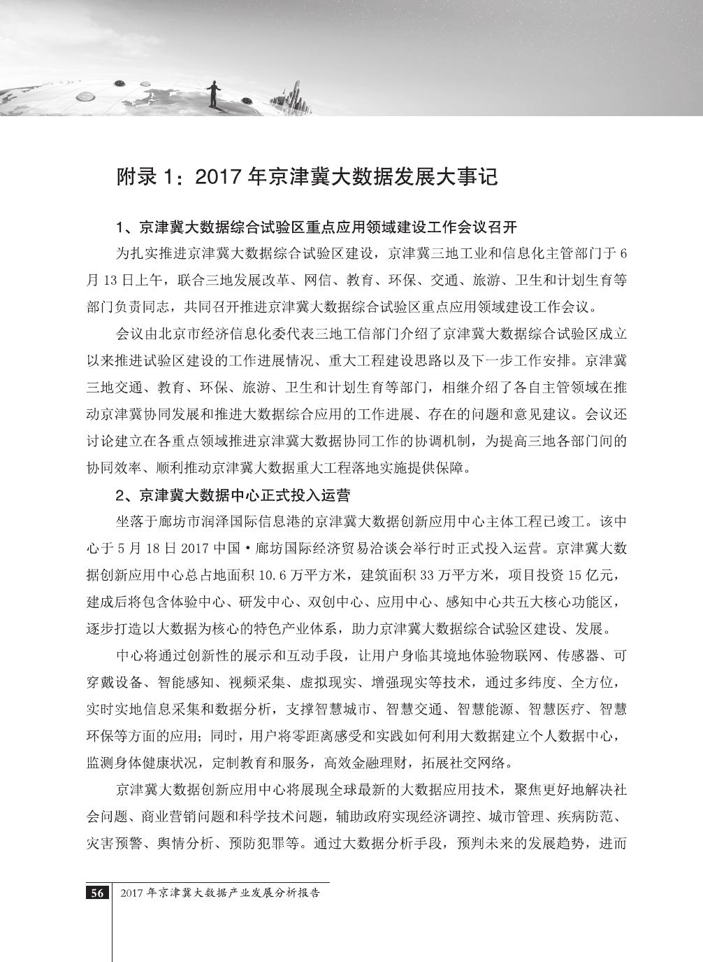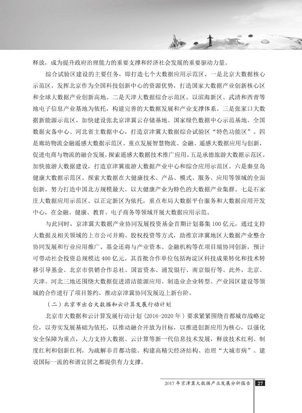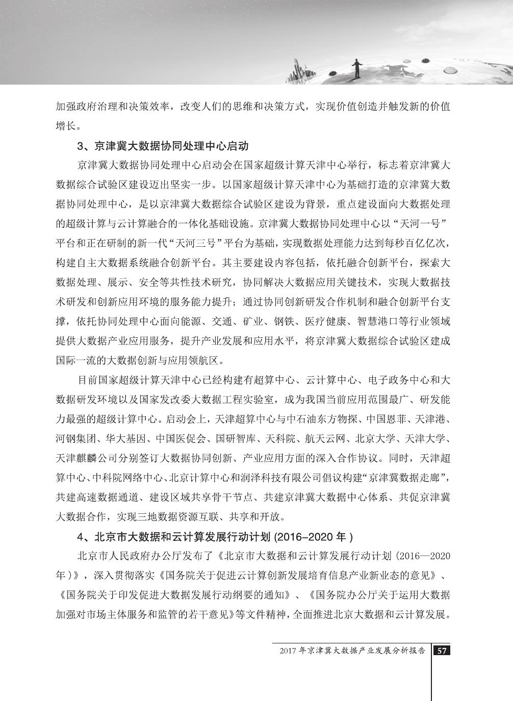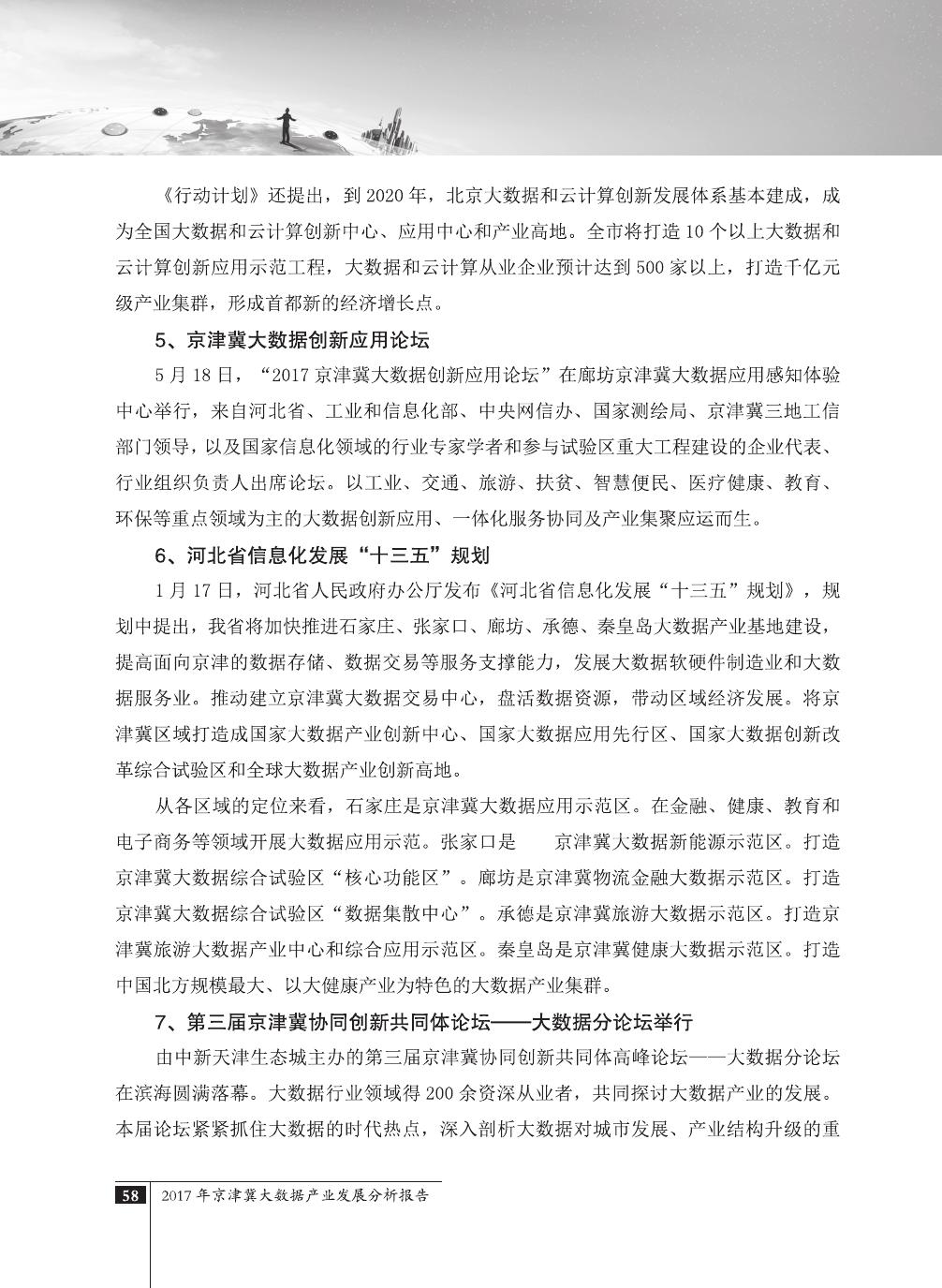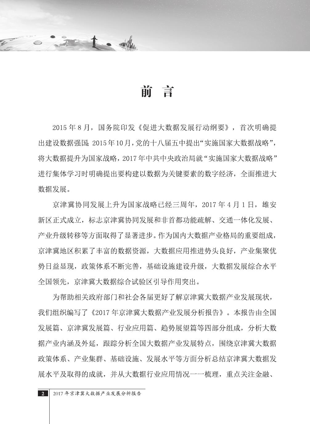 报告介绍了大数据技术在全球与全国范围内的发展演进,京津冀大数据综合试验区的独特优势,以及大数据在京津冀三地相关产业内的错位应用与协同发展,同时对大数据在京津冀的应用前景,对国民经济相关领域带来的拉动作用等热点问题进行了详细的论述。报告对相关方洞悉大数据产业生态规律,制订大数据发展战略,利用大数据创造更大价值,都具有较好的参考借鉴作用。