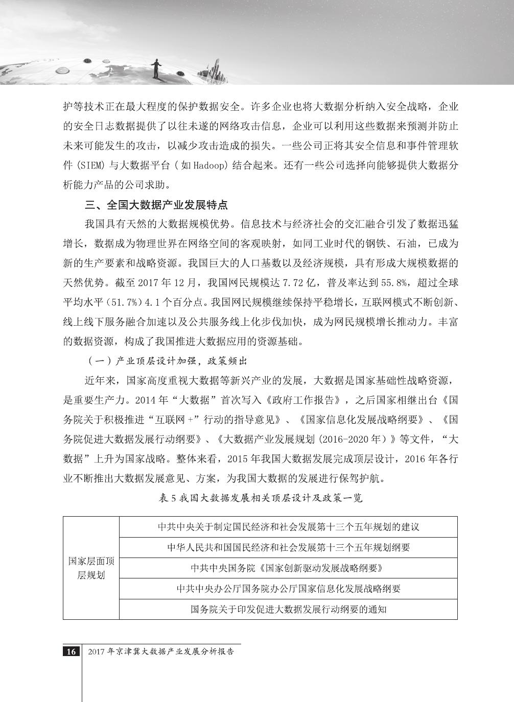党中央、国务院高度重视大数据在经济社会发展中的作用,党的十八届五中全会提出“实施国家大数据战略”,国务院印发《促进大数据发展行动纲要》,工信部发布了《2016年-2020年中国大数据产业发展规划》,全面推进大数据发展,加快建设数据强国。