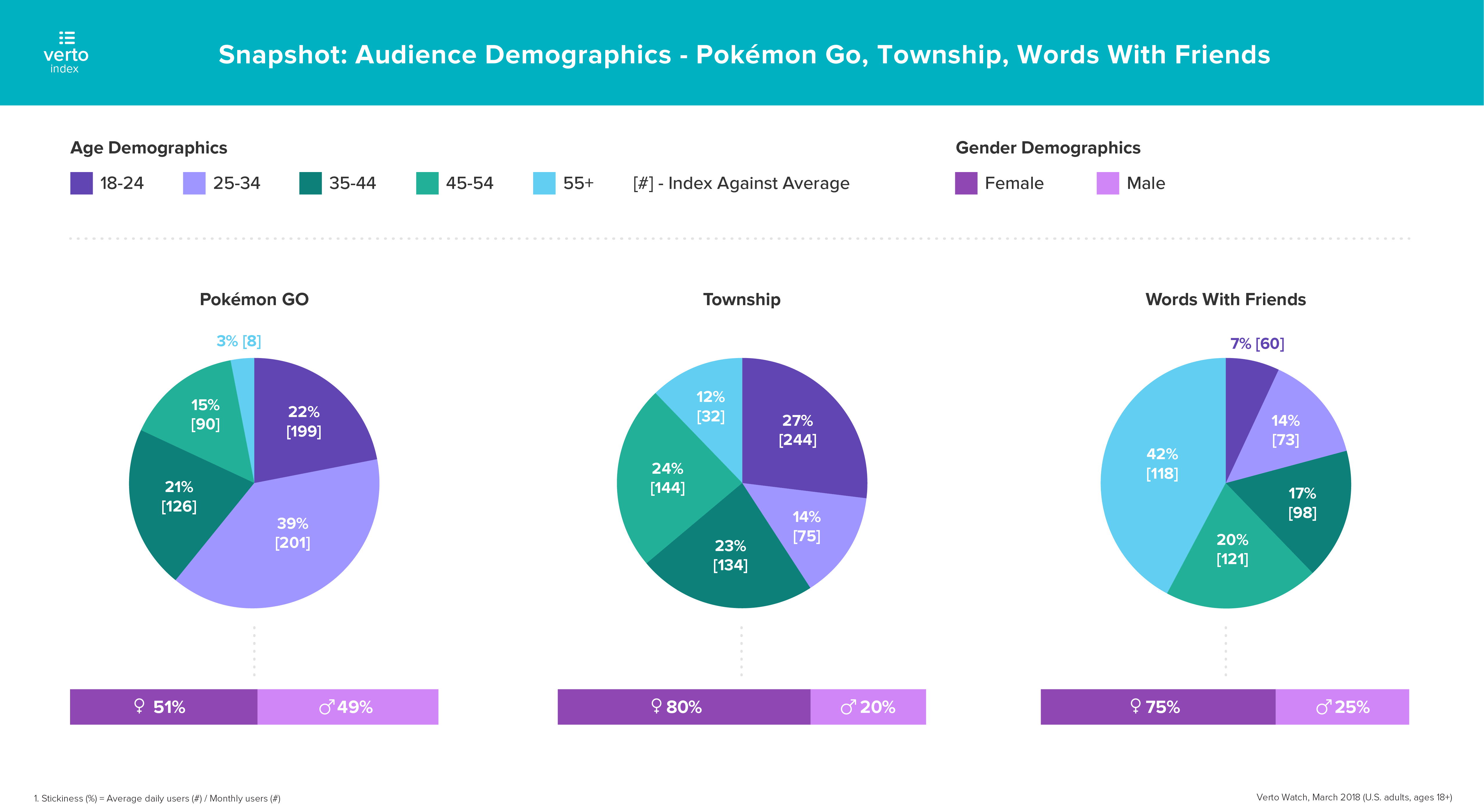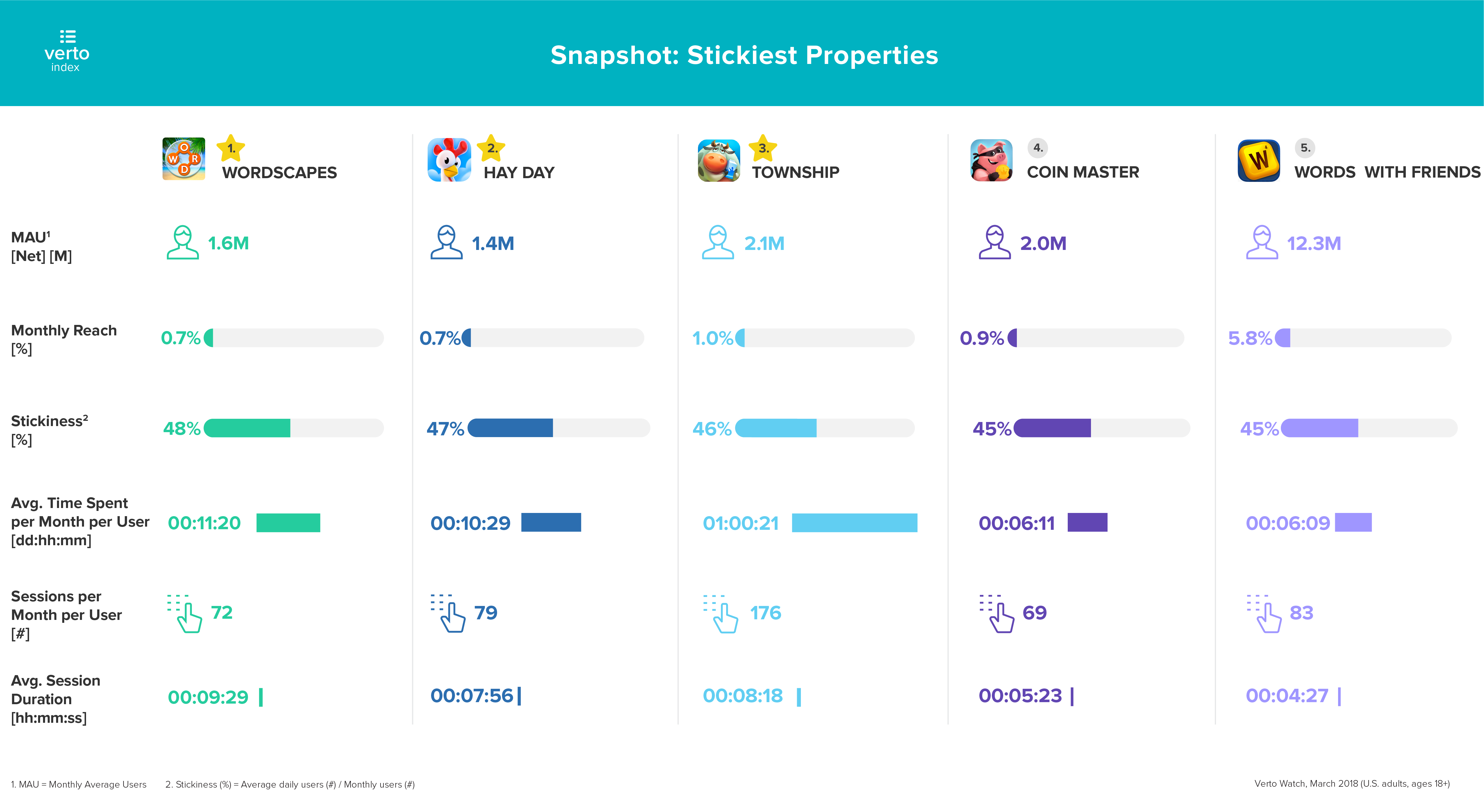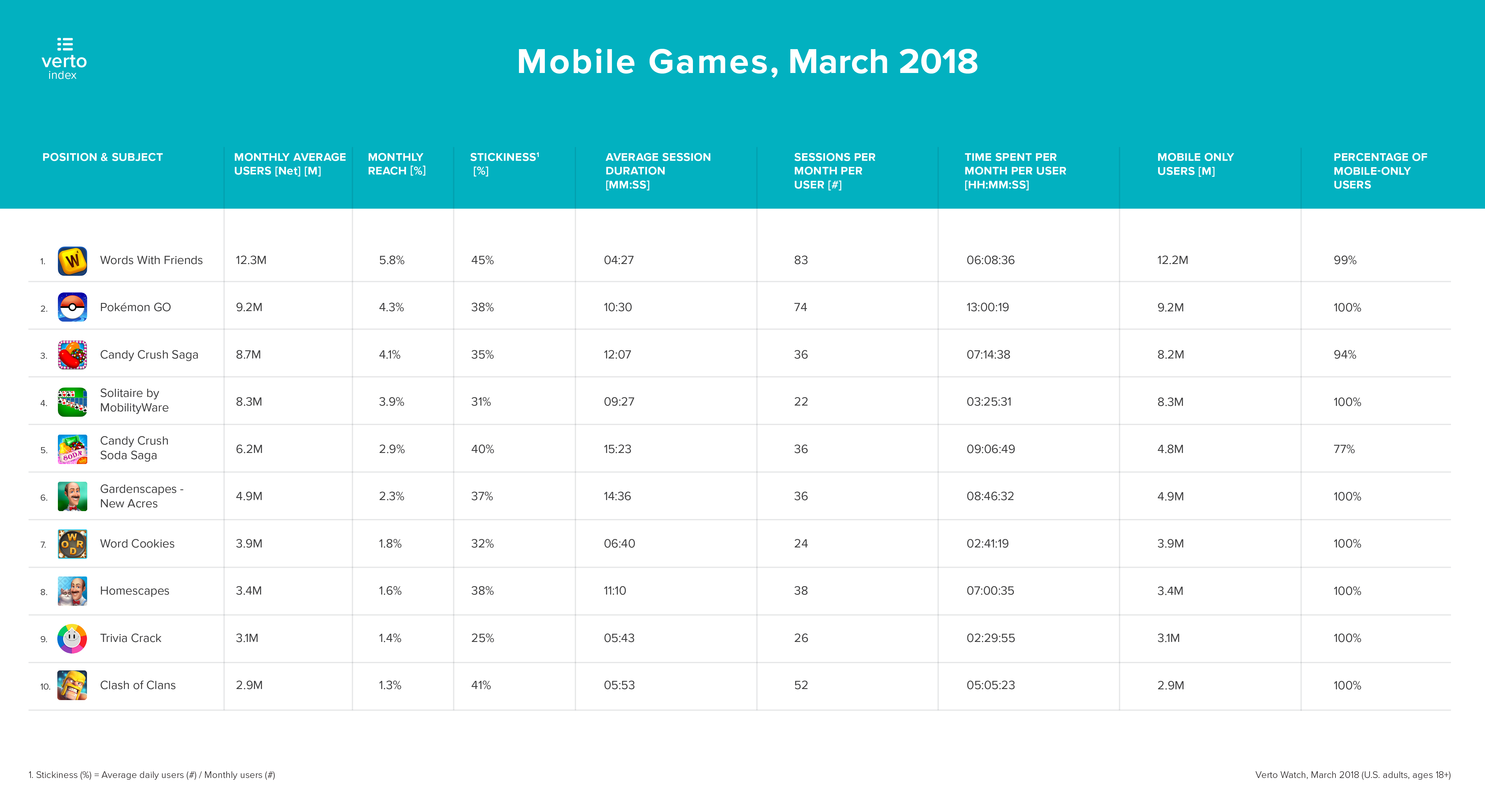 Verto的新指数分析了美国成年人(18岁+)最喜欢的手机游戏,从Words of Friends到Clash of Clans。由于许多游戏都提供PC和移动版本,为了清晰起见,我们将移动游戏定义为基于75%或更多移动用户的游戏。受欢迎程度取决于2018年3月的月活跃用户数量。