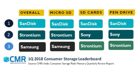 CMR首席分析师Shipra Sinha表示:“尽管智能手机内置存储卡销量巨大,Micro SD成为增长的领跑者和贡献者。第一季度刚开始,消费储存市场由于需求低迷而缓慢,但是在3月恢复。SanDisk为印度消费存储市场出货量贡献近一半,并一直保持领导地位。”