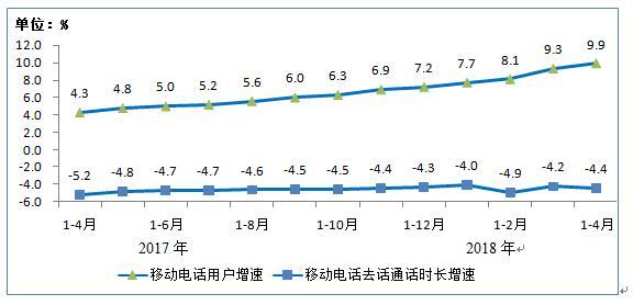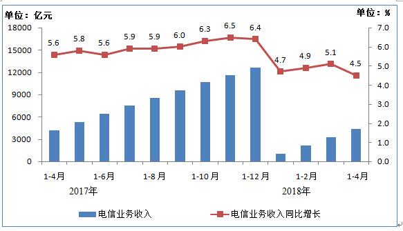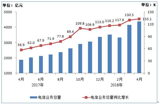 电信业务总量继续高速增长。2018年1-4月,电信业务总量①完成15376亿元,同比增长125%。电信业务收入完成4431亿元,同比增长4.5%。
