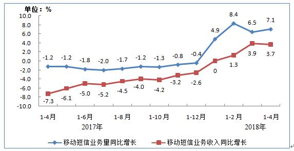 移动短信业务量和收入继续保持增长态势。受企业短信业务快速发展的拉动,1-4月,全国移动短信业务量完成2289亿条,同比增长7.1%(去年同期同比下降1.2%);移动短信业务收入完成122亿元,同比增长3.7%(去年同期同比下降7.3%);移动彩信业务量同比下降11.3%,发送总量147亿条。