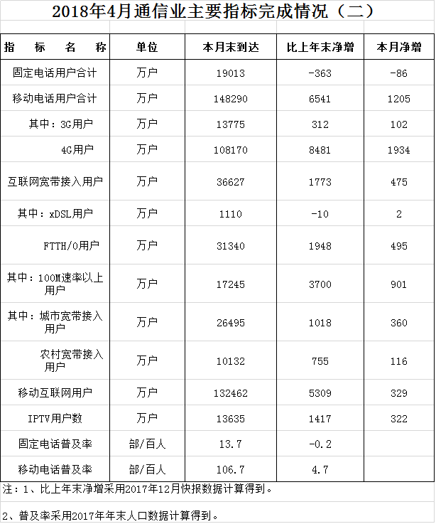 工信部:2018年4月通信业主要指标完成情况 更多阅读:工信部:2018年2月通信业主要指标完成情况工信部:2020年1-12月通信业主要指标完成情况工信部:2021年1-4月通信业主要指标完成情况工信部:2018年3月通信业主要指标完成情况工信部:2020年前三季度通信业经济运行数据情况工信部:2015年11月通信业主要指标完成情况工信部:2016年8月通信业主要指标完成情况工信部:2019年1-5月份通信业经济运行情况工信部:2017年9月电话及互联网宽带用户分省情况工信部:2018年3月电话用户分省情况工信部:2018年第2季度通信水平分省情况工信部:2020年12月电话用户分省情况工信部:2018年第2季度通信业主要通信能力工信部:2015年3月份通信业经济运行情况工信部:2018年Q1通信业主要通信能力