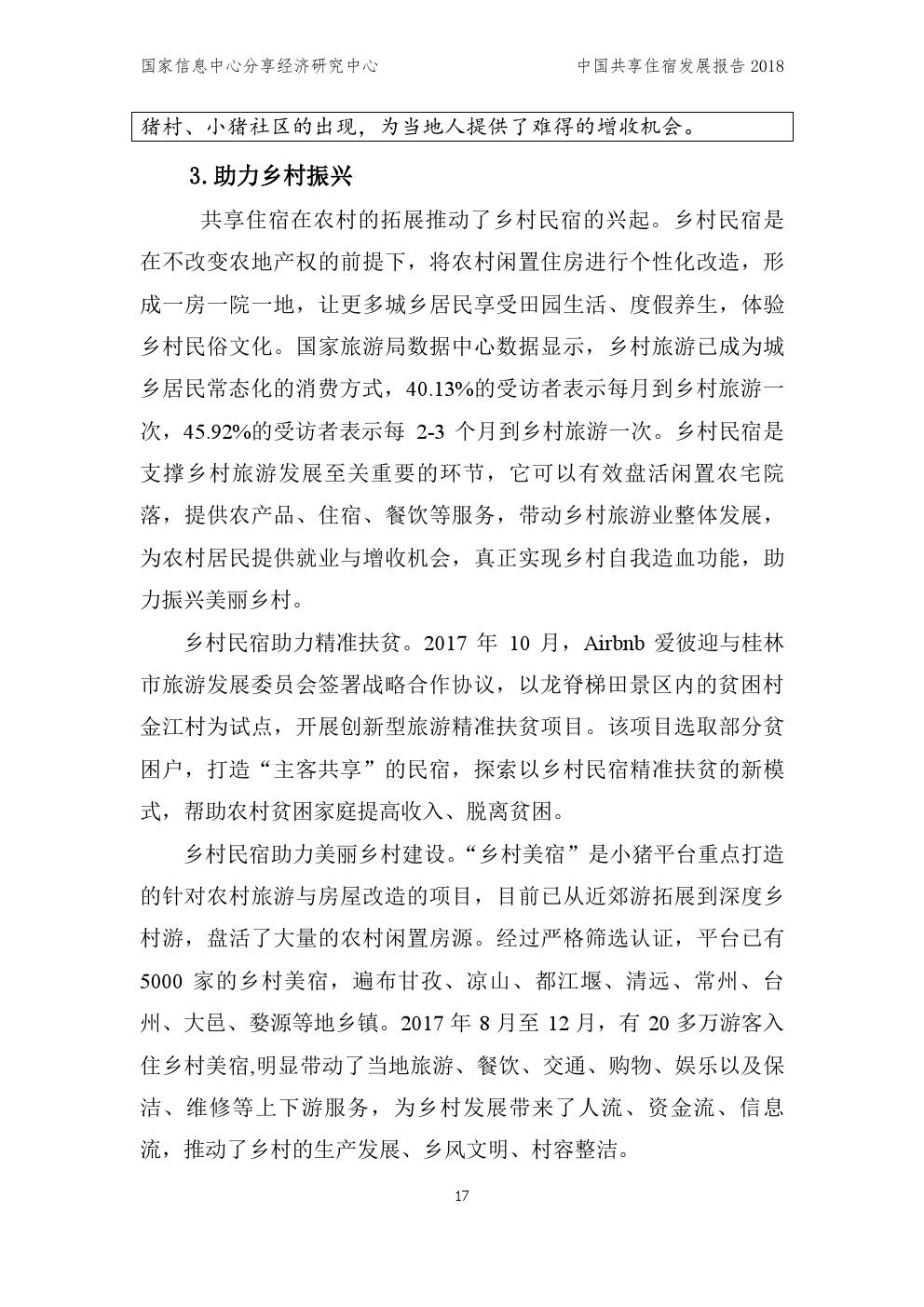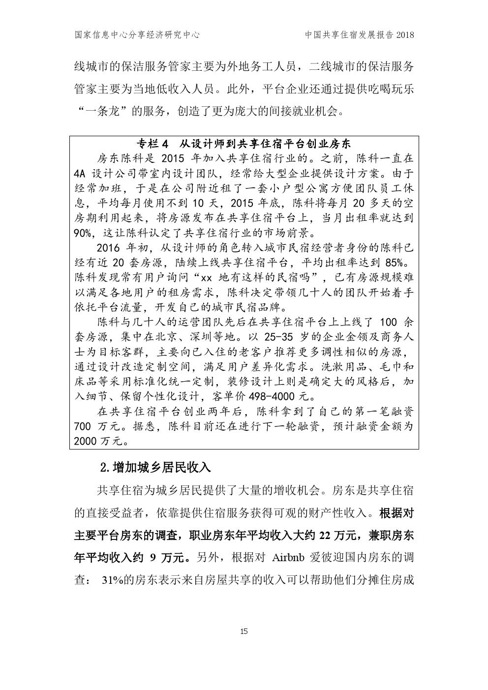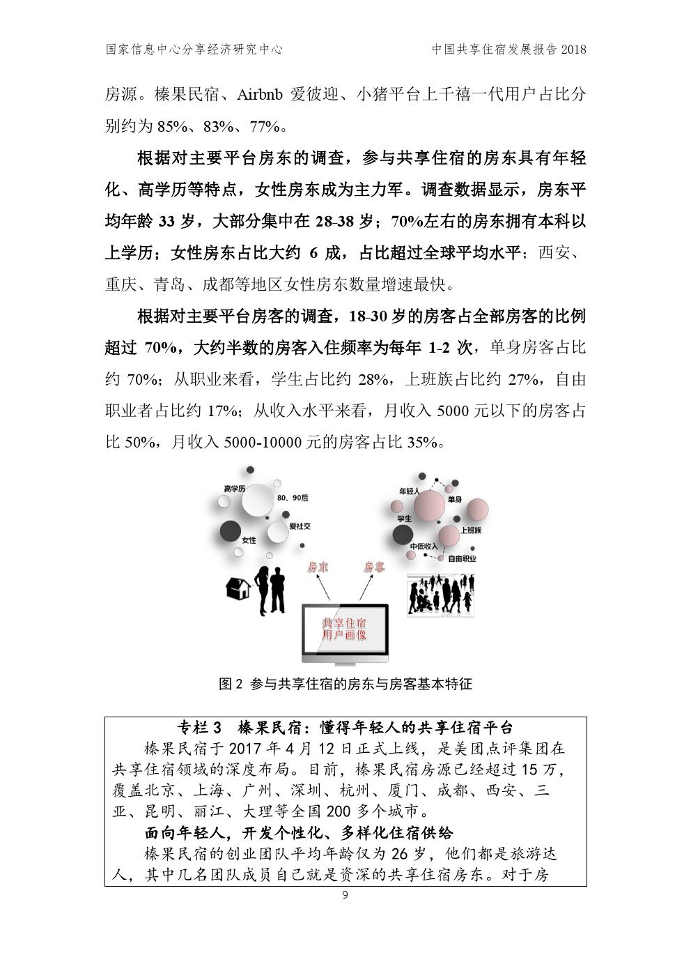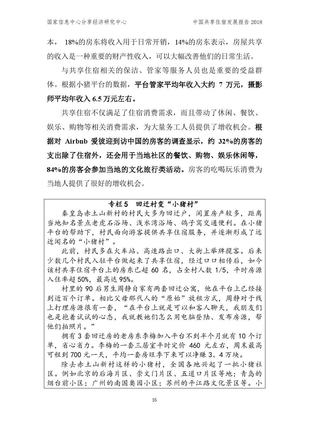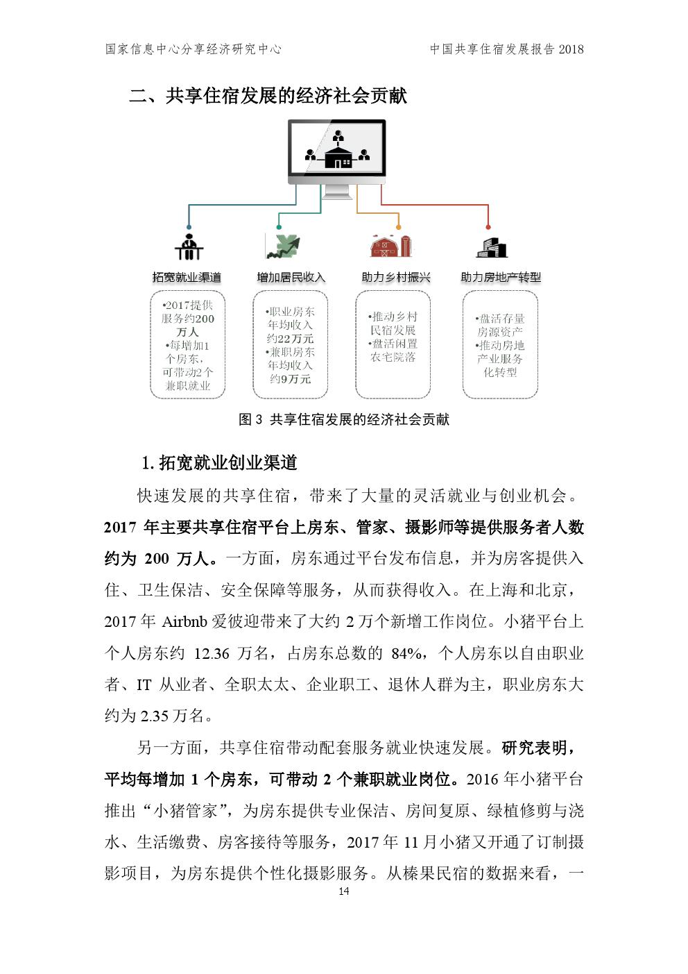 报告提出,共享住宿发展在拓宽就业创业渠道、增加城乡居民收入等方面的作用已经显现。2017年主要共享住宿平台上房东、管家、摄影师等提供服务者人数约为200万人;平均每增加1个房东,可带动2个兼职就业岗位;职业房东年平均收入大约22万元,个人房东年平均收入约9万元。