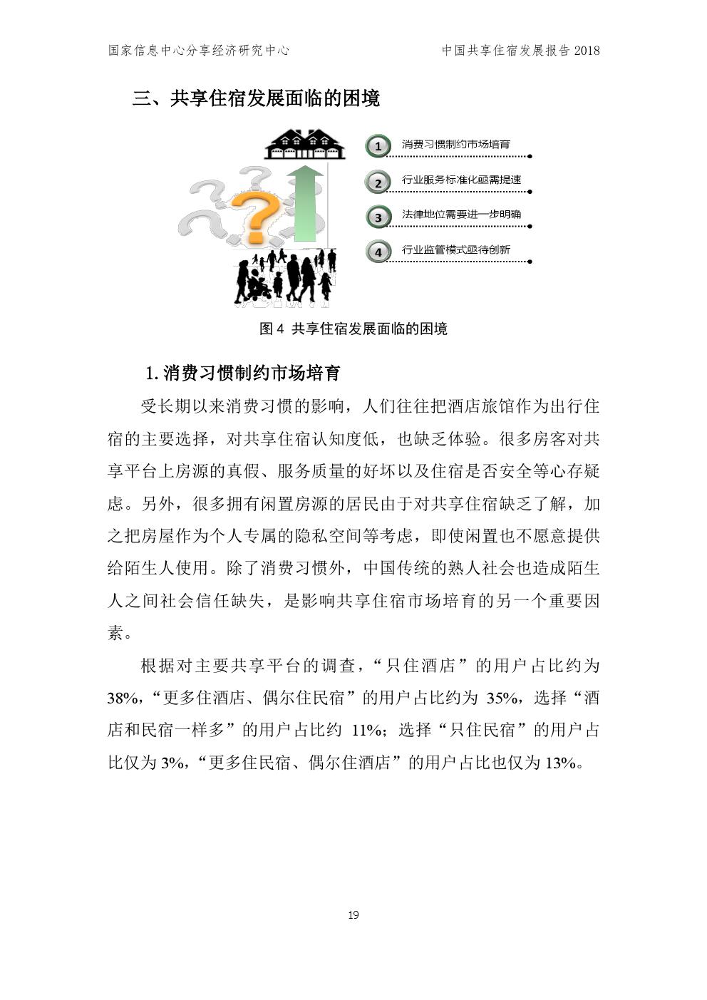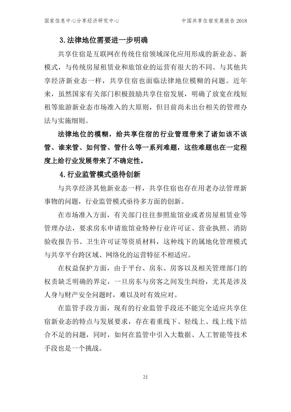 报告指出,共享住宿是一种住宿新业态,当前发展中还面临着一些困难,如服务标准化有待提升、法律地位有待明确、行业监管模式亟待创新等。在服务标准化方面,不能简单套用酒店旅馆业的标准与服务规范,而是要根据共享住宿的特性,推动实名认证、信用评价、预定入住、支付结算、安全卫生、房屋保养、服务培训等整个服务流程的标准化、规范化。法律地位的模糊,给共享住宿的行业管理带来了诸如“该不该管、谁来管、如何管、管什么”等一系列难题。