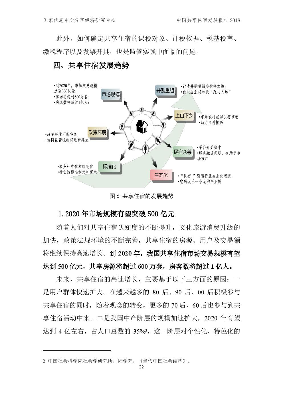 从未来发展趋势看,预计到2020年,我国共享住宿市场交易规模有望达到500亿元,共享房源将超过600万套,房客数将超过1亿人;行业并购重组步伐将加快;平台企业将加快布局“上山下乡”;民宿众筹将加速升温;“民宿+” 将引领行业生态化潮流;行业服务标准化水平将不断提升。