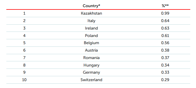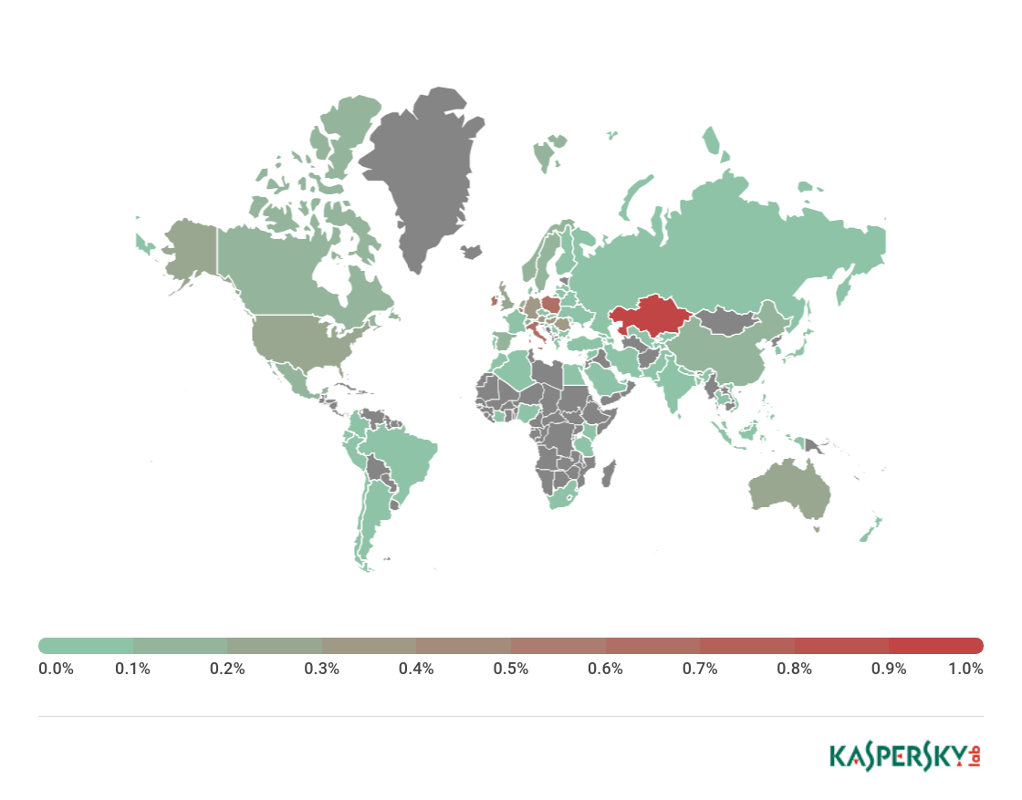 排在首位的是哈萨克斯坦(0.99%),最活跃的手机勒索家族式Trojan-Ransom.AndroidOS.Small。意大利(0.64%)和爱尔兰(0.63%)分别排在第二位和第三位。