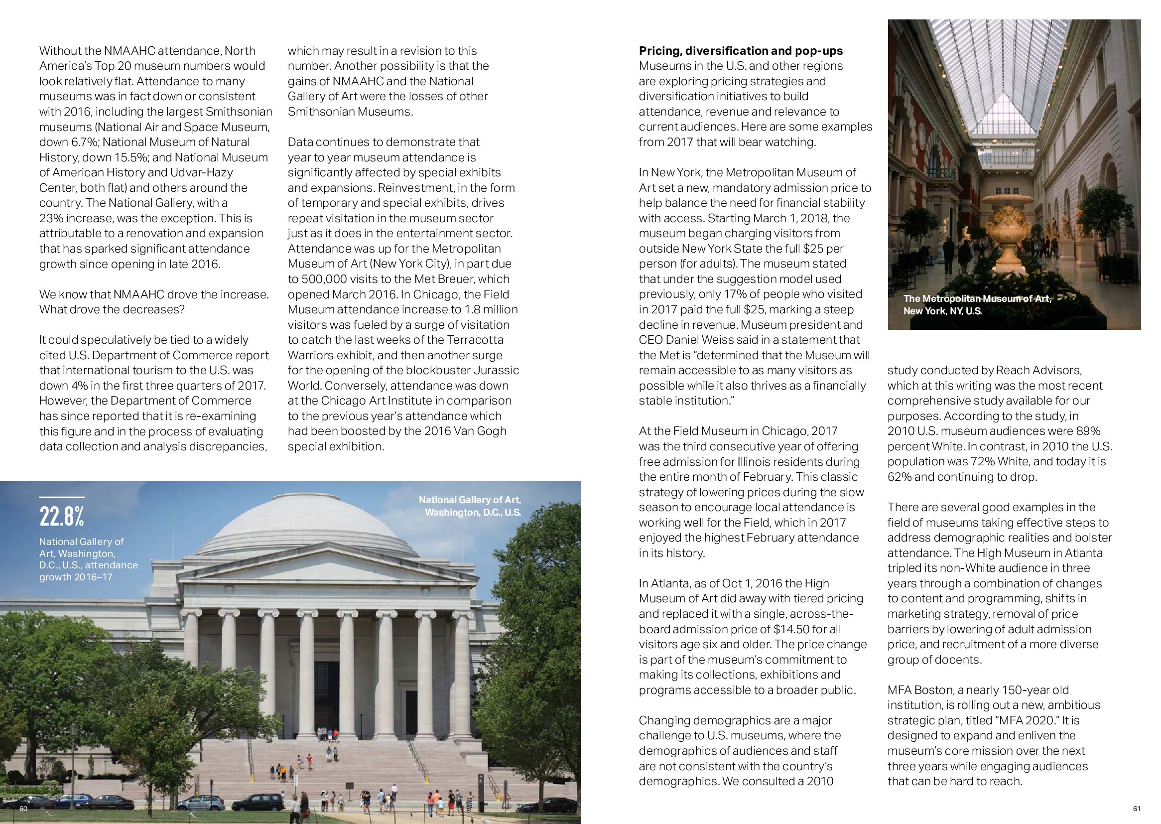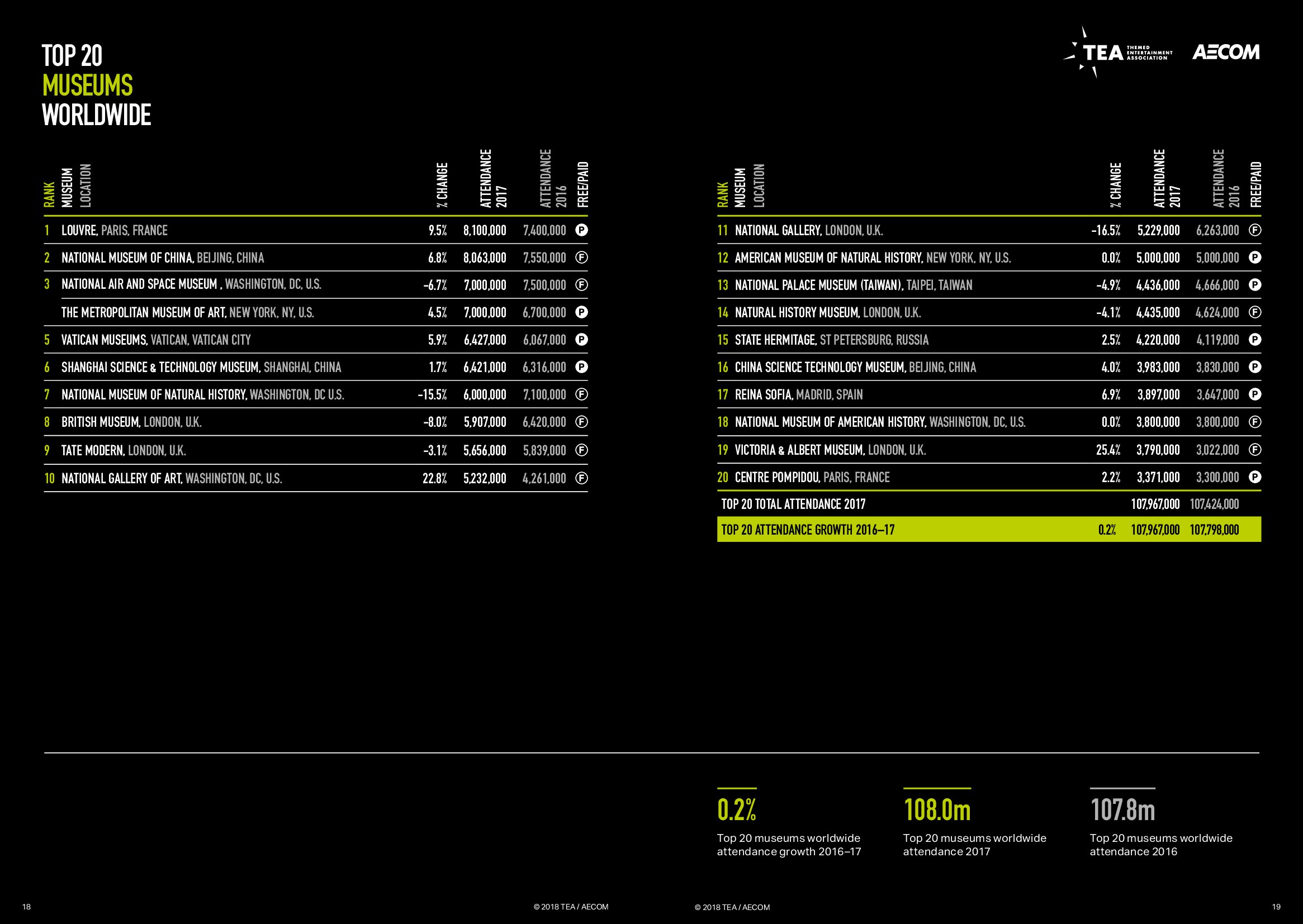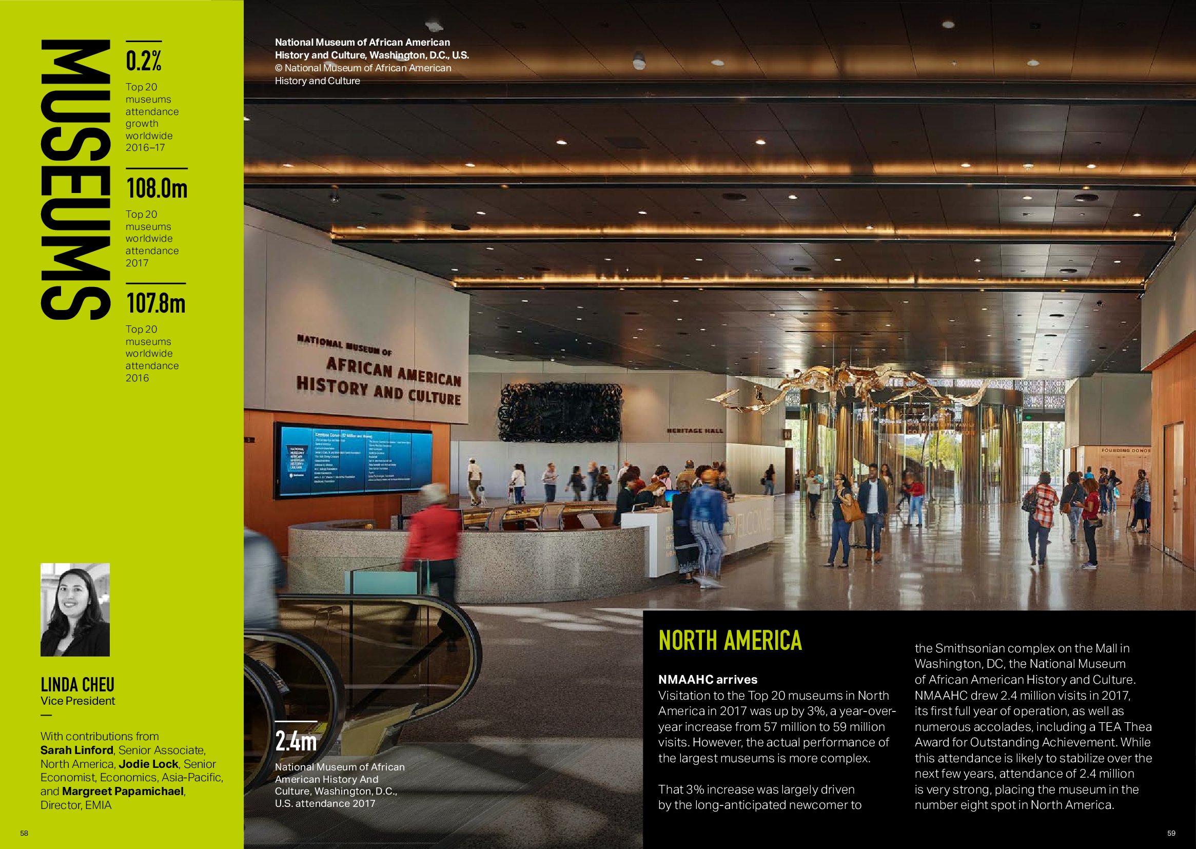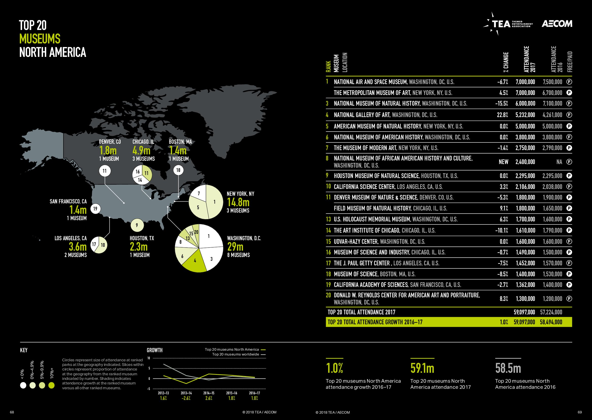 尽管华盛顿新的非裔美国人历史和文化国家博物馆在没有进入全球前20位,其参观人数达到240万,但它确实对北美整体博物馆流量产生了重大影响。