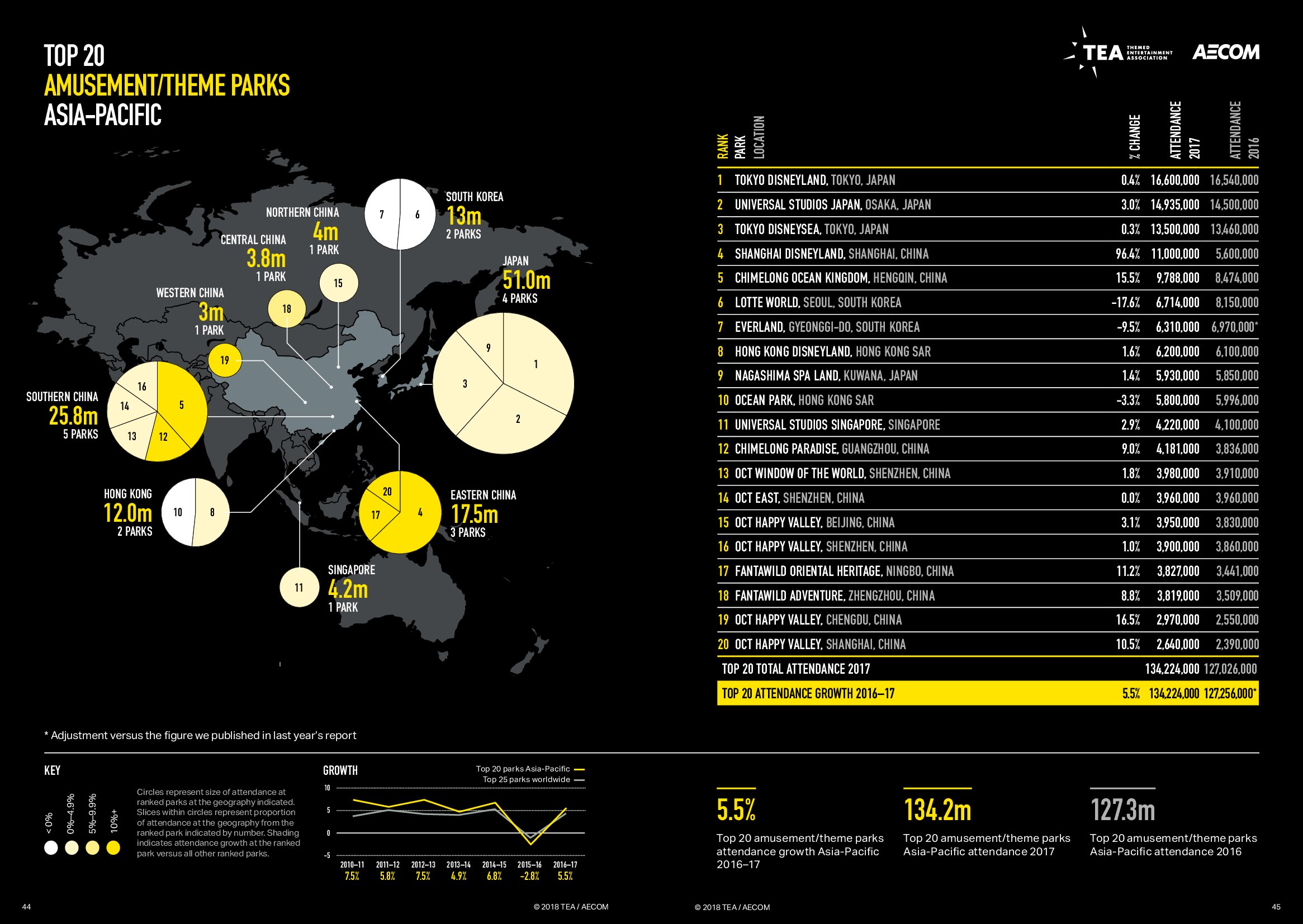 亚太地区20大娱乐/主题公园的流量为1.34亿人次,同比增长5.5%;