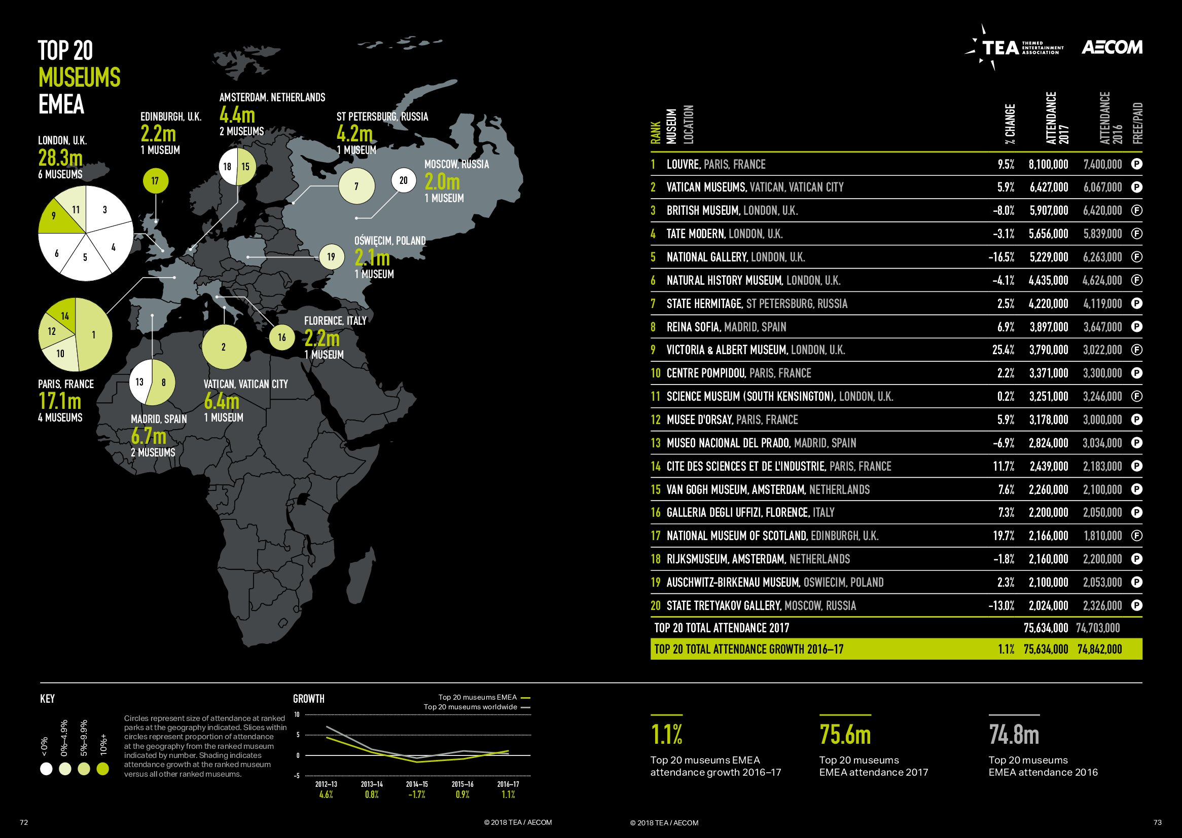 欧洲、中东和非洲20大博物馆的流量为7600万人次,同比增长1.1%;