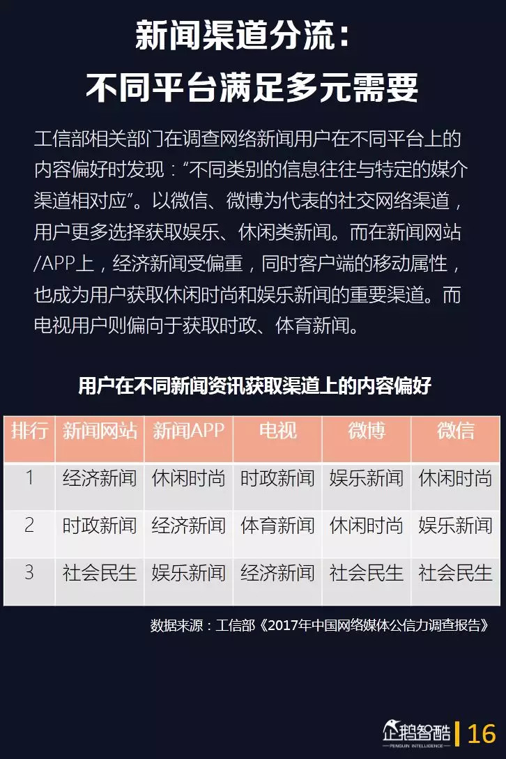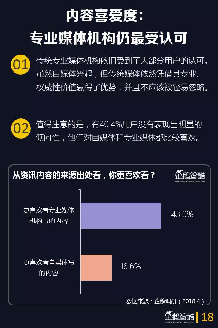 6.从内容供给看,专业媒体机构和自媒体给用户提供的价值上呈现出明显的差异化。专业媒体机构在给用户更多的新闻科普、谣言揭穿、更准确及时和深度的新闻报道方面价值突出。而自媒体在更多好玩的娱乐内容消遣方面,优势明显。