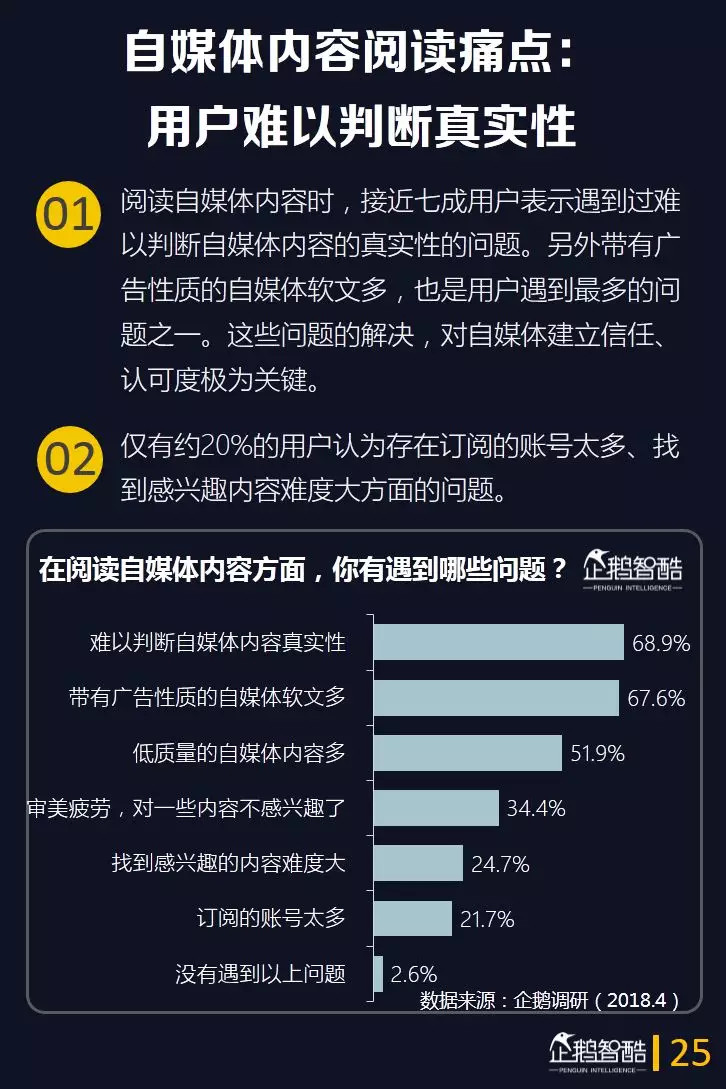 8.在阅读自媒体内容时,最大的痛点来自用户难以判断内容的真实性。有接近70%的用户反映遇到该类问题。另外带有广告性质的自媒体软文多,也是用户遇到最多的问题之一。