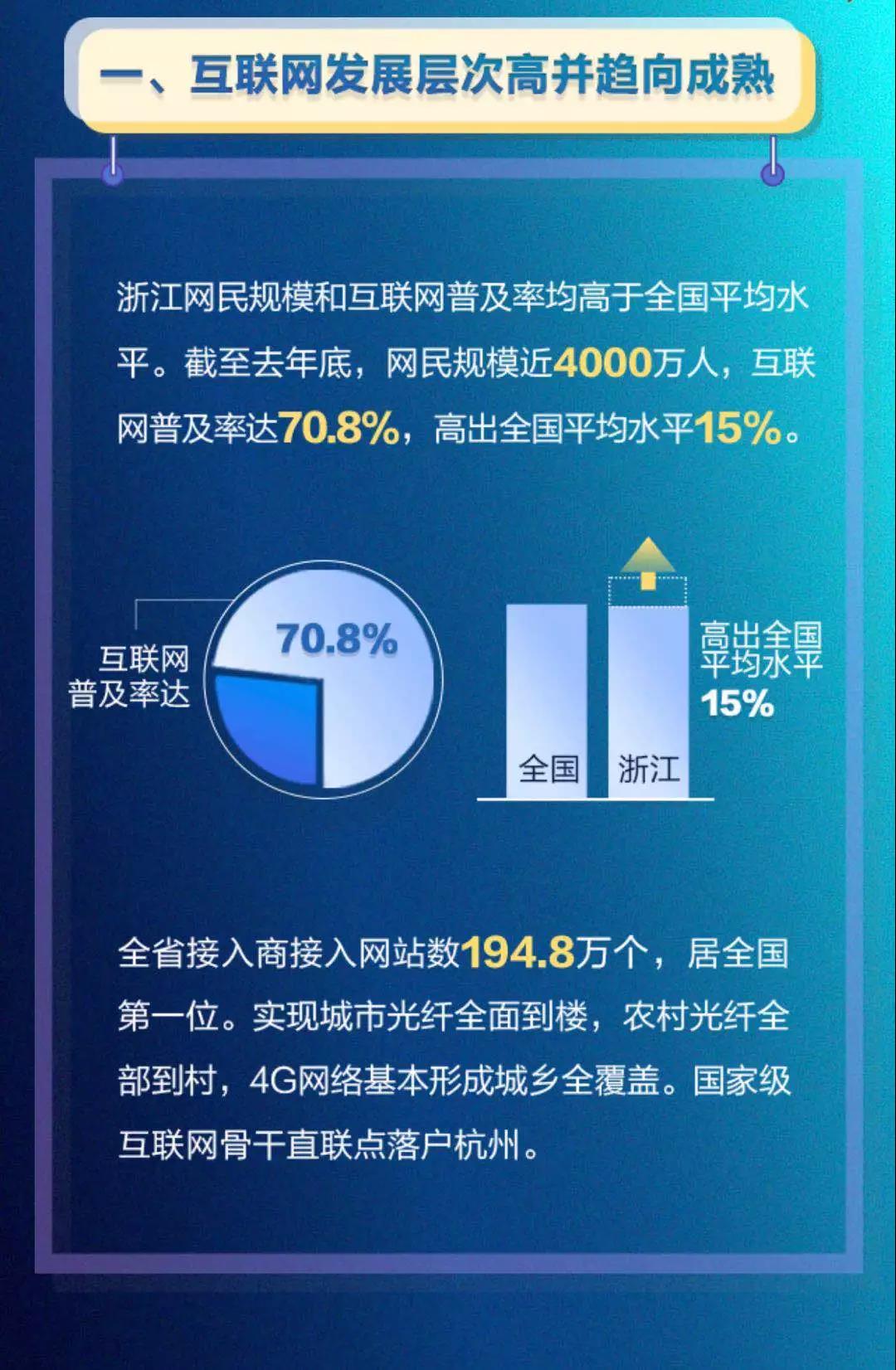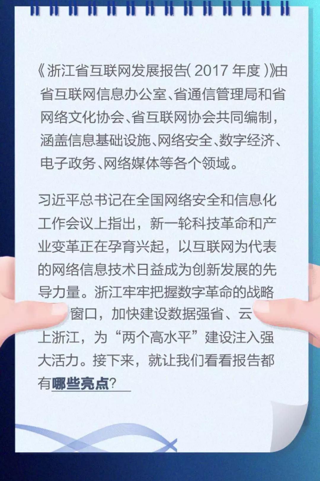 2017浙江省互联网发展报告 《报告》显示,截至2017年12月,浙江省网民规模达到3956万人,互联网普及率为70.8%,高出全国平均水平15%。其中,手机网民占全省网民总数的98.7%;杭州市网民数居各市之首,达到795.6万人。 更多阅读:2014年浙江省互联网发展报告浙江网信办:2019浙江省互联网发展报告云南省互联网协会:云南省互联网发展报告(2022)CNNIC:2013年度河北省互联网发展报告CNNIC:2011年四川省互联网发展状况统计报告中国互联网协会:2018中国互联网发展报告网宿科技:2012年Q2中国互联网发展报告网宿科技:2015年Q3中国互联网发展报告网宿科技:2013年Q3中国互联网发展报告2020浙江省互联网发展报告网宿 :2018中国互联网发展报告2018浙江省法院离婚纠纷司法大数据YouGov:全球31%的人认为会说普通话是一项重要资产银保监会:2019年中国普惠金融发展报告IDC:2022年Q3北美分销应收同比增长9.3%
