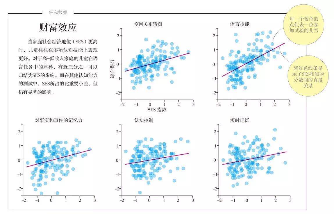 我们招募了几组家庭社会经济背景不同的孩子作为受试者,他们的年龄从学龄前到青春期不等。在试验中,他们接受了一系列认知测试,以此检测各部分大脑回路结构的完整性。我们从多次试验中得出高度一致的结论。总体来说,家庭背景较贫穷的孩子往往在语言、记忆力、自控力和专注力的测试中表现更差。