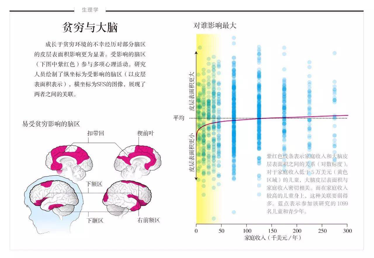 目前的研究很难直接回答这些问题。不过,圣路易斯华盛顿大学的琼•卢比(Joan Luby)团队的最新研究表明,收入差距带来的生活压力和父母教养方式的不同,可以导致儿童大脑结构出现差异。在低收入家庭中,父母给孩子的支持较少,孩子也更容易产生敌对心理,这会导致负面结果——在该项研究中,就是使得海马体更小。而我们实验室则在考察,长期的压力、亲子间语言交流的不足能否在一定程度上解释这些发现。