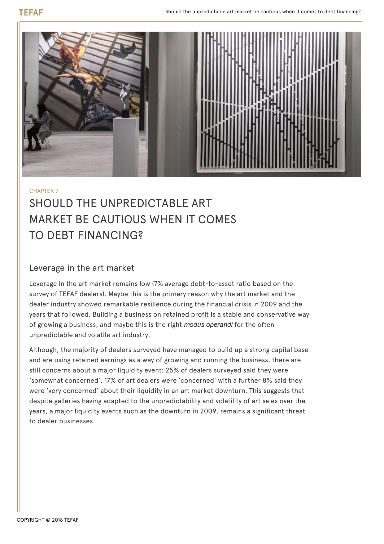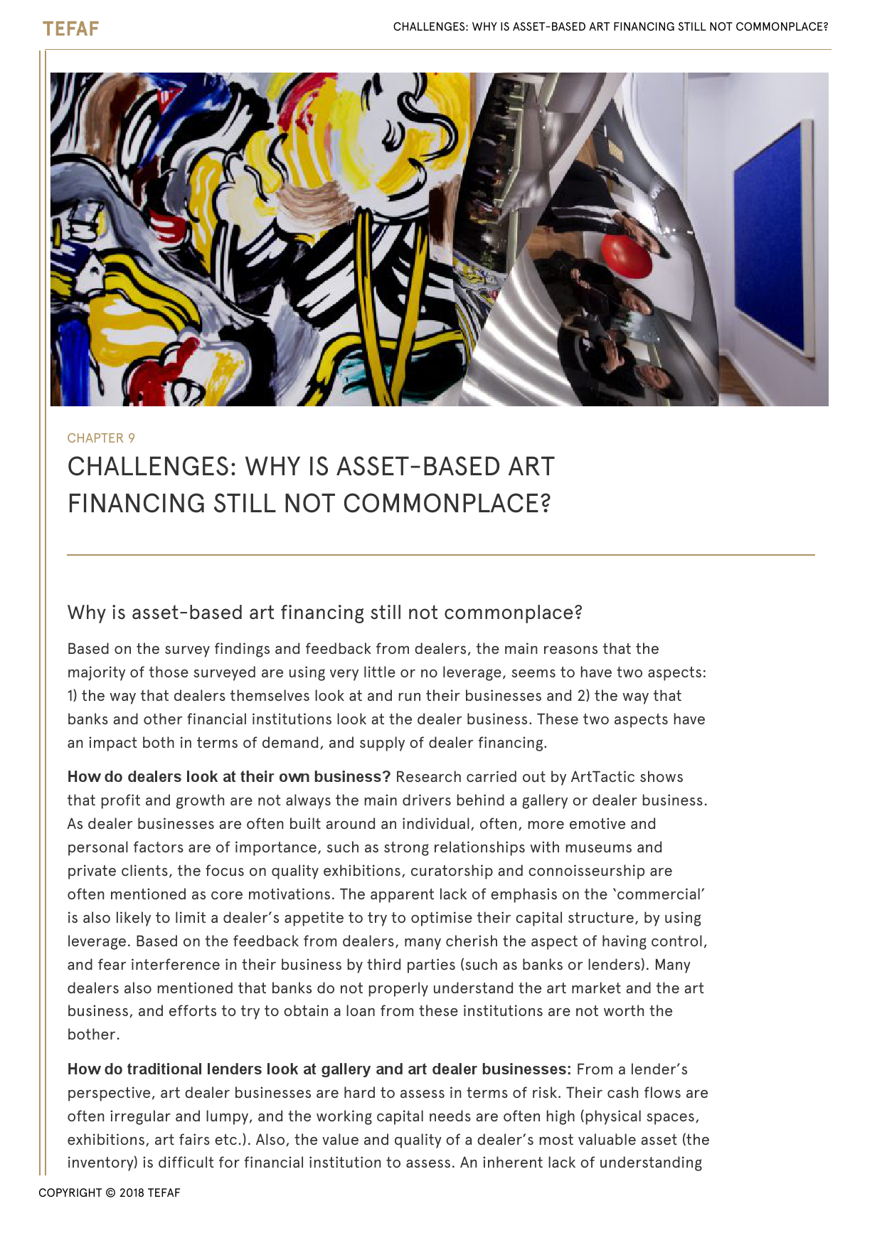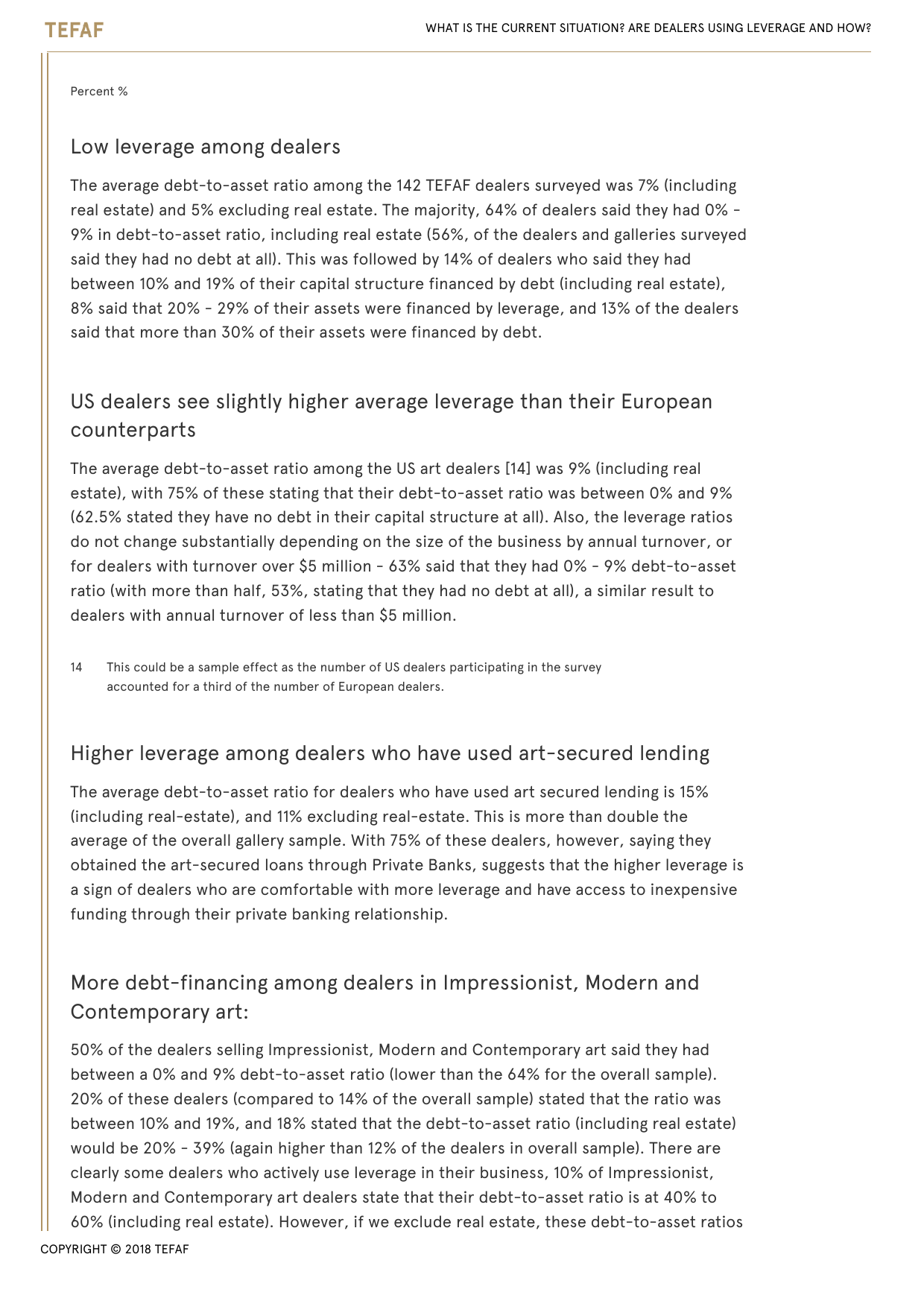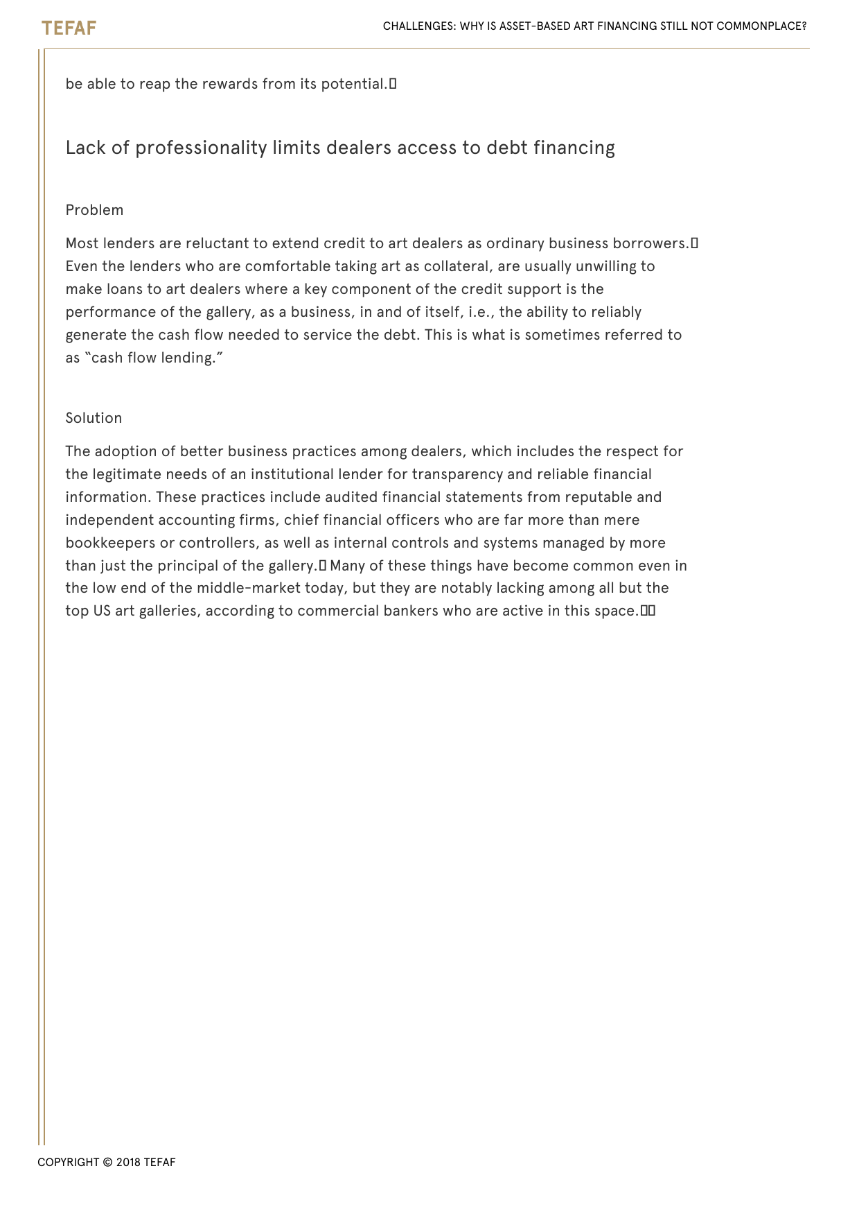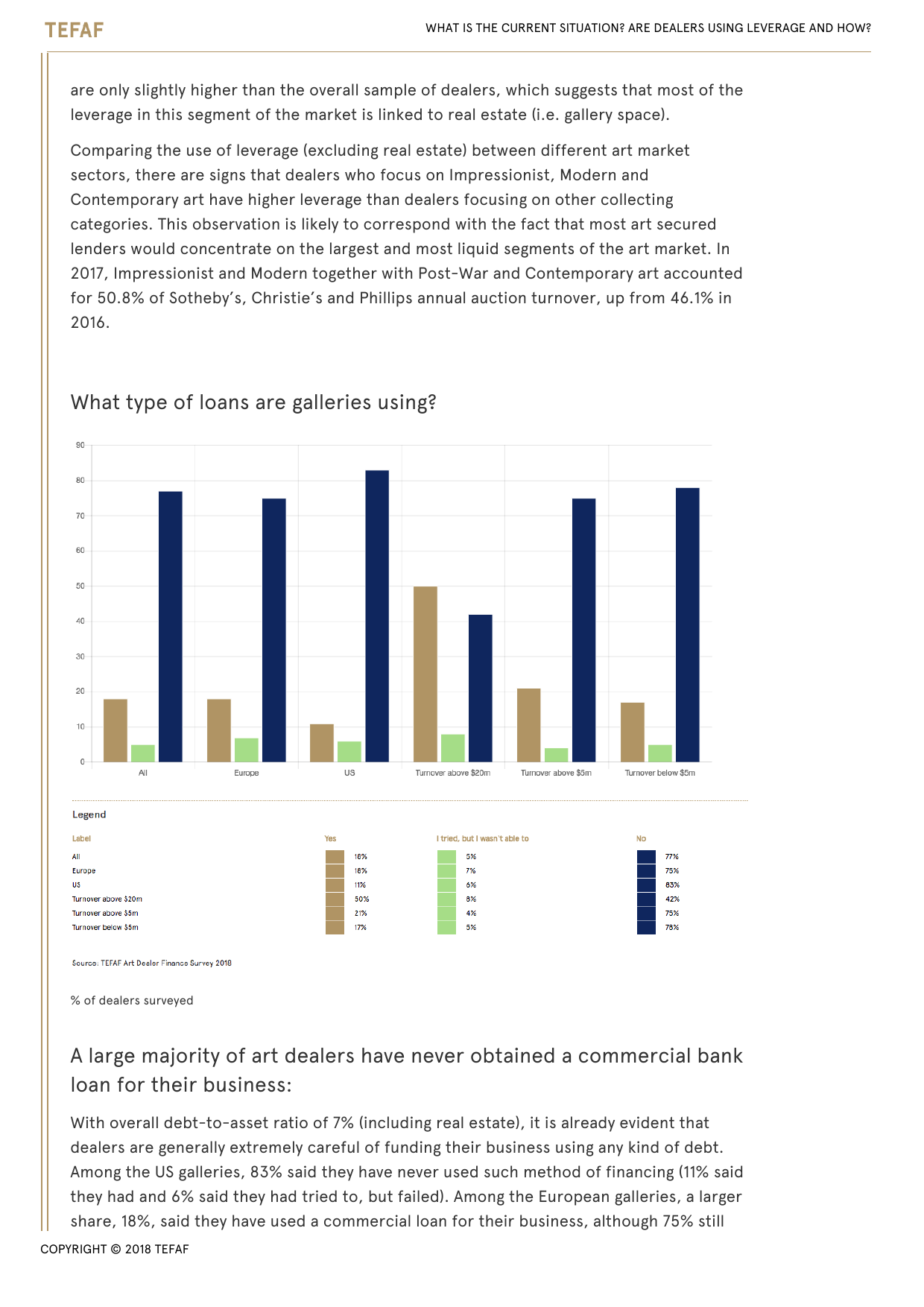 根据资料反馈,67%的艺术经纪人的资产负债率为0至10%,低杠杆是业内普遍的融资现状,与此同时也存在着存货积压和付款周期延长的现象。
