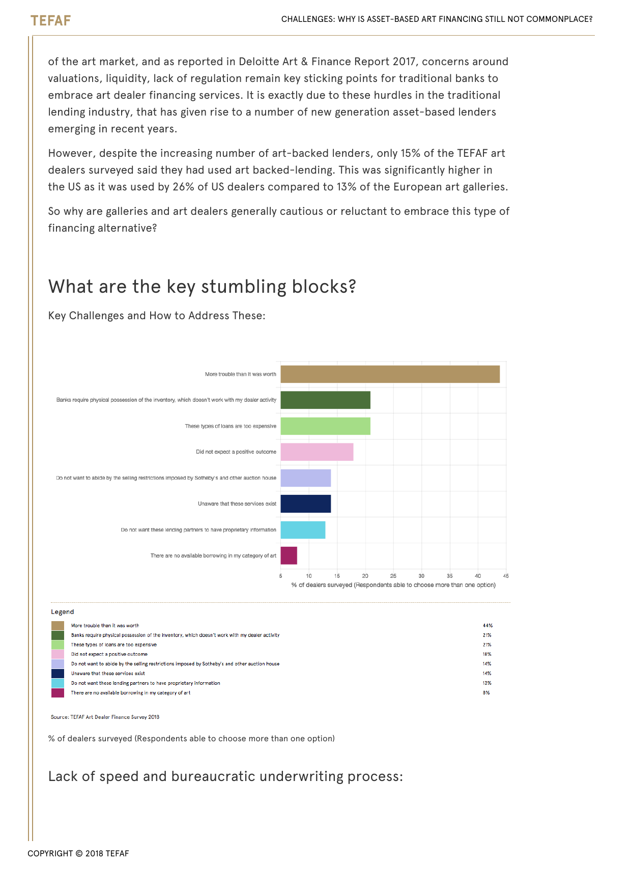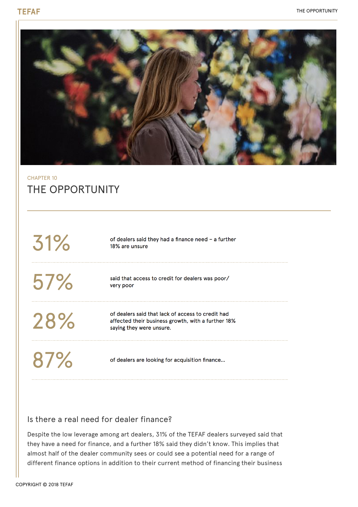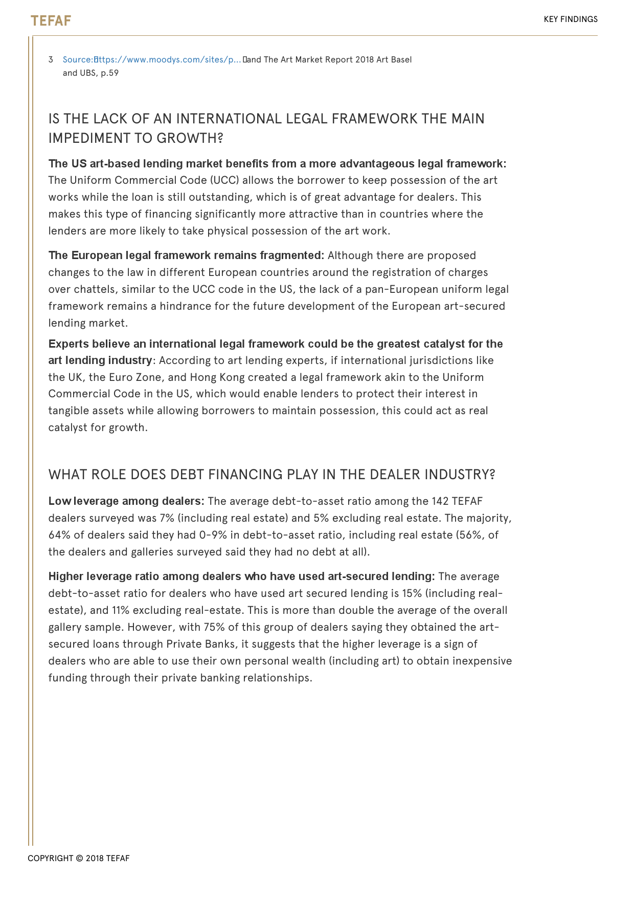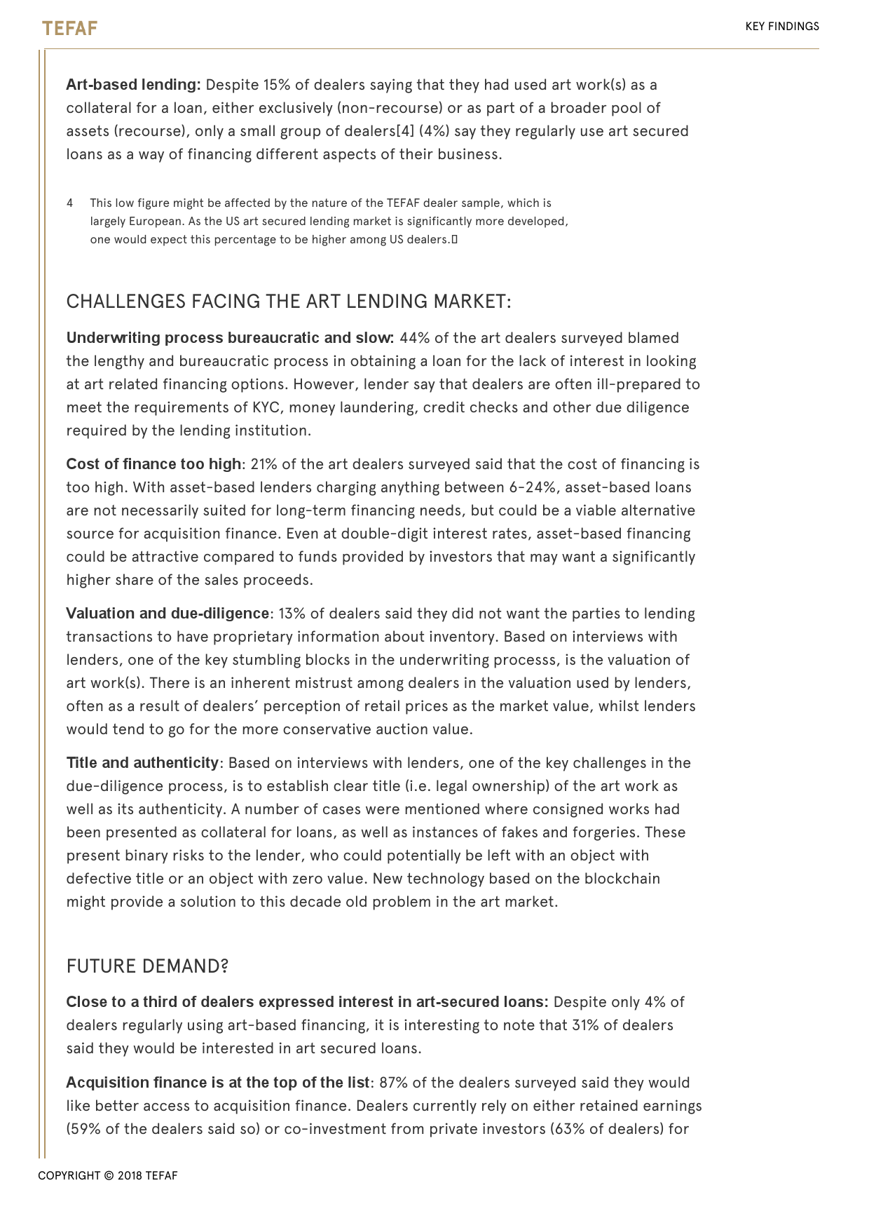 根据资料反馈,67%的艺术经纪人的资产负债率为0至10%,低杠杆是业内普遍的融资现状,与此同时也存在着存货积压和付款周期延长的现象。