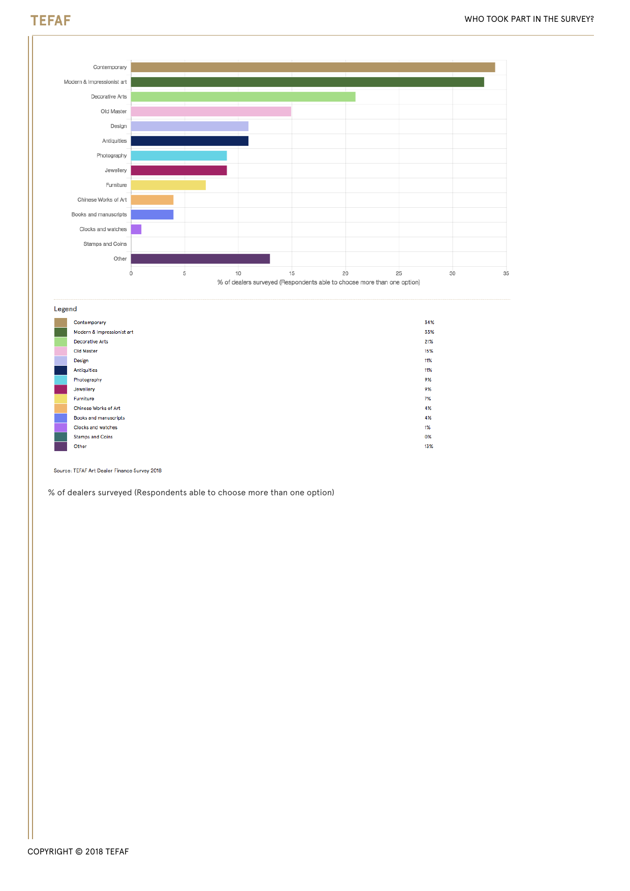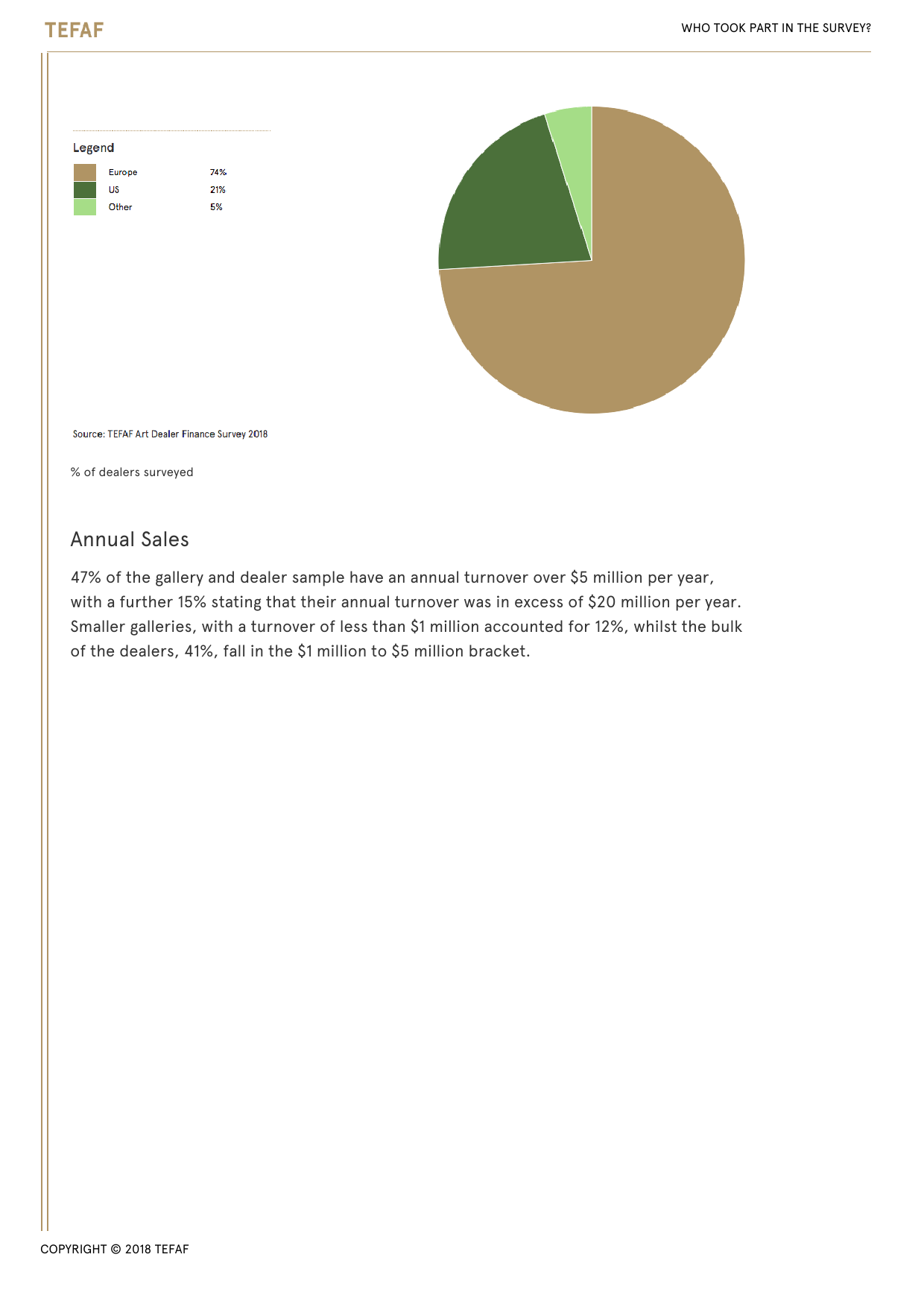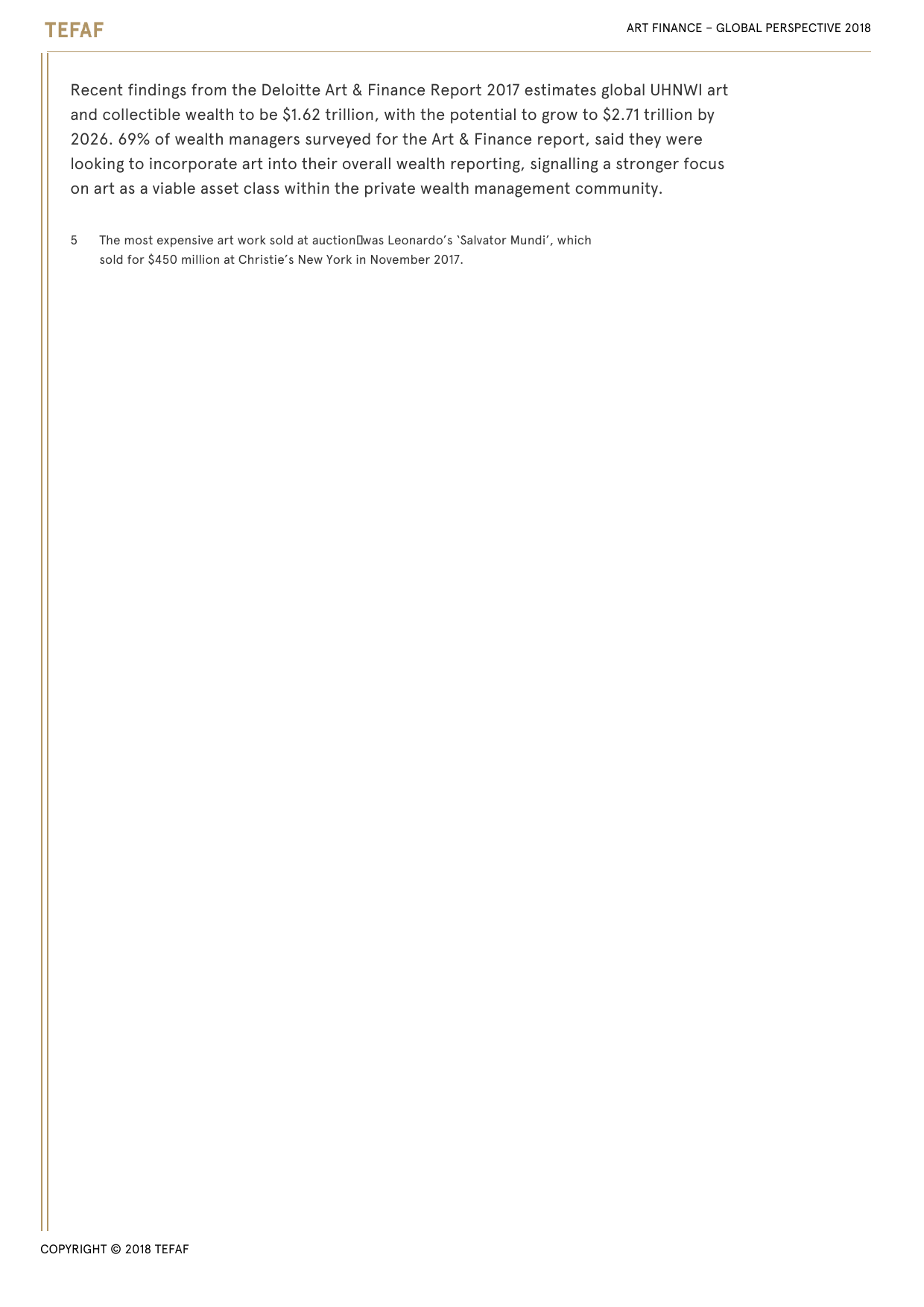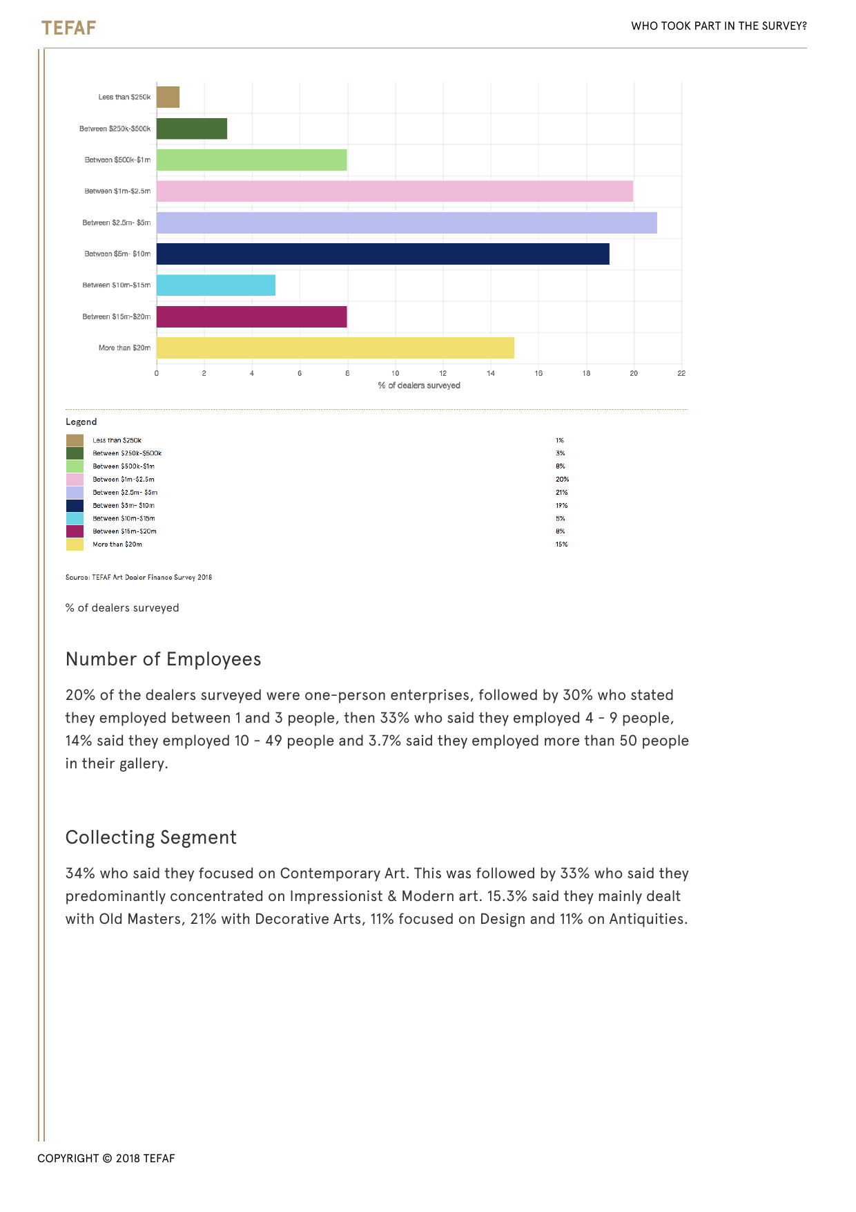 通常认为,市场行情景气时拍卖市场占比会明显增长,因为公开交易会带来更高价格的可能,这同样在2017年得到了印证:从整体成交额来看,经纪人交易份额(53%)略高于拍卖(47%),但同比出现4%的下滑,这无疑与拍品天价成交相关。