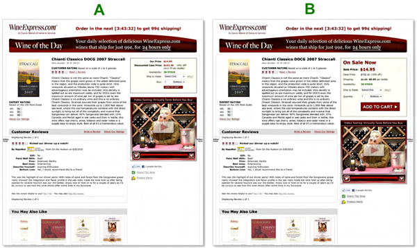 WineExpress测试在网页上方增加一个限时的订单促销活动标语:在预定时间内下单可以获得0.99美元的邮寄优惠,次活动仅在24小时内有效。