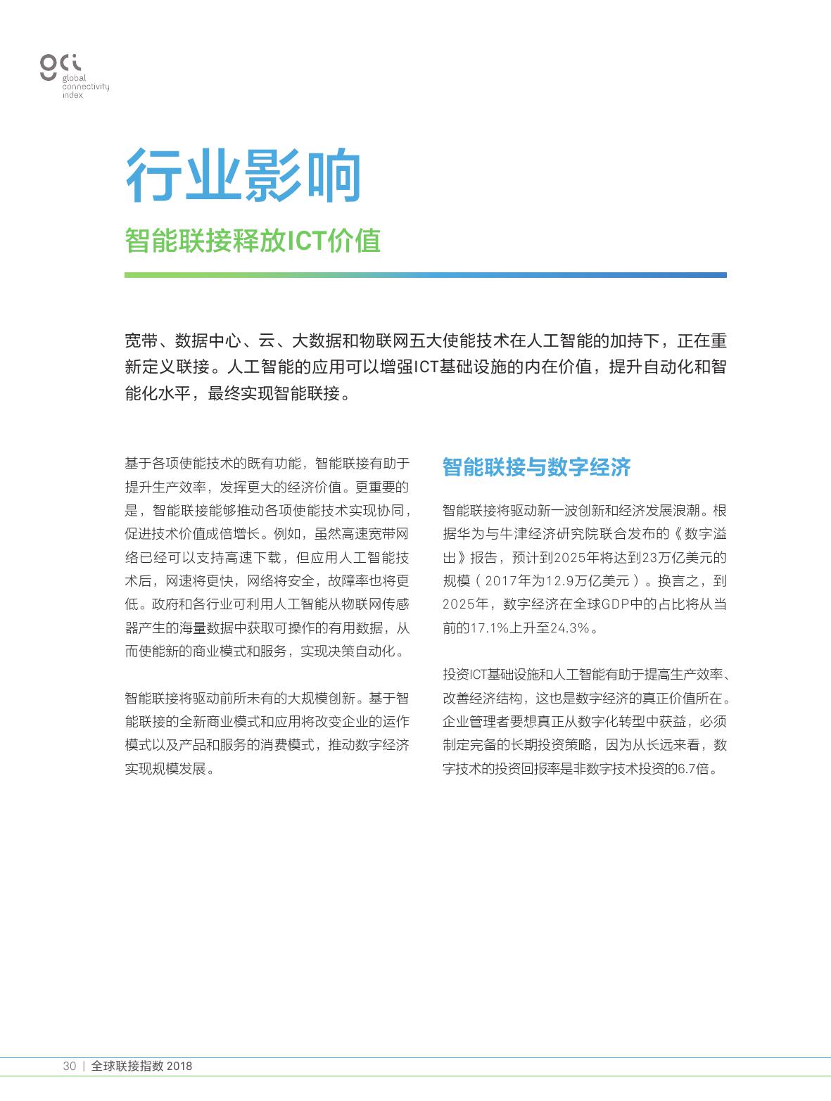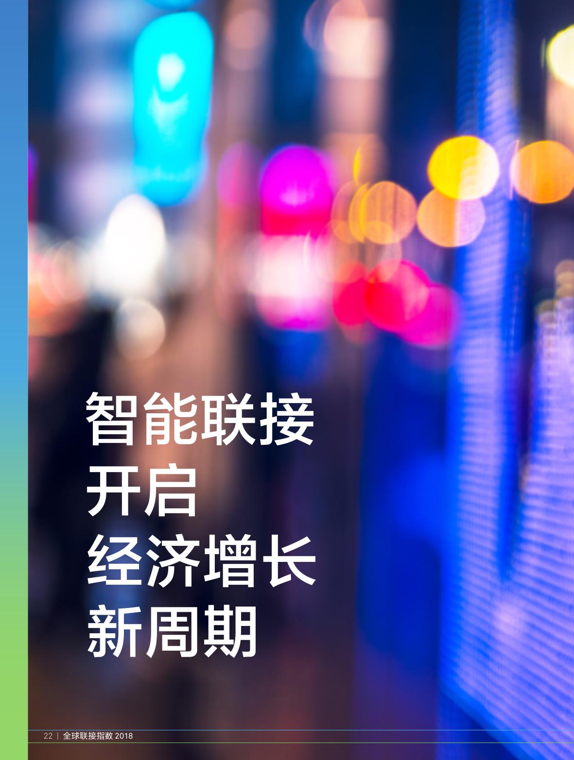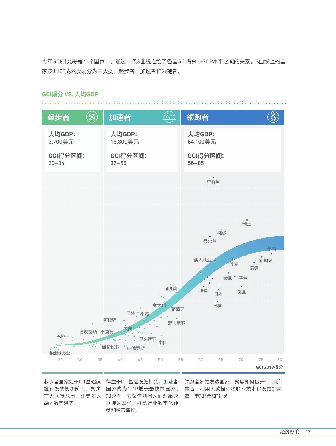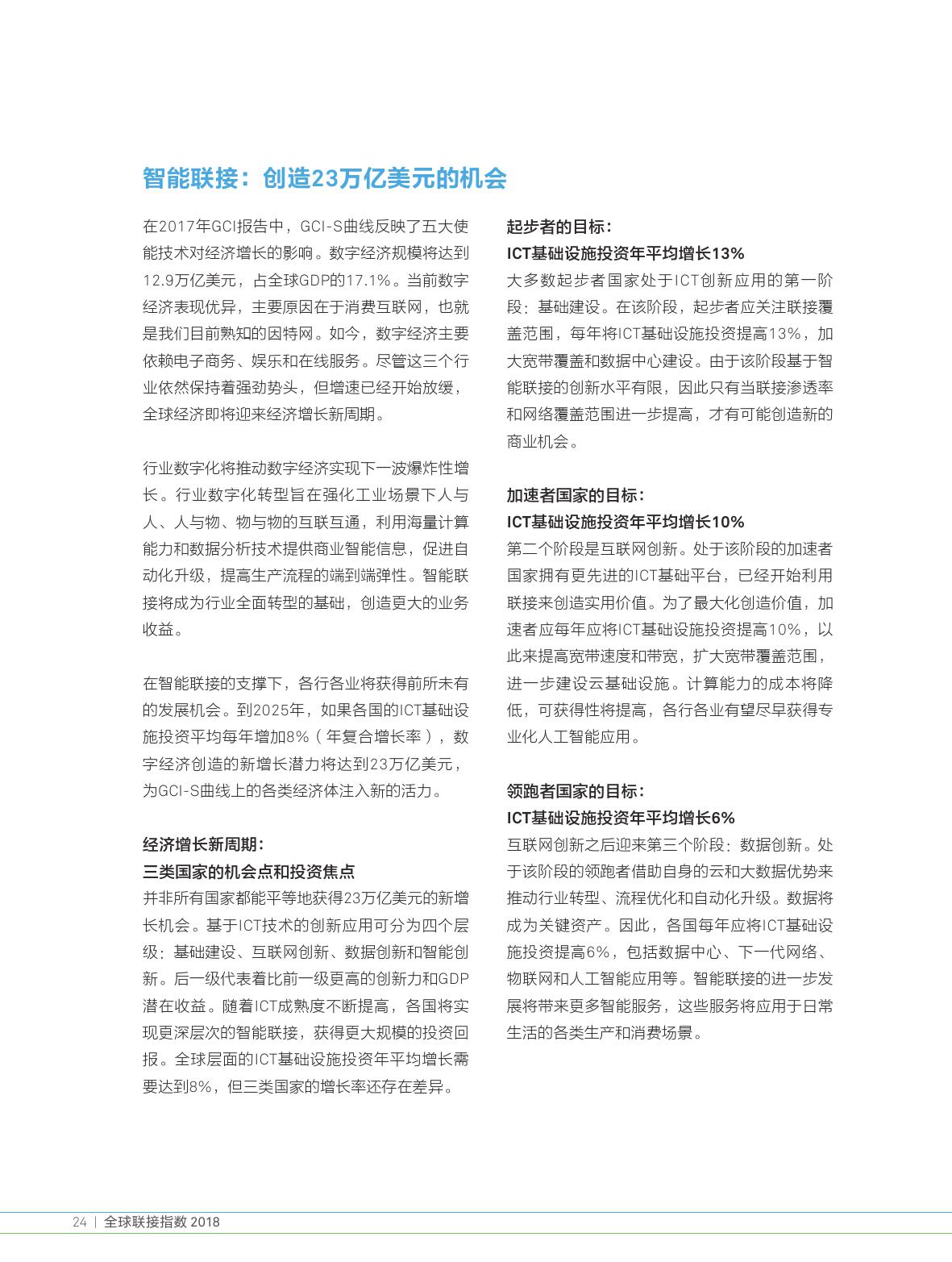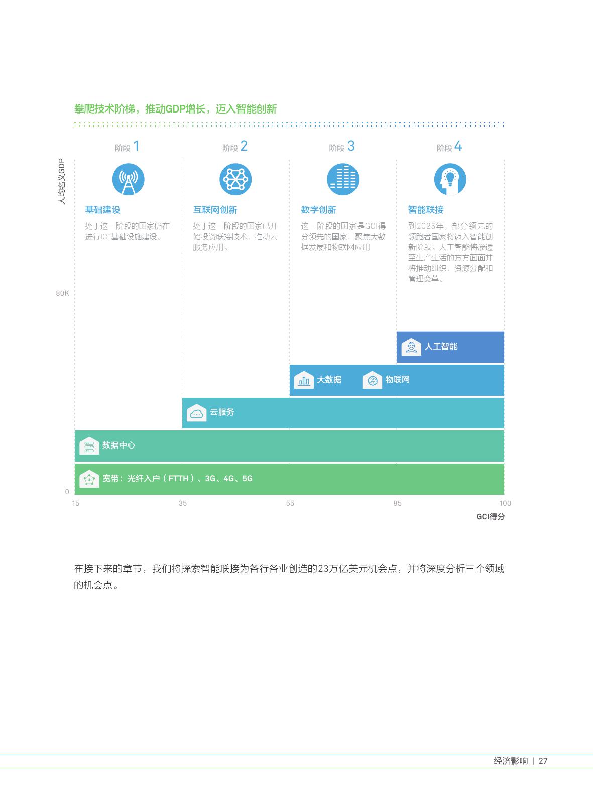 GCI 2018 研究显示,各行各业将人工智能融入宽带、数据中心、云、大数据和物联网这五大关键使能技术后,基础联接将演变为智能联接,激发创新活力,带来新一轮经济增长。消费互联网仍是当前数字经济发展的驱动因素,但随着在各行业的应用逐渐深入,智能联接将催生新的商业模式、产品、流程和服务,为GCI-S曲线上的各个国家注入新的活力,开启经济增长新周期。