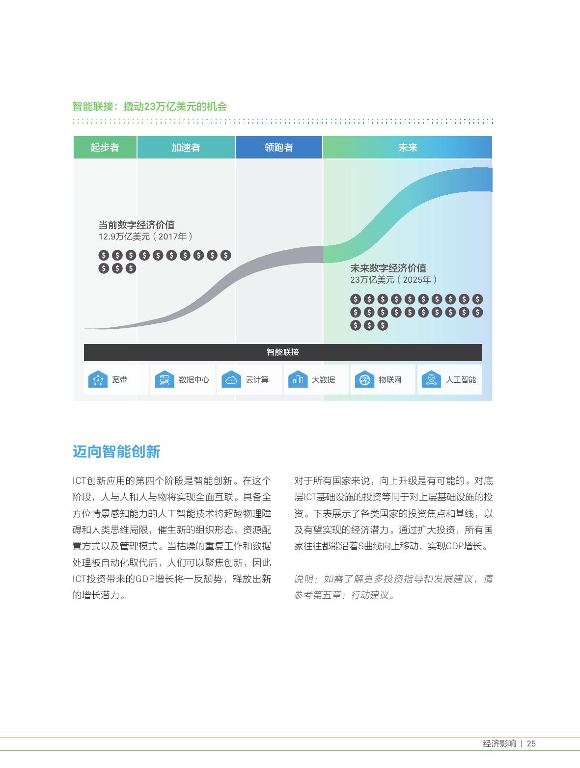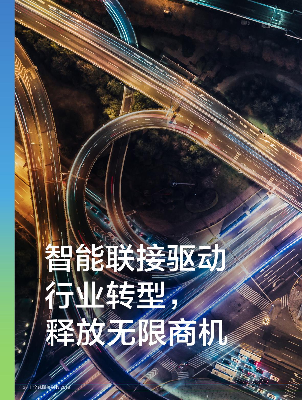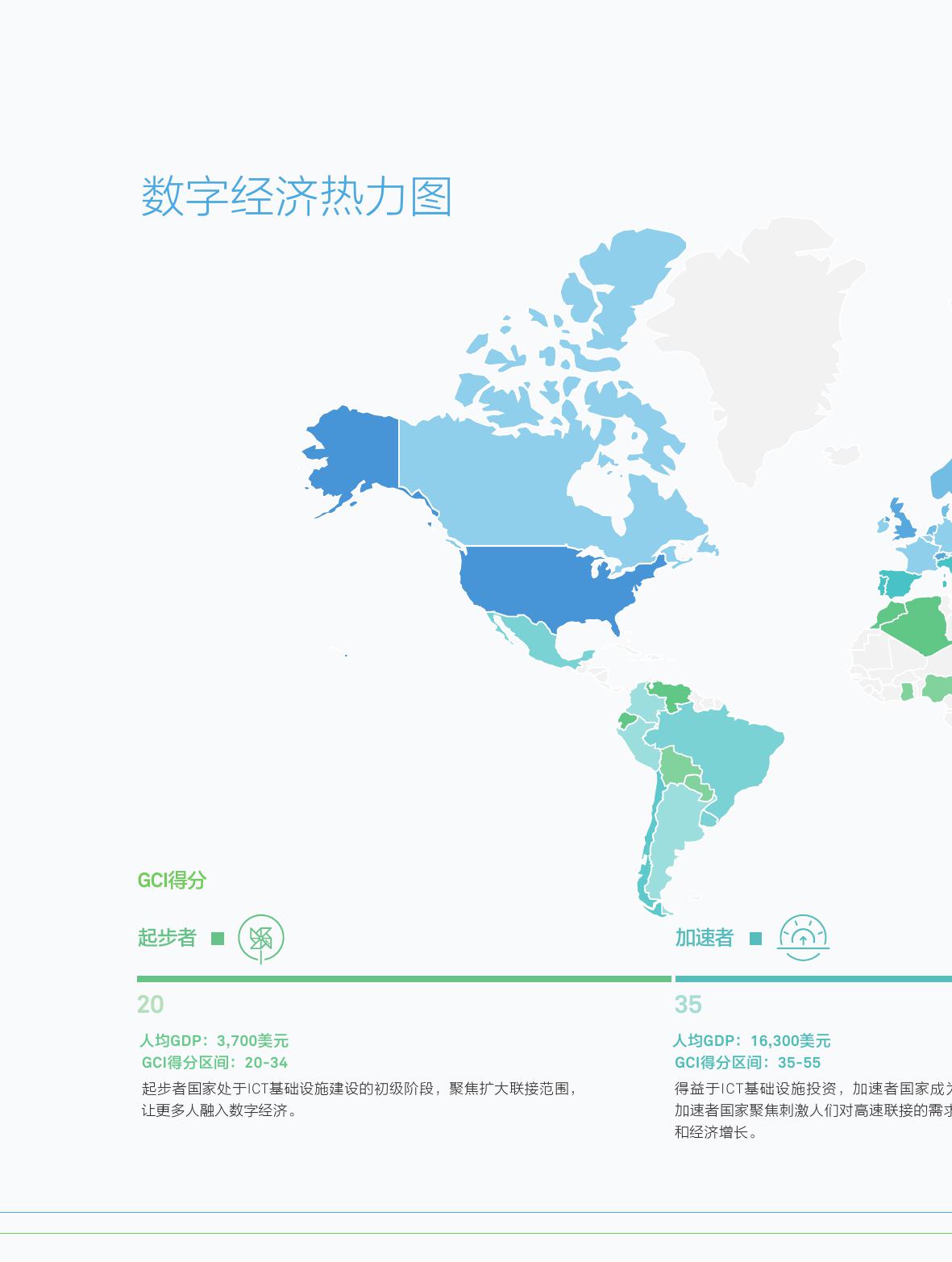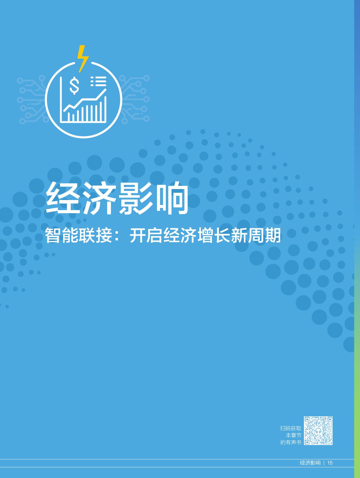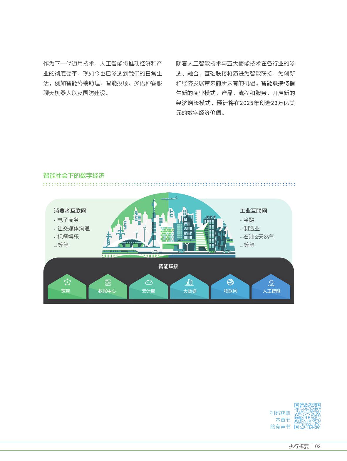 GCI 2018 研究显示,各行各业将人工智能融入宽带、数据中心、云、大数据和物联网这五大关键使能技术后,基础联接将演变为智能联接,激发创新活力,带来新一轮经济增长。消费互联网仍是当前数字经济发展的驱动因素,但随着在各行业的应用逐渐深入,智能联接将催生新的商业模式、产品、流程和服务,为GCI-S曲线上的各个国家注入新的活力,开启经济增长新周期。