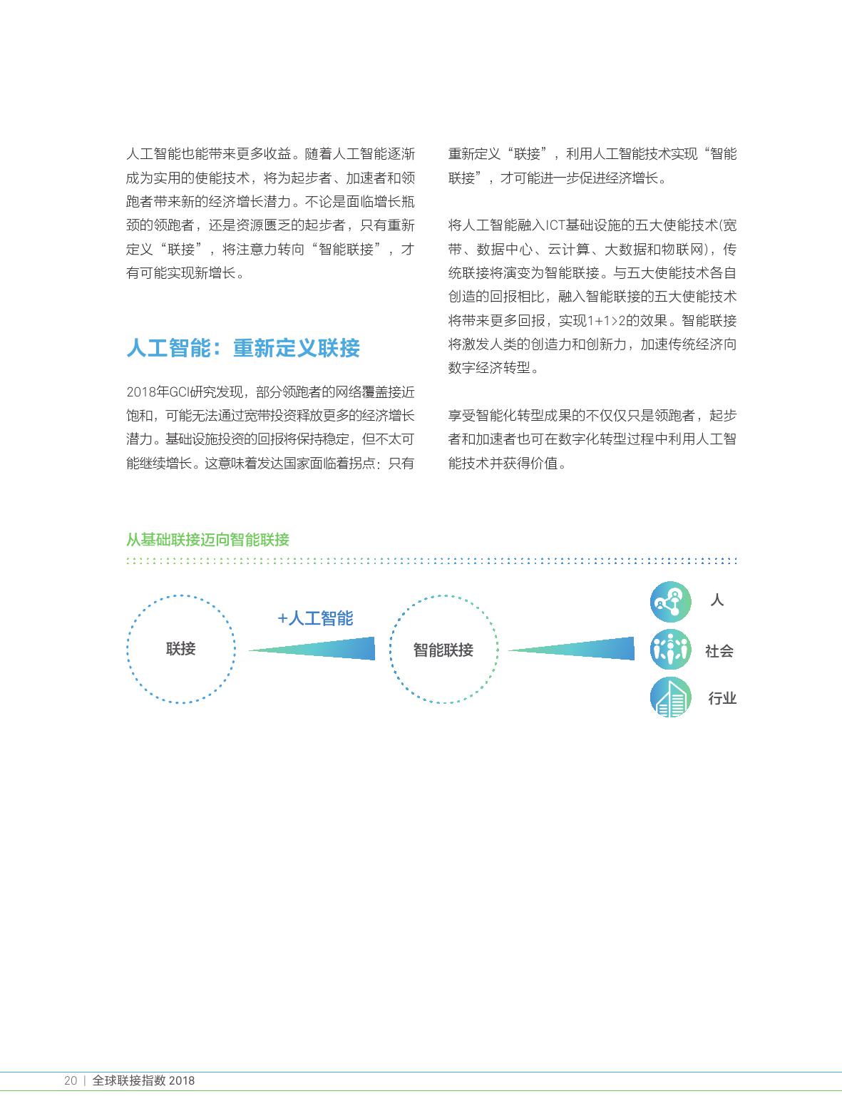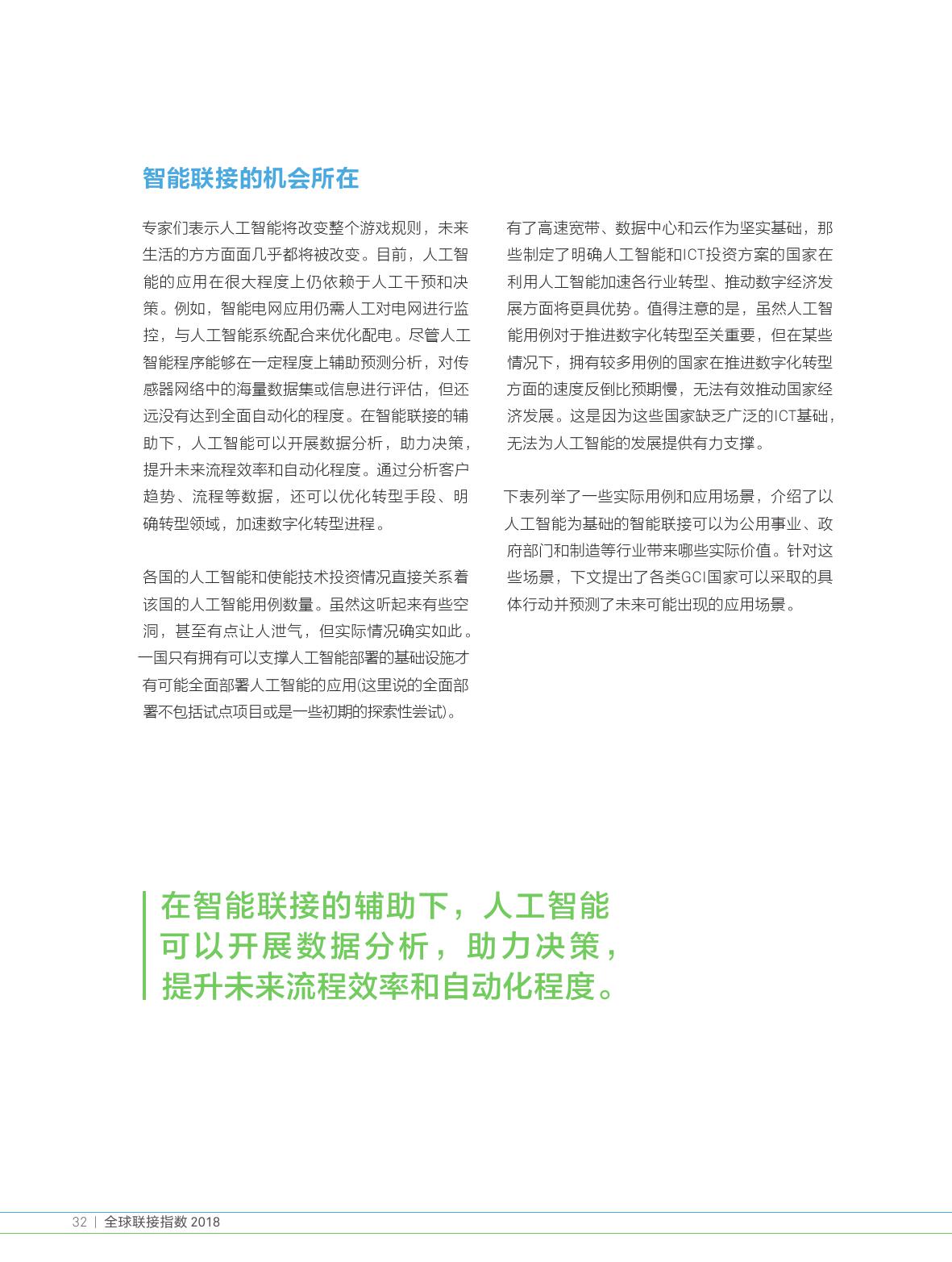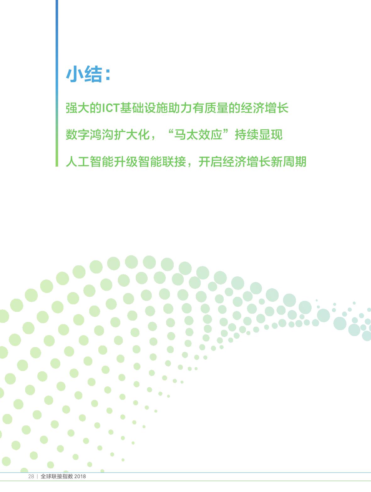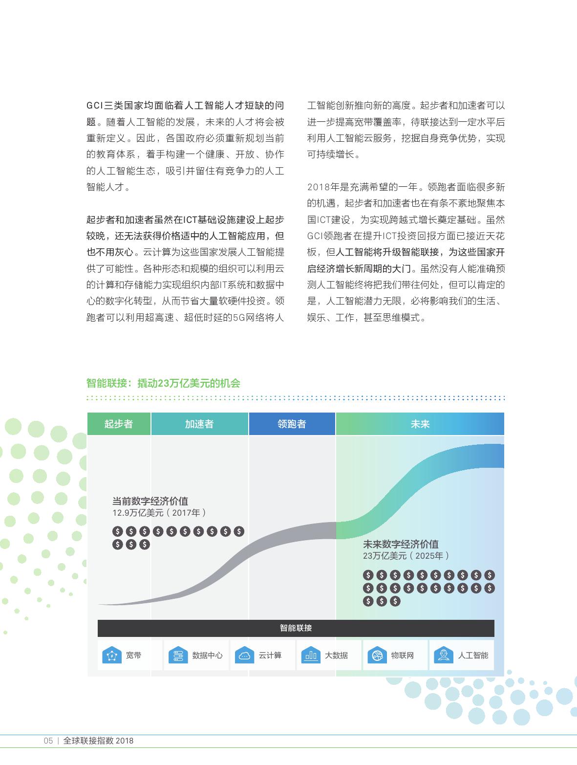 GCI 2018 研究显示,各行各业将人工智能融入宽带、数据中心、云、大数据和物联网这五大关键使能技术后,基础联接将演变为智能联接,激发创新活力,带来新一轮经济增长。消费互联网仍是当前数字经济发展的驱动因素,但随着在各行业的应用逐渐深入,智能联接将催生新的商业模式、产品、流程和服务,为GCI-S曲线上的各个国家注入新的活力,开启经济增长新周期。