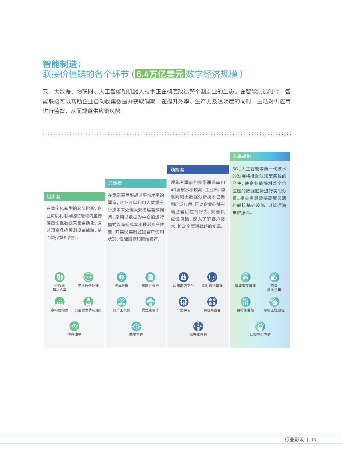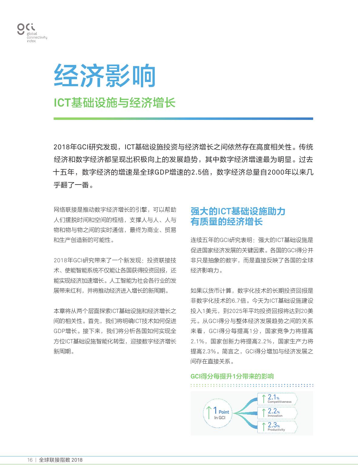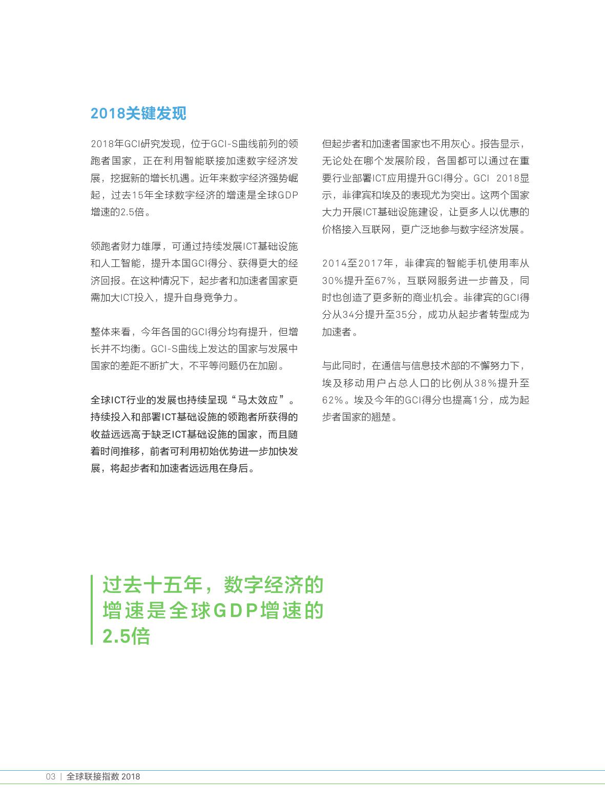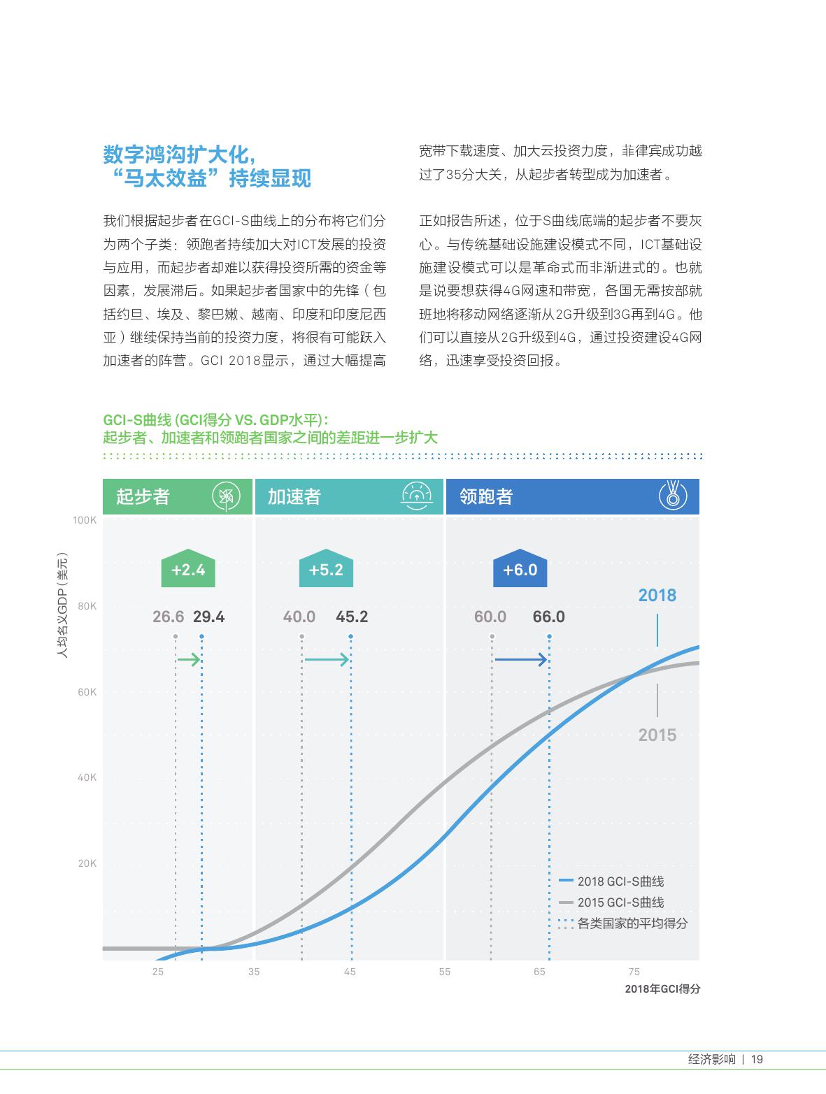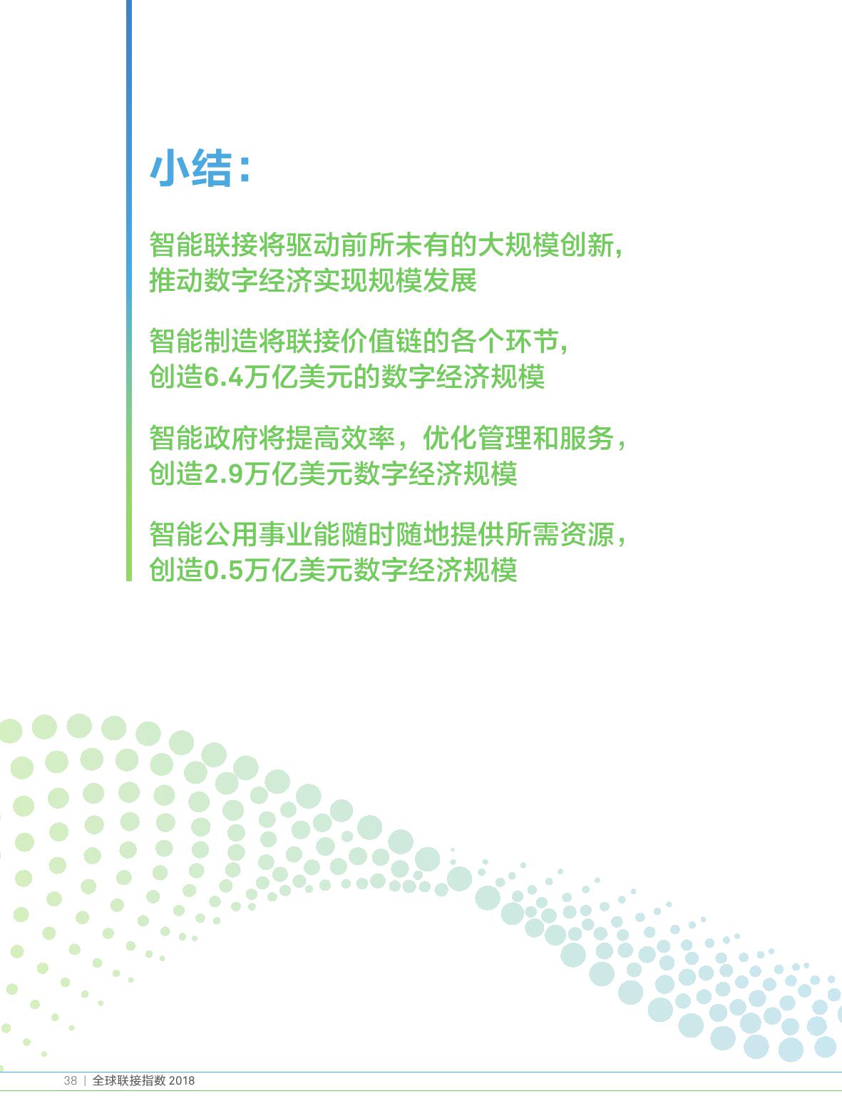 GCI 2018 研究显示,各行各业将人工智能融入宽带、数据中心、云、大数据和物联网这五大关键使能技术后,基础联接将演变为智能联接,激发创新活力,带来新一轮经济增长。消费互联网仍是当前数字经济发展的驱动因素,但随着在各行业的应用逐渐深入,智能联接将催生新的商业模式、产品、流程和服务,为GCI-S曲线上的各个国家注入新的活力,开启经济增长新周期。