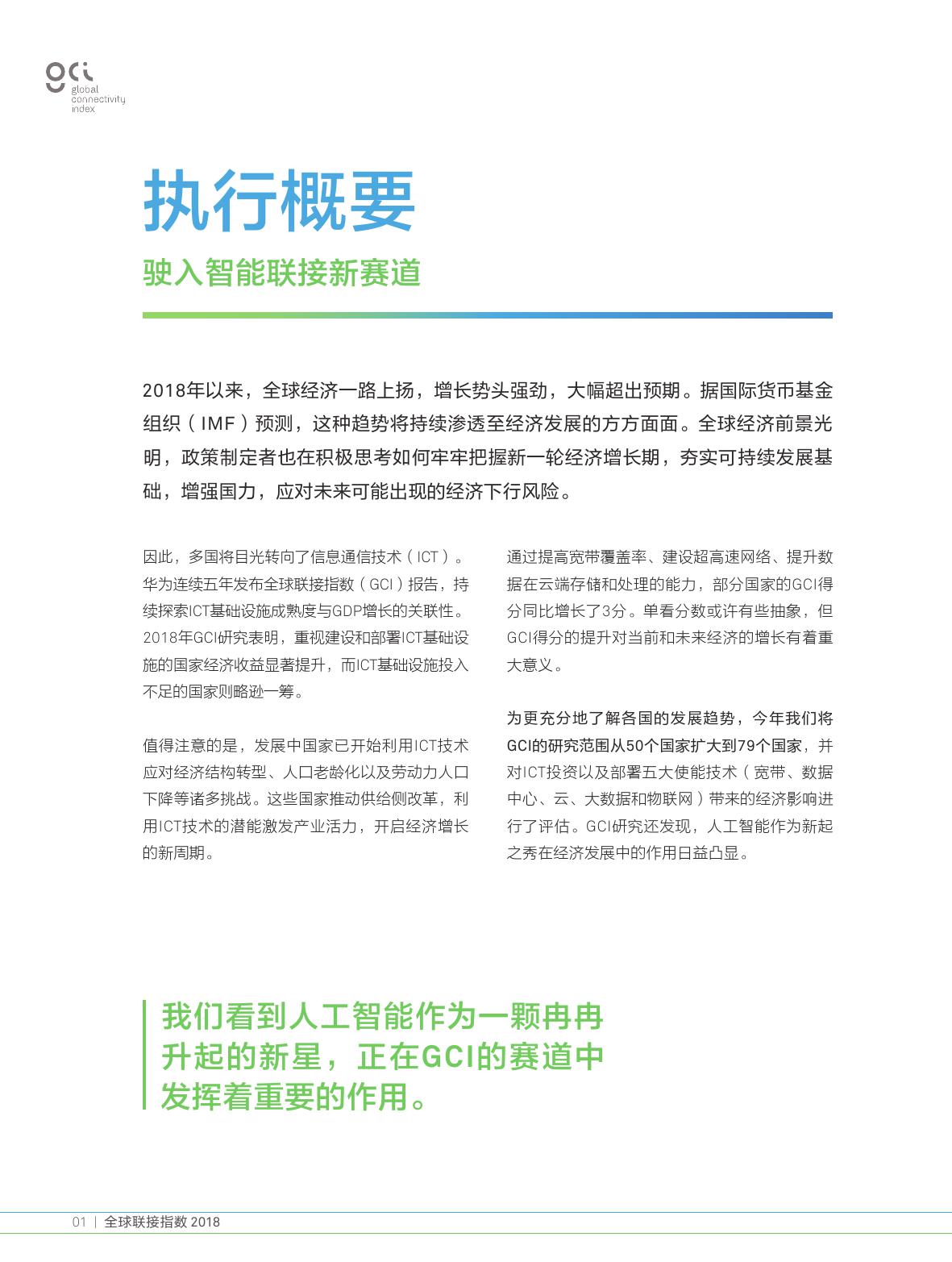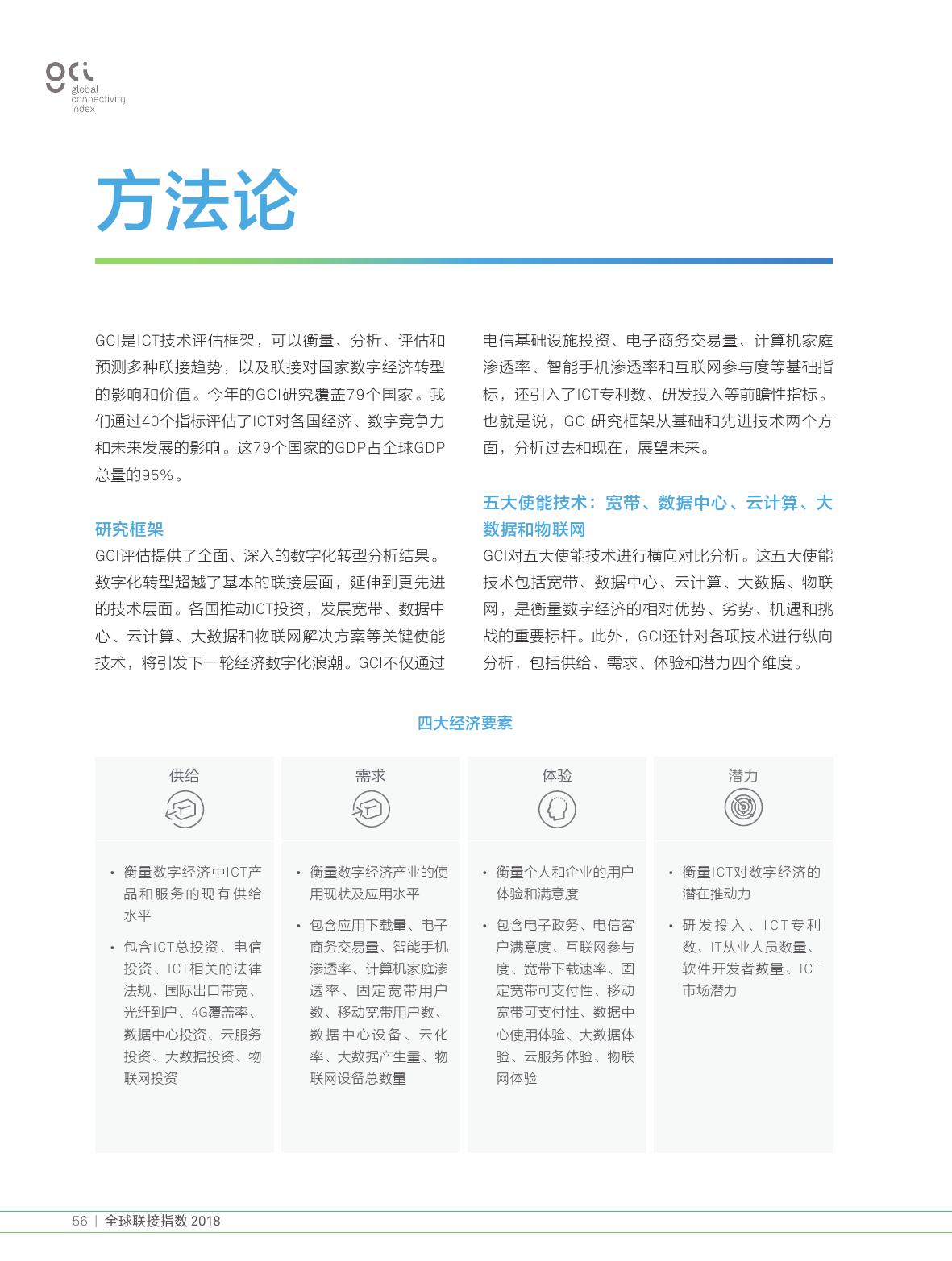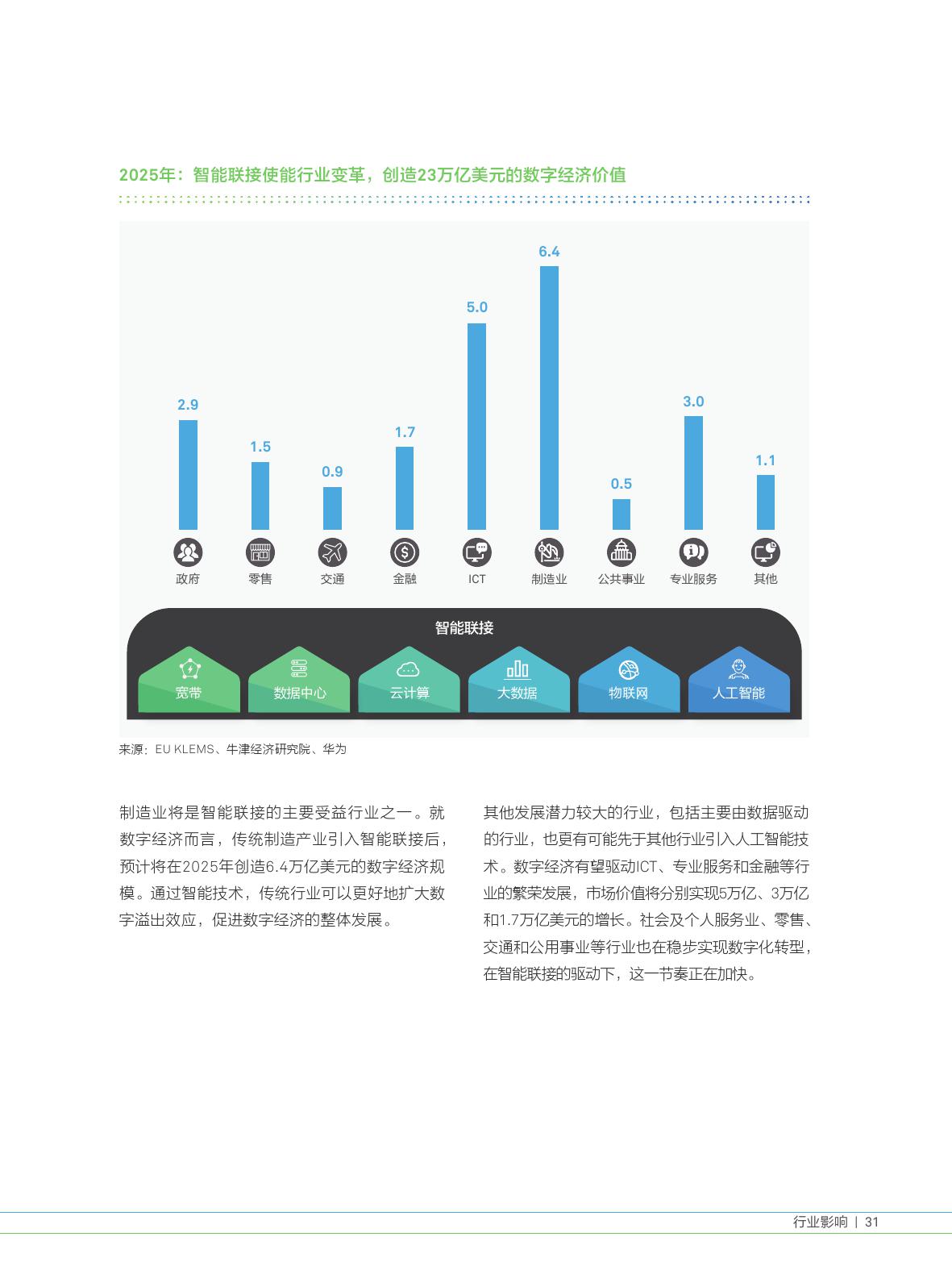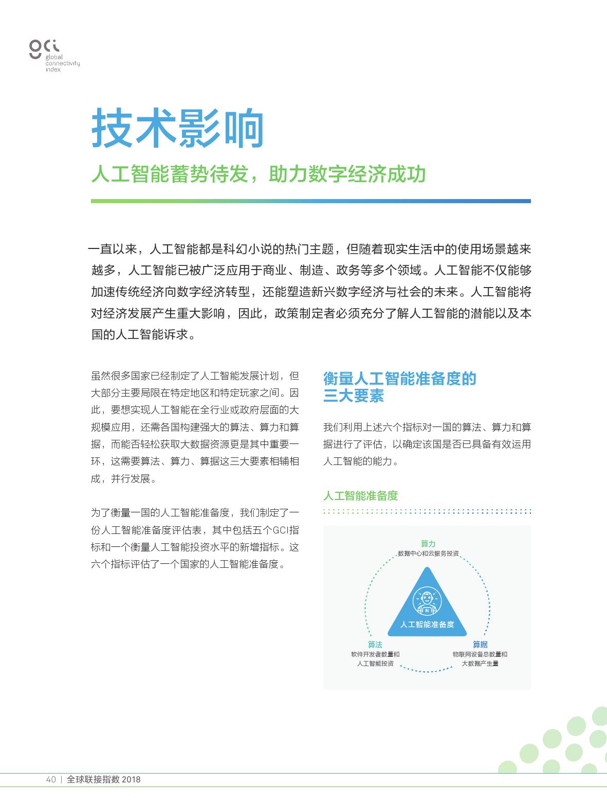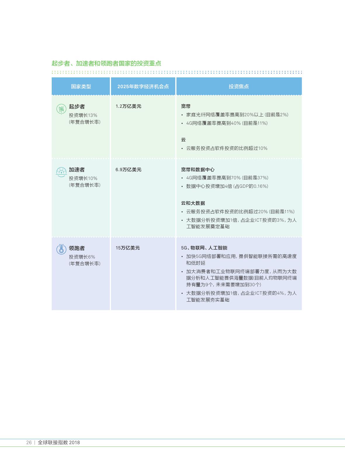 GCI 2018 研究显示,各行各业将人工智能融入宽带、数据中心、云、大数据和物联网这五大关键使能技术后,基础联接将演变为智能联接,激发创新活力,带来新一轮经济增长。消费互联网仍是当前数字经济发展的驱动因素,但随着在各行业的应用逐渐深入,智能联接将催生新的商业模式、产品、流程和服务,为GCI-S曲线上的各个国家注入新的活力,开启经济增长新周期。