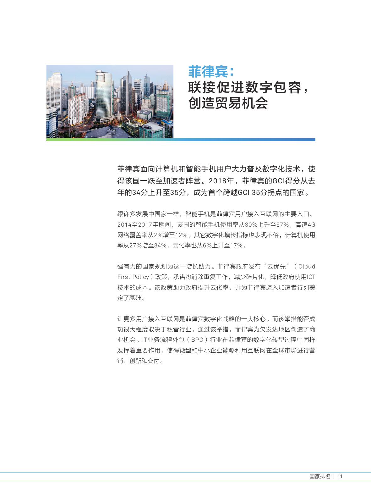 研究还表明,当一个国家的GCI得分达到35分,ICT基础设施的投资回报将出现倍增效应。菲律宾的表现尤为突出。2014年至2017年,菲律宾的智能手机使用率显著提升,互联网基础服务进一步普及,创造了新的商业机会。菲律宾的GCI得分从34分提升至35分,成功从起步者转型成为加速者国家。