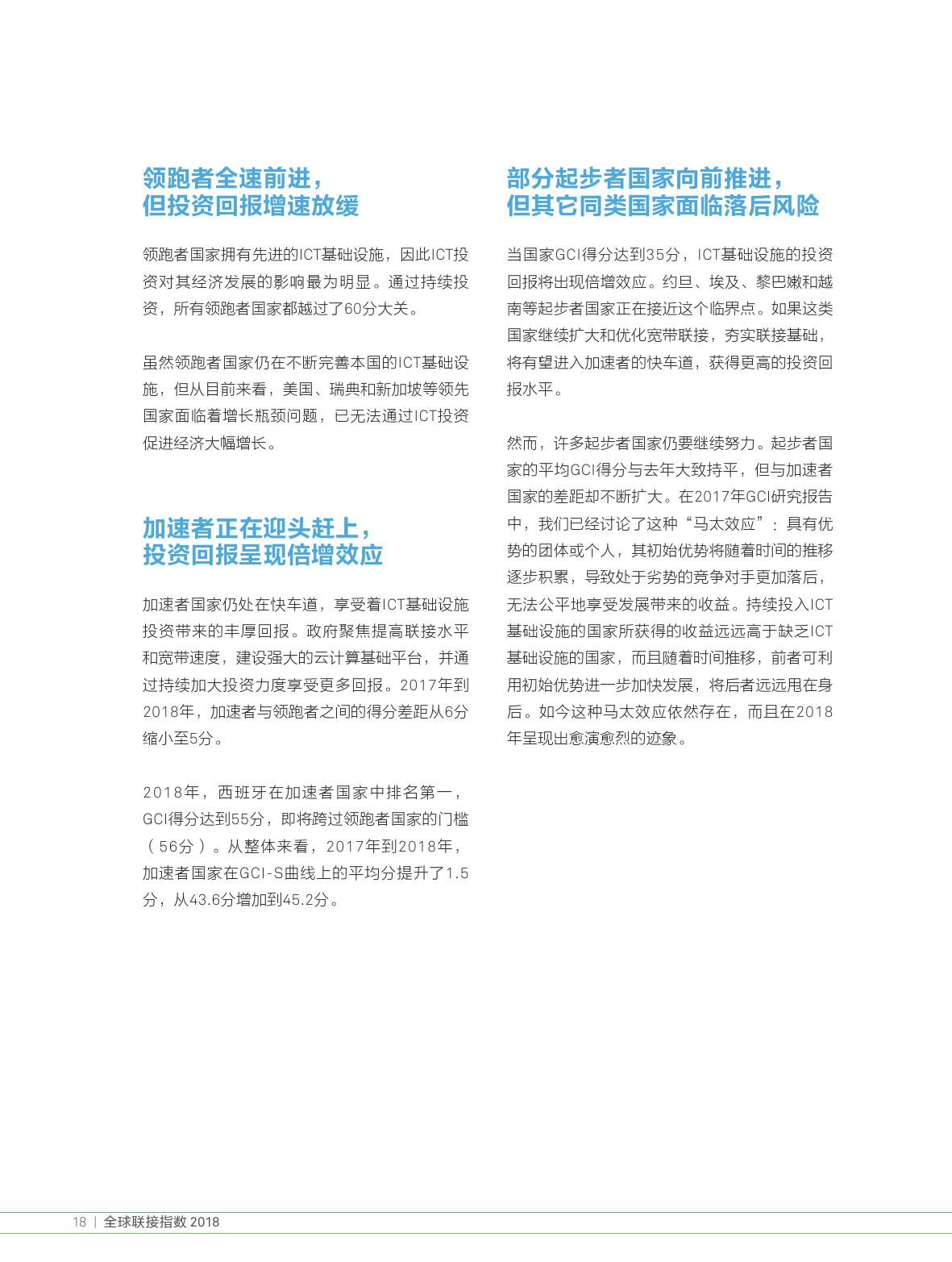 自开展GCI研究以来,各国得分在今年呈现普遍提升,但增长并不均衡。GCI 2017研究中就已经发现这种不均衡性并将其称为“马太效应”:ICT基础设施完善的国家所获得的收益远远高于ICT基础设施缺乏的国家,GCI 2018报告中显示数字鸿沟仍在加剧,但如果持续加大投入和部署ICT基础设施,将为加速者和起步者创造跳跃式发展的可能性。