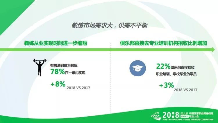 在健身教练职业持续升温的情况下,行业的发展对专业人才产生了巨大的需求。突出表现在以下两个方面:一是,教练从业预期与实现时间进一步缩短,从有想法当教练到成为教练的时间在一年之内的,占到78%,比去年增长了8%,二是,俱乐部直接去培训机构招收学员的比例比去年增加了3%,健身行业人才的需求十分旺盛。