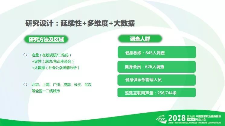本次调查除了延续以往的定性和定量调查之外,加入了大数据的调研方法,在更大的范围内,广泛深入获取研究信息。调研范围主要覆盖北京、上海、广州、成都、长沙、武汉等全国30多个城市,通过在线调研、二维码等定量研究基础上,同时结合面对面深访、焦点座谈会的定性研究方法,共完成健身会员、健身教练、俱乐部管理人员共计1277个样本, 以及256,744条互联网数据地采集。