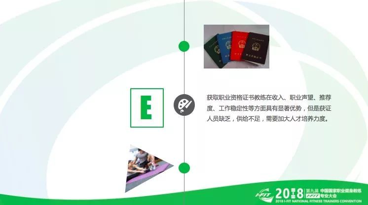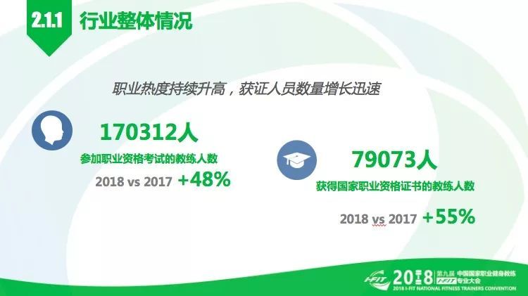 一、健身教练这一职业热度持续升高。截止到2018年4月30日,报考健身教练国家职业技能鉴定的人数已超过17万人,比去年同期增加48%,持有国家职业资格证书的健身教练数量达到79073人,相比去年同期增长了55%,折射出健身市场对人才的内生需求强劲。