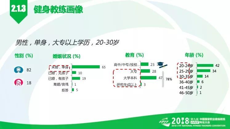 三、健身教练画像:以男性为主,占82%,65%的人处于单身未婚状态,年龄集中在20-30岁,78%的人接受过大专以上的教育。简而言之,健身教练是一群形象阳光、充满自信的优秀青年。