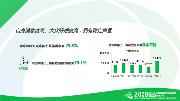 健身教练具有较高的职业声望。从社交媒体的大数据分析看,大众对健身行业的好感度也较高,达到79.1,以正面评价为主,同时,大众也愿意在社交媒体上讨论与健身相关的热门话题,关于健身教练声量处于稳中有升的状态。