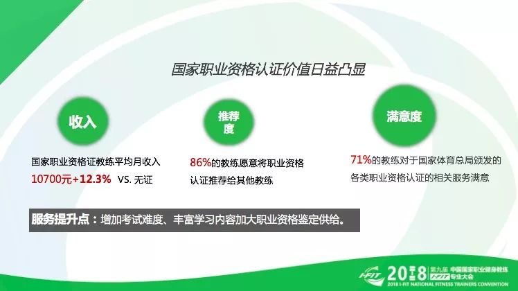 行业的快速发展一方面给我们提供了更多的机会,另一方面也对专业性提出了更高的要求,在这样的背景下可以看到,国家职业资格证书的价值日益凸显。从收入上看,拥有国家职业资格证书的教练收入比没有证书的教练平均高出12.3%。86%的国家职业资格健身教练表示愿意向同行推荐这一认证,国家职业资格健身教练对认证服务的满意度也达到71%。可以看出,国家职业资格证书在行业的价值越来越受到认可和重视。