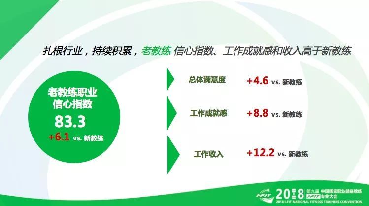 第二:健身教练职业信心指数略有下降,主要原因在于工作压力与工作环境,但老教练工作信心指数增强,在工作满意度,收入,职业预期等优于新教练。